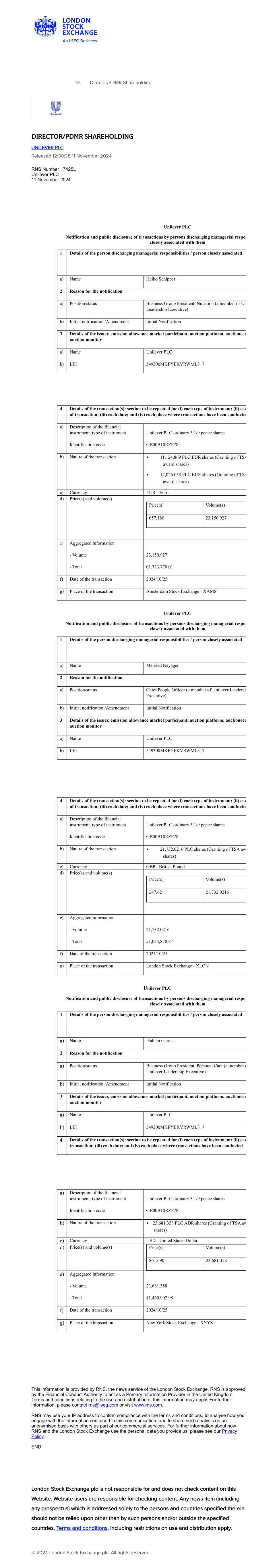 RNS Director/PDMR Shareholding DIRECTOR/PDMR SHAREHOLDING UNILEVER PLC Released 12:30:38 11 November 2024 RNS Number : 7425L Unilever PLC 11 November 2024 Unilever PLC Notification and public disclosure of transactions by persons discharging managerial respon closely associated with them 1 Details of the person discharging managerial responsibilities / person closely associated a) Name Heiko Schipper 2 Reason for the notification a) Position/status Business Group President, Nutrition (a member of Un Leadership Executive) b) Initial notification /Amendment Initial Notification 3 Details of the issuer, emission allowance market participant, auction platform, auctioneer auction monitor a) Name Unilever PLC b) LEI 549300MKFYEKVRWML317 4 Details of the transaction(s): section to be repeated for (i) each type of instrument; (ii) eac of transaction; (iii) each date; and (iv) each place where transactions have been conducted a) Description of the financial instrument, type of instrument Identification code Unilever PLC ordinary 3 1/9 pence shares GB00B10RZP78 b) Nature of the transaction • 11,124.869 PLC EUR shares (Granting of TSA award shares) • 12,026.058 PLC EUR shares (Granting of TSA award shares) c) Currency EUR - Euro d) Price(s) and volume(s) Price(s) Volume(s) €57.180 23,150.927 e) Aggregated information - Volume - Total 23,150.927 €1,323,770.01 f) Date of the transaction 2024/10/25 g) Place of the transaction Amsterdam Stock Exchange - XAMS Unilever PLC Notification and public disclosure of transactions by persons discharging managerial respon closely associated with them 1 Details of the person discharging managerial responsibilities / person closely associated a) Name Mairéad Nayager 2 Reason for the notification a) Position/status Chief People Officer (a member of Unilever Leadersh Executive) b) Initial notification /Amendment Initial Notification 3 Details of the issuer, emission allowance market participant, auction platform, auctioneer auction monitor a) Name Unilever PLC b) LEI 549300MKFYEKVRWML317 4 Details of the transaction(s): section to be repeated for (i) each type of instrument; (ii) eac of transaction; (iii) each date; and (iv) each place where transactions have been conducted a) Description of the financial instrument, type of instrument Identification code Unilever PLC ordinary 3 1/9 pence shares GB00B10RZP78 b) Nature of the transaction • 21,732.0216 PLC shares (Granting of TSA aw shares) c) Currency GBP - British Pound d) Price(s) and volume(s) Price(s) Volume(s) £47.62 21,732.0216 e) Aggregated information - Volume - Total 21,732.0216 £1,034,878.87 f) Date of the transaction 2024/10/25 g) Place of the transaction London Stock Exchange - XLON Unilever PLC Notification and public disclosure of transactions by persons discharging managerial respon closely associated with them 1 Details of the person discharging managerial responsibilities / person closely associated a) Name Fabian Garcia 2 Reason for the notification a) Position/status Business Group President, Personal Care (a member o Unilever Leadership Executive) b) Initial notification /Amendment Initial Notification 3 Details of the issuer, emission allowance market participant, auction platform, auctioneer auction monitor a) Name Unilever PLC b) LEI 549300MKFYEKVRWML317 4 Details of the transaction(s): section to be repeated for (i) each type of instrument; (ii) eac transaction; (iii) each date; and (iv) each place where transactions have been conducted a) Description of the financial instrument, type of instrument Identification code Unilever PLC ordinary 3 1/9 pence shares GB00B10RZP78 b) Nature of the transaction • 23,681.358 PLC ADR shares (Granting of TSA aw shares) c) Currency USD - United States Dollar d) Price(s) and volume(s) Price(s) Volume(s) $61.690 23,681.358 e) Aggregated information - Volume - Total 23,681.358 $1,460,902.98 f) Date of the transaction 2024/10/25 g) Place of the transaction New York Stock Exchange - XNYS This information is provided by RNS, the news service of the London Stock Exchange. RNS is approved by the Financial Conduct Authority to act as a Primary Information Provider in the United Kingdom. Terms and conditions relating to the use and distribution of this information may apply. For further information, please contact rns@lseg.com or visit www.rns.com. RNS may use your IP address to confirm compliance with the terms and conditions, to analyse how you engage with the information contained in this communication, and to share such analysis on an anonymised basis with others as part of our commercial services. For further information about how RNS and the London Stock Exchange use the personal data you provide us, please see our Privacy Policy. END London Stock Exchange plc is not responsible for and does not check content on this Website. Website users are responsible for checking content. Any news item (including any prospectus) which is addressed solely to the persons and countries specified therein should not be relied upon other than by such persons and/or outside the specified countries. Terms and conditions, including restrictions on use and distribution apply. © 2024 London Stock Exchange plc. All rights reserved.