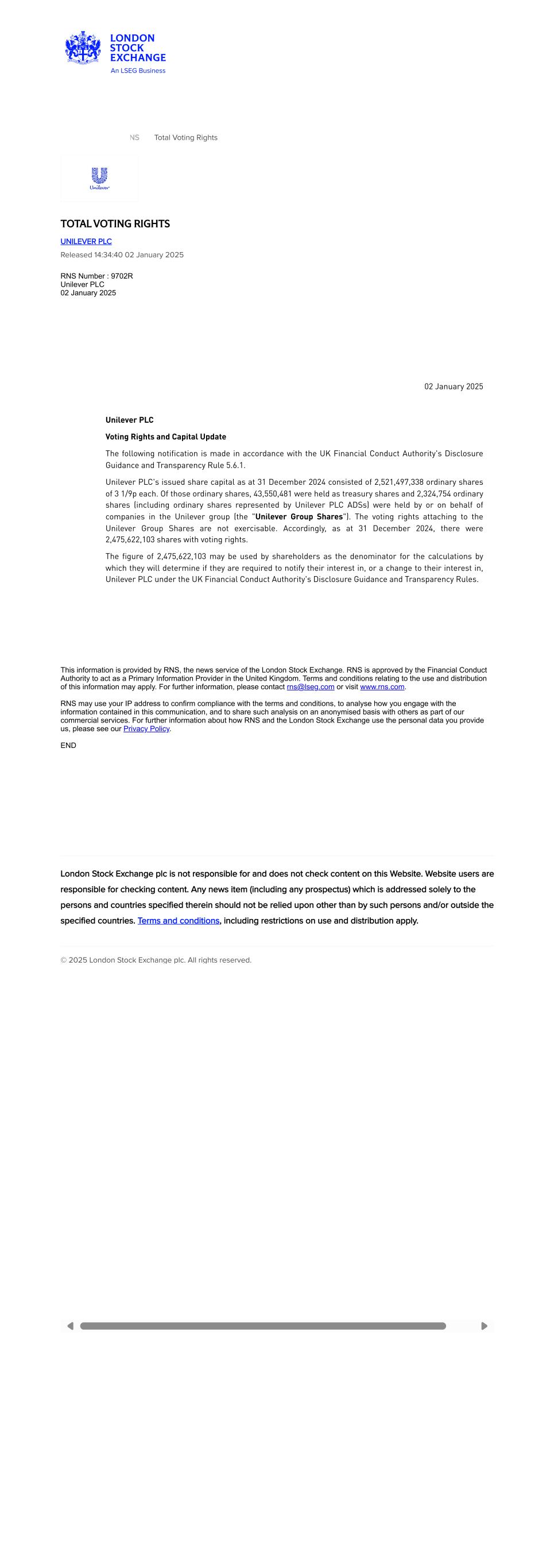 RNS Total Voting Rights TOTAL VOTING RIGHTS UNILEVER PLC Released 14:34:40 02 January 2025 RNS Number : 9702R Unilever PLC 02 January 2025   02 January 2025   Unilever PLC Voting Rights and Capital Update The following notification is made in accordance with the UK Financial Conduct Authority's Disclosure Guidance and Transparency Rule 5.6.1. Unilever PLC's issued share capital as at 31 December 2024 consisted of 2,521,497,338 ordinary shares of 3 1/9p each. Of those ordinary shares, 43,550,481 were held as treasury shares and 2,324,754 ordinary shares (including ordinary shares represented by Unilever PLC ADSs) were held by or on behalf of companies in the Unilever group (the "Unilever Group Shares"). The voting rights attaching to the Unilever Group Shares are not exercisable. Accordingly, as at 31 December 2024, there were 2,475,622,103 shares with voting rights. The figure of 2,475,622,103 may be used by shareholders as the denominator for the calculations by which they will determine if they are required to notify their interest in, or a change to their interest in, Unilever PLC under the UK Financial Conduct Authority's Disclosure Guidance and Transparency Rules.   This information is provided by RNS, the news service of the London Stock Exchange. RNS is approved by the Financial Conduct Authority to act as a Primary Information Provider in the United Kingdom. Terms and conditions relating to the use and distribution of this information may apply. For further information, please contact rns@lseg.com or visit www.rns.com. RNS may use your IP address to confirm compliance with the terms and conditions, to analyse how you engage with the information contained in this communication, and to share such analysis on an anonymised basis with others as part of our commercial services. For further information about how RNS and the London Stock Exchange use the personal data you provide us, please see our Privacy Policy. END   London Stock Exchange plc is not responsible for and does not check content on this Website. Website users are responsible for checking content. Any news item (including any prospectus) which is addressed solely to the persons and countries specified therein should not be relied upon other than by such persons and/or outside the specified countries. Terms and conditions, including restrictions on use and distribution apply. © 2025 London Stock Exchange plc. All rights reserved.
