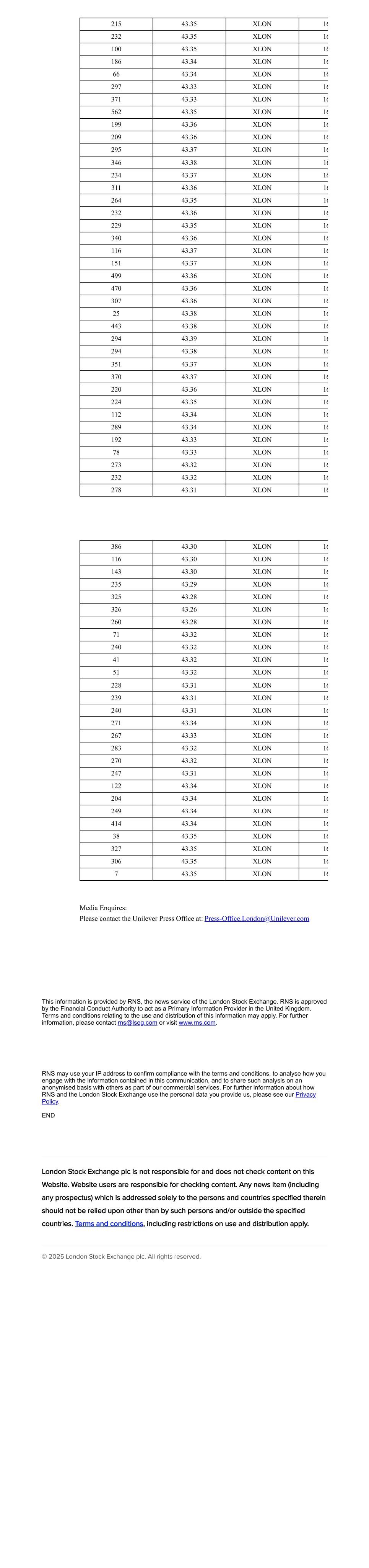 215 43.35 XLON 16 232 43.35 XLON 16 100 43.35 XLON 16 186 43.34 XLON 16 66 43.34 XLON 16 297 43.33 XLON 16 371 43.33 XLON 16 562 43.35 XLON 16 199 43.36 XLON 16 209 43.36 XLON 16 295 43.37 XLON 16 346 43.38 XLON 16 234 43.37 XLON 16 311 43.36 XLON 16 264 43.35 XLON 16 232 43.36 XLON 16 229 43.35 XLON 16 340 43.36 XLON 16 116 43.37 XLON 16 151 43.37 XLON 16 499 43.36 XLON 16 470 43.36 XLON 16 307 43.36 XLON 16 25 43.38 XLON 16 443 43.38 XLON 16 294 43.39 XLON 16 294 43.38 XLON 16 351 43.37 XLON 16 370 43.37 XLON 16 220 43.36 XLON 16 224 43.35 XLON 16 112 43.34 XLON 16 289 43.34 XLON 16 192 43.33 XLON 16 78 43.33 XLON 16 273 43.32 XLON 16 232 43.32 XLON 16 278 43.31 XLON 16 386 43.30 XLON 16 116 43.30 XLON 16 143 43.30 XLON 16 235 43.29 XLON 16 325 43.28 XLON 16 326 43.26 XLON 16 260 43.28 XLON 16 71 43.32 XLON 16 240 43.32 XLON 16 41 43.32 XLON 16 51 43.32 XLON 16 228 43.31 XLON 16 239 43.31 XLON 16 240 43.31 XLON 16 271 43.34 XLON 16 267 43.33 XLON 16 283 43.32 XLON 16 270 43.32 XLON 16 247 43.31 XLON 16 122 43.34 XLON 16 204 43.34 XLON 16 249 43.34 XLON 16 414 43.34 XLON 16 38 43.35 XLON 16 327 43.35 XLON 16 306 43.35 XLON 16 7 43.35 XLON 16 Media Enquires: Please contact the Unilever Press Office at: Press-Office.London@Unilever.com This information is provided by RNS, the news service of the London Stock Exchange. RNS is approved by the Financial Conduct Authority to act as a Primary Information Provider in the United Kingdom. Terms and conditions relating to the use and distribution of this information may apply. For further information, please contact rns@lseg.com or visit www.rns.com. RNS may use your IP address to confirm compliance with the terms and conditions, to analyse how you engage with the information contained in this communication, and to share such analysis on an anonymised basis with others as part of our commercial services. For further information about how RNS and the London Stock Exchange use the personal data you provide us, please see our Privacy Policy. END London Stock Exchange plc is not responsible for and does not check content on this Website. Website users are responsible for checking content. Any news item (including any prospectus) which is addressed solely to the persons and countries specified therein should not be relied upon other than by such persons and/or outside the specified countries. Terms and conditions, including restrictions on use and distribution apply. © 2025 London Stock Exchange plc. All rights reserved.