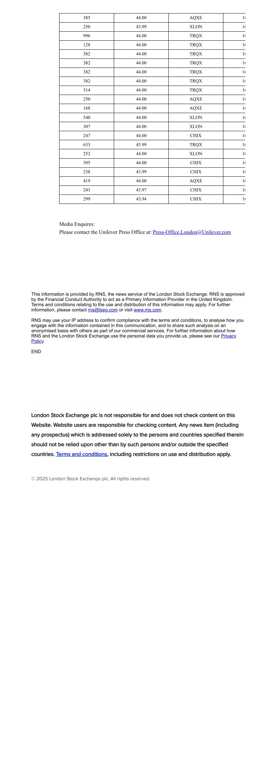 385 44.00 AQXE 16 250 43.99 XLON 16 996 44.00 TRQX 16 128 44.00 TRQX 16 382 44.00 TRQX 16 382 44.00 TRQX 16 382 44.00 TRQX 16 382 44.00 TRQX 16 314 44.00 TRQX 16 250 44.00 AQXE 16 168 44.00 AQXE 16 540 44.00 XLON 16 307 44.00 XLON 16 247 44.00 CHIX 16 633 43.99 TRQX 16 252 44.00 XLON 16 395 44.00 CHIX 16 238 43.99 CHIX 16 419 44.00 AQXE 16 243 43.97 CHIX 16 299 43.94 CHIX 16 Media Enquires: Please contact the Unilever Press Office at: Press-Office.London@Unilever.com This information is provided by RNS, the news service of the London Stock Exchange. RNS is approved by the Financial Conduct Authority to act as a Primary Information Provider in the United Kingdom. Terms and conditions relating to the use and distribution of this information may apply. For further information, please contact rns@lseg.com or visit www.rns.com. RNS may use your IP address to confirm compliance with the terms and conditions, to analyse how you engage with the information contained in this communication, and to share such analysis on an anonymised basis with others as part of our commercial services. For further information about how RNS and the London Stock Exchange use the personal data you provide us, please see our Privacy Policy. END London Stock Exchange plc is not responsible for and does not check content on this Website. Website users are responsible for checking content. Any news item (including any prospectus) which is addressed solely to the persons and countries specified therein should not be relied upon other than by such persons and/or outside the specified countries. Terms and conditions, including restrictions on use and distribution apply. © 2025 London Stock Exchange plc. All rights reserved.