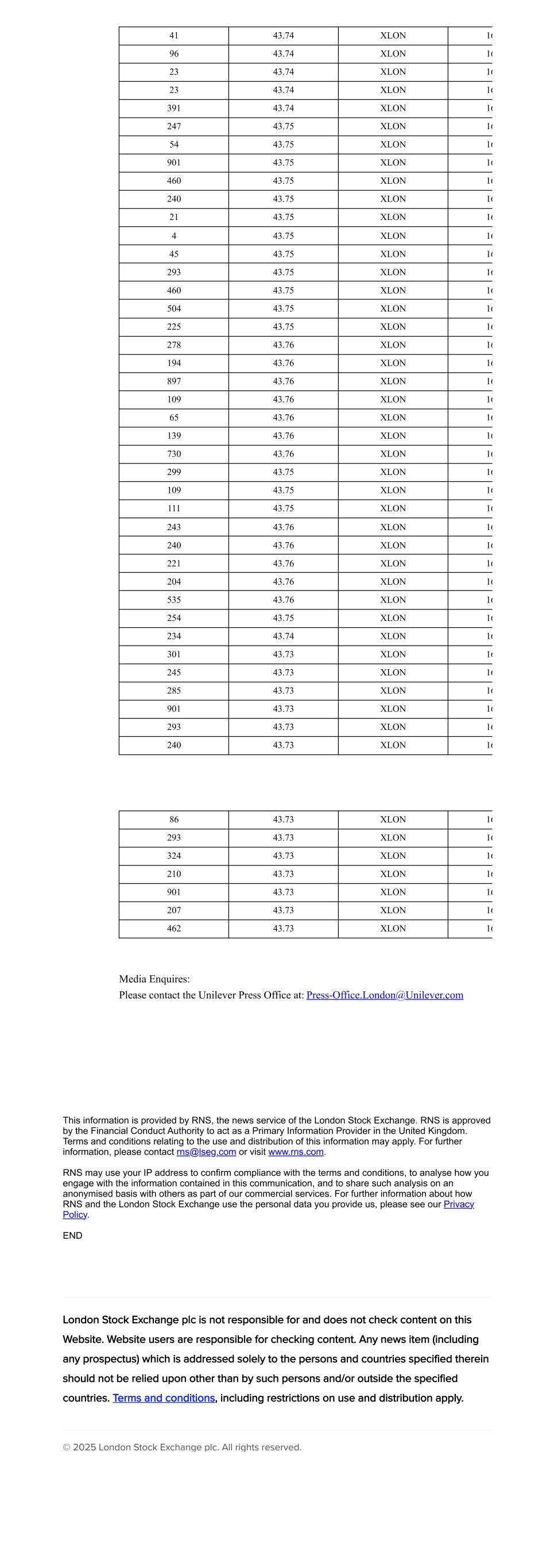 41 43.74 XLON 16 96 43.74 XLON 16 23 43.74 XLON 16 23 43.74 XLON 16 391 43.74 XLON 16 247 43.75 XLON 16 54 43.75 XLON 16 901 43.75 XLON 16 460 43.75 XLON 16 240 43.75 XLON 16 21 43.75 XLON 16 4 43.75 XLON 16 45 43.75 XLON 16 293 43.75 XLON 16 460 43.75 XLON 16 504 43.75 XLON 16 225 43.75 XLON 16 278 43.76 XLON 16 194 43.76 XLON 16 897 43.76 XLON 16 109 43.76 XLON 16 65 43.76 XLON 16 139 43.76 XLON 16 730 43.76 XLON 16 299 43.75 XLON 16 109 43.75 XLON 16 111 43.75 XLON 16 243 43.76 XLON 16 240 43.76 XLON 16 221 43.76 XLON 16 204 43.76 XLON 16 535 43.76 XLON 16 254 43.75 XLON 16 234 43.74 XLON 16 301 43.73 XLON 16 245 43.73 XLON 16 285 43.73 XLON 16 901 43.73 XLON 16 293 43.73 XLON 16 240 43.73 XLON 16 86 43.73 XLON 16 293 43.73 XLON 16 324 43.73 XLON 16 210 43.73 XLON 16 901 43.73 XLON 16 207 43.73 XLON 16 462 43.73 XLON 16 Media Enquires: Please contact the Unilever Press Office at: Press-Office.London@Unilever.com This information is provided by RNS, the news service of the London Stock Exchange. RNS is approved by the Financial Conduct Authority to act as a Primary Information Provider in the United Kingdom. Terms and conditions relating to the use and distribution of this information may apply. For further information, please contact rns@lseg.com or visit www.rns.com. RNS may use your IP address to confirm compliance with the terms and conditions, to analyse how you engage with the information contained in this communication, and to share such analysis on an anonymised basis with others as part of our commercial services. For further information about how RNS and the London Stock Exchange use the personal data you provide us, please see our Privacy Policy. END London Stock Exchange plc is not responsible for and does not check content on this Website. Website users are responsible for checking content. Any news item (including any prospectus) which is addressed solely to the persons and countries specified therein should not be relied upon other than by such persons and/or outside the specified countries. Terms and conditions, including restrictions on use and distribution apply. © 2025 London Stock Exchange plc. All rights reserved.