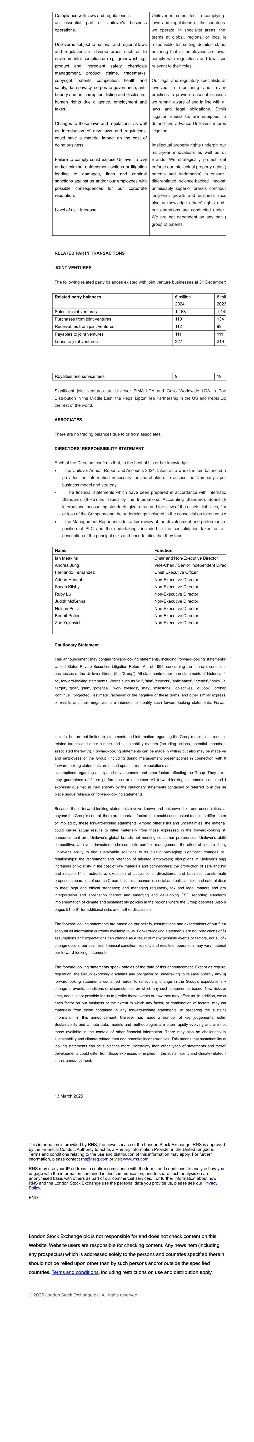 Compliance with laws and regulations is an essential part of Unilever's business operations. Unilever is subject to national and regional laws and regulations in diverse areas such as to environmental compliance (e.g. greenwashing), product and ingredient safety, chemicals management, product claims, trademarks, copyright, patents, competition, health and safety, data privacy, corporate governance, anti- bribery and anticorruption, listing and disclosure, human rights due diligence, employment and taxes. Changes to these laws and regulations, as well as introduction of new laws and regulations, could have a material impact on the cost of doing business. Failure to comply could expose Unilever to civil and/or criminal enforcement actions or litigation leading to damages, fines and criminal sanctions against us and/or our employees with possible consequences for our corporate reputation. Level of risk: Increase Unilever is committed to complying laws and regulations of the countries we operate. In specialist areas, the teams at global, regional or local le responsible for setting detailed standa ensuring that all employees are awar comply with regulations and laws spe relevant to their roles. Our legal and regulatory specialists ar involved in monitoring and review practices to provide reasonable assura we remain aware of and in line with all laws and legal obligations. Simila litigation specialists are equipped to defend and advance Unilever's interes litigation. Intellectual property rights underpin our multi-year innovations as well as ou Brands. We strategically protect, def enforce our intellectual property rights ( patents and trademarks) to ensure differentiated science-backed innovati unmissably superior brands contribut long-term growth and business succ also acknowledge others' rights and our operations are conducted under We are not dependent on any one p group of patents. RELATED PARTY TRANSACTIONS JOINT VENTURES The following related party balances existed with joint venture businesses at 31 December: Related party balances € million 2024 € mil 2023 Sales to joint ventures 1,168 1,144 Purchases from joint ventures 110 134 Receivables from joint ventures 112 99 Payables to joint ventures 111 111 Loans to joint ventures 227 219 Royalties and service fees 9 19 Significant joint ventures are Unilever FIMA LDA and Gallo Worldwide LDA in Port Distribution in the Middle East, the Pepsi Lipton Tea Partnership in the US and Pepsi Lip the rest of the world. ASSOCIATES There are no trading balances due to or from associates. DIRECTORS' RESPONSIBILITY STATEMENT Each of the Directors confirms that, to the best of his or her knowledge: · The Unilever Annual Report and Accounts 2024, taken as a whole, is fair, balanced a provides the information necessary for shareholders to assess the Company's pos business model and strategy; · The financial statements which have been prepared in accordance with Internatio Standards (IFRS) as issued by the International Accounting Standards Board (IA international accounting standards give a true and fair view of the assets, liabilities, fina or loss of the Company and the undertakings included in the consolidation taken as a w · The Management Report includes a fair review of the development and performance position of PLC and the undertakings included in the consolidation taken as a w description of the principal risks and uncertainties that they face. Name Function Ian Meakins Andrea Jung Fernando Fernandez Adrian Hennah Susan Kilsby Ruby Lu Judith McKenna Nelson Peltz Benoît Potier Zoe Yujnovich Chair and Non-Executive Director Vice-Chair / Senior Independent Direc Chief Executive Officer Non-Executive Director Non-Executive Director Non-Executive Director Non-Executive Director Non-Executive Director Non-Executive Director Non-Executive Director Cautionary Statement This announcement may contain forward-looking statements, including 'forward-looking statements' United States Private Securities Litigation Reform Act of 1995, concerning the financial condition, businesses of the Unilever Group (the 'Group'). All statements other than statements of historical fa be, forward-looking statements. Words such as 'will', 'aim', 'expects', 'anticipates', 'intends', 'looks', 'be 'target', 'goal', 'plan', 'potential', 'work towards', 'may', 'milestone', 'objectives', 'outlook', 'probab 'continue', 'projected', 'estimate', 'achieve' or the negative of these terms, and other similar expressi or results and their negatives, are intended to identify such forward-looking statements. Forwar include, but are not limited to, statements and information regarding the Group's emissions reductio related targets and other climate and sustainability matters (including actions, potential impacts a associated therewith). Forward-looking statements can be made in writing but also may be made ve and employees of the Group (including during management presentations) in connection with th forward-looking statements are based upon current expectations and assumptions regarding anticipated developments and other factors affecting the Group. They are n they guarantees of future performance or outcomes. All forward-looking statements contained i expressly qualified in their entirety by the cautionary statements contained or referred to in this se place undue reliance on forward-looking statements. Because these forward-looking statements involve known and unknown risks and uncertainties, a beyond the Group's control, there are important factors that could cause actual results to differ mater or implied by these forward-looking statements. Among other risks and uncertainties, the material could cause actual results to differ materially from those expressed in the forward-looking sta announcement are: Unilever's global brands not meeting consumer preferences; Unilever's abilit competitive; Unilever's investment choices in its portfolio management; the effect of climate chang Unile