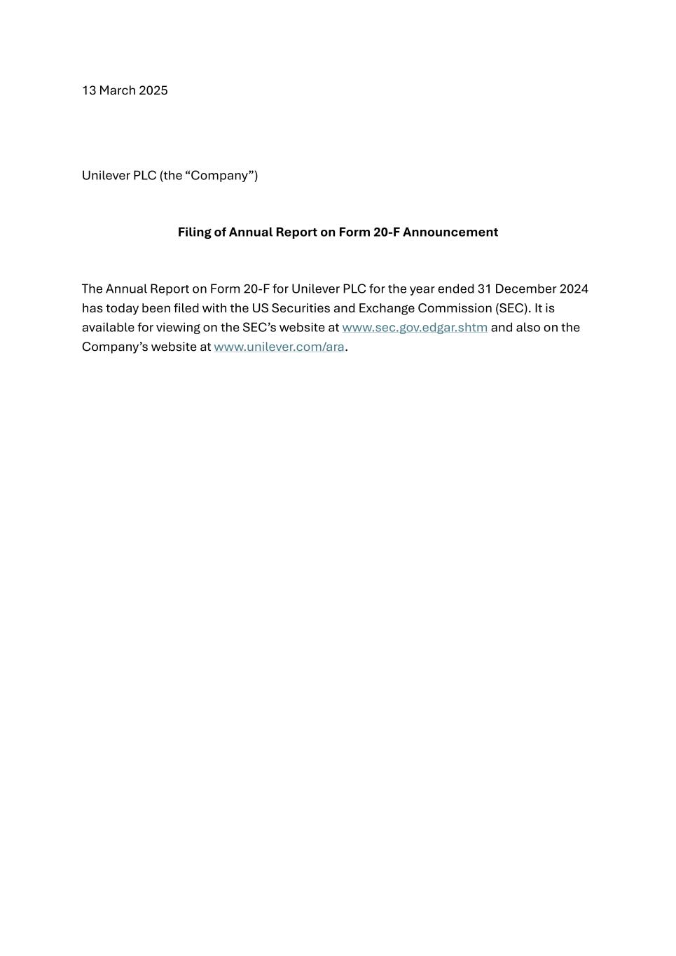 13 March 2025 Unilever PLC (the “Company”) Filing of Annual Report on Form 20-F Announcement The Annual Report on Form 20-F for Unilever PLC for the year ended 31 December 2024 has today been filed with the US Securities and Exchange Commission (SEC). It is available for viewing on the SEC’s website at www.sec.gov.edgar.shtm and also on the Company’s website at www.unilever.com/ara.