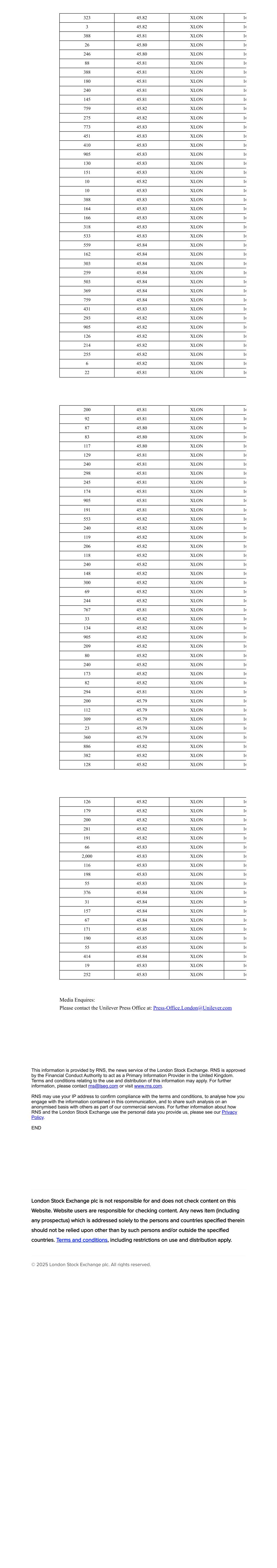 323 45.82 XLON 16 3 45.82 XLON 16 388 45.81 XLON 16 26 45.80 XLON 16 246 45.80 XLON 16 88 45.81 XLON 16 388 45.81 XLON 16 180 45.81 XLON 16 240 45.81 XLON 16 145 45.81 XLON 16 759 45.82 XLON 16 275 45.82 XLON 16 773 45.83 XLON 16 451 45.83 XLON 16 410 45.83 XLON 16 905 45.83 XLON 16 130 45.83 XLON 16 151 45.83 XLON 16 10 45.82 XLON 16 10 45.83 XLON 16 388 45.83 XLON 16 164 45.83 XLON 16 166 45.83 XLON 16 318 45.83 XLON 16 533 45.83 XLON 16 559 45.84 XLON 16 162 45.84 XLON 16 303 45.84 XLON 16 259 45.84 XLON 16 503 45.84 XLON 16 369 45.84 XLON 16 759 45.84 XLON 16 431 45.83 XLON 16 293 45.82 XLON 16 905 45.82 XLON 16 126 45.82 XLON 16 214 45.82 XLON 16 255 45.82 XLON 16 6 45.82 XLON 16 22 45.81 XLON 16 200 45.81 XLON 16 92 45.81 XLON 16 87 45.80 XLON 16 83 45.80 XLON 16 117 45.80 XLON 16 129 45.81 XLON 16 240 45.81 XLON 16 298 45.81 XLON 16 245 45.81 XLON 16 174 45.81 XLON 16 905 45.81 XLON 16 191 45.81 XLON 16 553 45.82 XLON 16 240 45.82 XLON 16 119 45.82 XLON 16 206 45.82 XLON 16 118 45.82 XLON 16 240 45.82 XLON 16 148 45.82 XLON 16 300 45.82 XLON 16 69 45.82 XLON 16 244 45.82 XLON 16 767 45.81 XLON 16 33 45.82 XLON 16 134 45.82 XLON 16 905 45.82 XLON 16 209 45.82 XLON 16 80 45.82 XLON 16 240 45.82 XLON 16 173 45.82 XLON 16 82 45.82 XLON 16 294 45.81 XLON 16 200 45.79 XLON 16 112 45.79 XLON 16 309 45.79 XLON 16 23 45.79 XLON 16 360 45.79 XLON 16 886 45.82 XLON 16 382 45.82 XLON 16 128 45.82 XLON 16 126 45.82 XLON 16 179 45.82 XLON 16 200 45.82 XLON 16 281 45.82 XLON 16 191 45.82 XLON 16 66 45.83 XLON 16 2,000 45.83 XLON 16 116 45.83 XLON 16 198 45.83 XLON 16 55 45.83 XLON 16 376 45.84 XLON 16 31 45.84 XLON 16 157 45.84 XLON 16 67 45.84 XLON 16 171 45.85 XLON 16 190 45.85 XLON 16 55 45.85 XLON 16 414 45.84 XLON 16 19 45.83 XLON 16 252 45.83 XLON 16 Media Enquires: Please contact the Unilever Press Office at: Press-Office.London@Unilever.com This information is provided by RNS, the news service of the London Stock Exchange. RNS is approved by the Financial Conduct Authority to act as a Primary Information Provider in the United Kingdom. Terms and conditions relating to the use and distribution of this information may apply. For further information, please contact rns@lseg.com or visit www.rns.com. RNS may use your IP address to confirm compliance with the terms and conditions, to analyse how you engage with the information contained in this communication, and to share such analysis on an anonymised basis with others as part of our commercial services. For further information about how RNS and the London Stock Exchange use the personal data you provide us, please see our Privacy Policy. END London Stock Exchange plc is not responsible for and does not check content on this Website. Website users are responsible for checking content. Any news item (including any prospectus) which is addressed solely to the persons and countries specified therein should not be relied upon other than by such persons and/or outside the specified countries. Terms and conditions, including restrictions on use and distribution apply. © 2025 London Stock Exchange plc. All rights reserved.