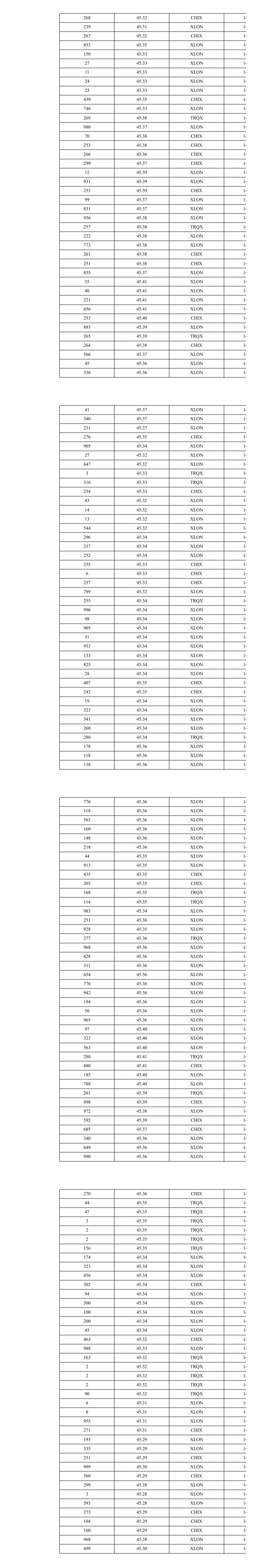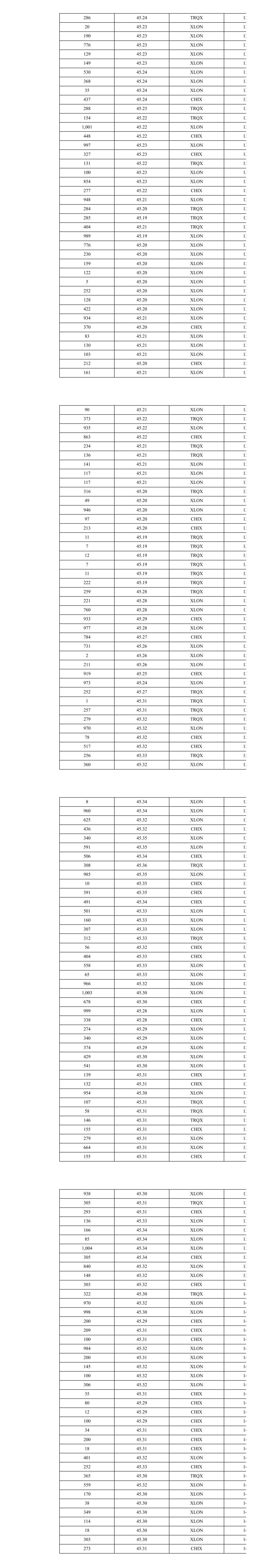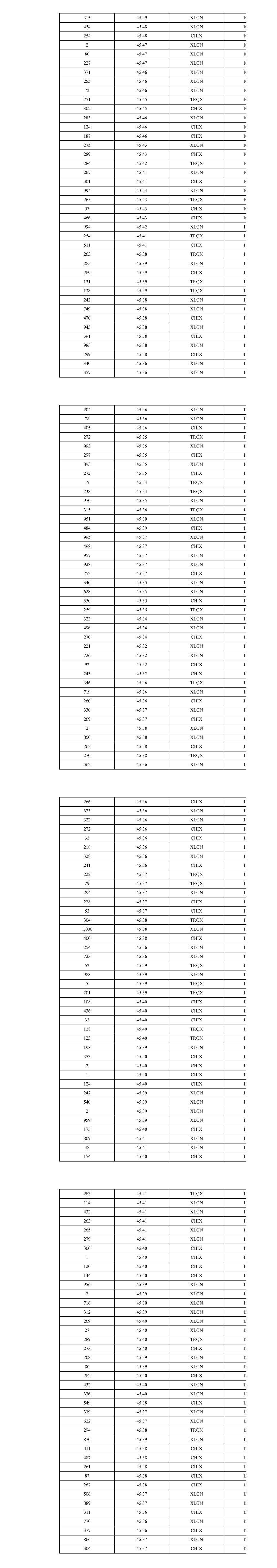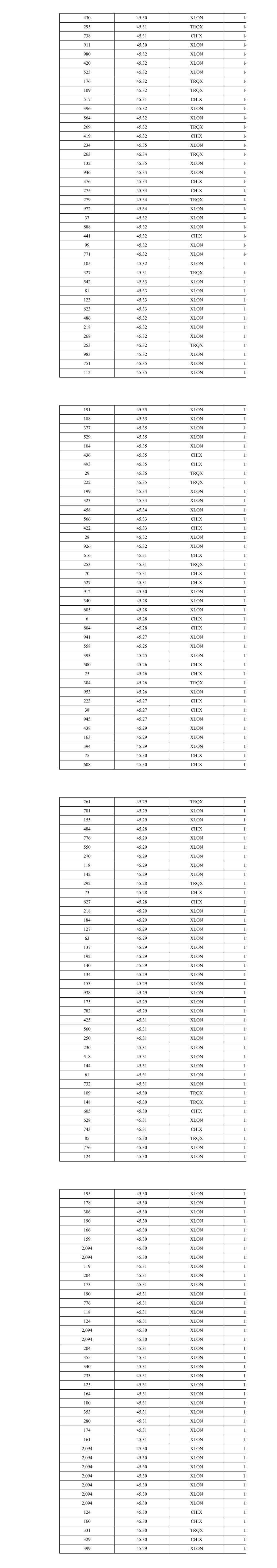 315 45.49 XLON 10 454 45.48 XLON 10 254 45.48 CHIX 10 2 45.47 XLON 10 80 45.47 XLON 10 227 45.47 XLON 10 371 45.46 XLON 10 255 45.46 XLON 10 72 45.46 XLON 10 251 45.45 TRQX 10 302 45.45 CHIX 10 283 45.46 XLON 10 124 45.46 CHIX 10 187 45.46 CHIX 10 275 45.43 XLON 10 289 45.43 CHIX 10 284 45.42 TRQX 10 267 45.41 XLON 10 301 45.41 CHIX 10 995 45.44 XLON 10 265 45.43 TRQX 10 57 45.43 CHIX 10 466 45.43 CHIX 10 994 45.42 XLON 11 254 45.41 TRQX 11 511 45.41 CHIX 11 263 45.38 TRQX 11 285 45.39 XLON 11 289 45.39 CHIX 11 131 45.39 TRQX 11 138 45.39 TRQX 11 242 45.38 XLON 11 749 45.38 XLON 11 470 45.38 CHIX 11 945 45.38 XLON 11 391 45.38 CHIX 11 983 45.38 XLON 11 299 45.38 CHIX 11 340 45.36 XLON 11 357 45.36 XLON 11 204 45.36 XLON 11 78 45.36 XLON 11 405 45.36 CHIX 11 272 45.35 TRQX 11 993 45.35 XLON 11 297 45.35 CHIX 11 893 45.35 XLON 11 272 45.35 CHIX 11 19 45.34 TRQX 11 238 45.34 TRQX 11 970 45.35 XLON 11 315 45.36 TRQX 11 951 45.39 XLON 11 484 45.39 CHIX 11 995 45.37 XLON 11 498 45.37 CHIX 11 957 45.37 XLON 11 928 45.37 XLON 11 252 45.37 CHIX 11 340 45.35 XLON 11 628 45.35 XLON 11 350 45.35 CHIX 11 259 45.35 TRQX 11 323 45.34 XLON 11 496 45.34 XLON 11 270 45.34 CHIX 11 221 45.32 XLON 11 726 45.32 XLON 11 92 45.32 CHIX 11 243 45.32 CHIX 11 346 45.36 TRQX 11 719 45.36 XLON 11 260 45.36 CHIX 11 330 45.37 XLON 11 269 45.37 CHIX 11 2 45.38 XLON 11 850 45.38 XLON 11 263 45.38 CHIX 11 270 45.38 TRQX 11 562 45.36 XLON 11 266 45.36 CHIX 11 323 45.36 XLON 11 322 45.36 XLON 11 272 45.36 CHIX 11 32 45.36 CHIX 11 218 45.36 XLON 11 328 45.36 XLON 11 241 45.36 CHIX 11 222 45.37 TRQX 11 29 45.37 TRQX 11 294 45.37 XLON 11 228 45.37 CHIX 11 52 45.37 CHIX 11 304 45.38 TRQX 11 1,000 45.38 XLON 11 400 45.38 CHIX 11 254 45.36 XLON 11 723 45.36 XLON 11 52 45.39 TRQX 11 988 45.39 XLON 11 5 45.39 TRQX 11 201 45.39 TRQX 11 108 45.40 CHIX 11 436 45.40 CHIX 11 32 45.40 CHIX 11 128 45.40 TRQX 11 123 45.40 TRQX 11 193 45.39 XLON 11 353 45.40 CHIX 11 2 45.40 CHIX 11 1 45.40 CHIX 11 124 45.40 CHIX 11 242 45.39 XLON 11 540 45.39 XLON 11 2 45.39 XLON 11 959 45.39 XLON 11 175 45.40 CHIX 11 809 45.41 XLON 11 38 45.41 XLON 11 154 45.40 CHIX 11 283 45.41 TRQX 11 114 45.41 XLON 11 432 45.41 XLON 11 263 45.41 CHIX 11 265 45.41 XLON 11 279 45.41 XLON 11 300 45.40 CHIX 11 1 45.40 CHIX 11 120 45.40 CHIX 11 144 45.40 CHIX 11 956 45.39 XLON 11 2 45.39 XLON 11 716 45.39 XLON 11 312 45.39 XLON 12 269 45.40 XLON 12 27 45.40 XLON 12 289 45.40 TRQX 12 273 45.40 CHIX 12 208 45.39 XLON 12 80 45.39 XLON 12 282 45.40 CHIX 12 432 45.40 XLON 12 336 45.40 XLON 12 549 45.38 CHIX 12 339 45.37 XLON 12 622 45.37 XLON 12 294 45.38 TRQX 12 870 45.39 XLON 12 411 45.38 CHIX 12 487 45.38 CHIX 12 261 45.38 CHIX 12 87 45.38 CHIX 12 267 45.38 CHIX 12 506 45.37 XLON 12 889 45.37 XLON 12 311 45.36 CHIX 12 770 45.36 XLON 12 377 45.36 CHIX 12 866 45.37 XLON 12 304 45.37 CHIX 12