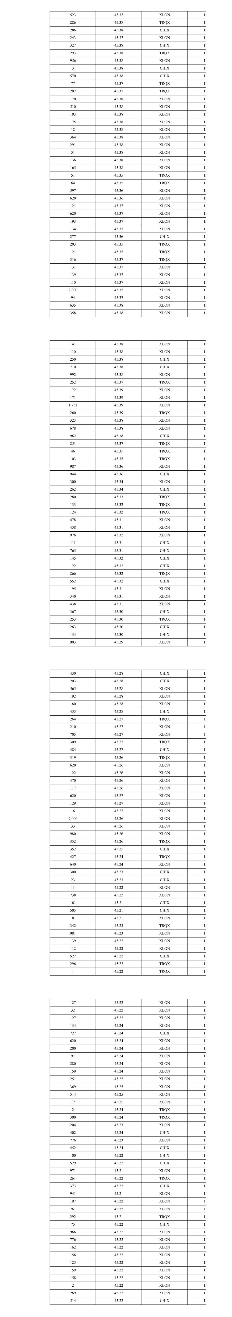523 45.37 XLON 12 286 45.38 TRQX 12 286 45.38 CHIX 12 243 45.37 XLON 12 327 45.38 CHIX 12 293 45.38 TRQX 12 956 45.38 XLON 12 3 45.38 CHIX 12 570 45.38 CHIX 12 77 45.37 TRQX 12 202 45.37 TRQX 12 170 45.38 XLON 12 510 45.38 XLON 12 103 45.38 XLON 12 175 45.38 XLON 12 12 45.38 XLON 12 364 45.38 XLON 12 291 45.38 XLON 12 51 45.38 XLON 12 136 45.38 XLON 12 165 45.38 XLON 12 51 45.35 TRQX 12 64 45.35 TRQX 12 597 45.36 XLON 12 620 45.36 XLON 12 121 45.37 XLON 12 620 45.37 XLON 12 193 45.37 XLON 12 134 45.37 XLON 12 277 45.36 CHIX 12 203 45.35 TRQX 12 121 45.35 TRQX 12 316 45.37 TRQX 12 131 45.37 XLON 12 139 45.37 XLON 12 110 45.37 XLON 12 2,000 45.37 XLON 12 94 45.37 XLON 12 635 45.38 XLON 12 358 45.38 XLON 12 141 45.38 XLON 12 110 45.38 XLON 12 250 45.38 CHIX 12 710 45.38 CHIX 12 992 45.38 XLON 12 252 45.37 TRQX 12 172 45.39 XLON 12 171 45.39 XLON 12 1,751 45.39 XLON 12 260 45.39 TRQX 12 323 45.38 XLON 12 678 45.38 XLON 12 962 45.38 CHIX 12 251 45.37 TRQX 12 46 45.35 TRQX 12 103 45.35 TRQX 12 987 45.36 XLON 12 944 45.36 CHIX 12 300 45.34 XLON 12 262 45.34 CHIX 12 280 45.33 TRQX 12 133 45.32 TRQX 12 124 45.32 TRQX 12 478 45.31 XLON 12 458 45.31 XLON 12 976 45.32 XLON 12 111 45.31 CHIX 13 765 45.31 CHIX 13 145 45.32 CHIX 13 122 45.32 CHIX 13 266 45.32 TRQX 13 552 45.32 CHIX 13 195 45.31 XLON 13 340 45.31 XLON 13 438 45.31 XLON 13 367 45.30 CHIX 13 253 45.30 TRQX 13 263 45.30 CHIX 13 134 45.30 CHIX 13 903 45.29 XLON 13 430 45.28 CHIX 13 203 45.28 CHIX 13 565 45.28 XLON 13 192 45.28 XLON 13 180 45.28 XLON 13 455 45.28 CHIX 13 264 45.27 TRQX 13 210 45.27 XLON 13 705 45.27 XLON 13 309 45.27 TRQX 13 484 45.27 CHIX 13 319 45.26 TRQX 13 620 45.26 XLON 13 122 45.26 XLON 13 470 45.26 XLON 13 117 45.26 XLON 13 620 45.27 XLON 13 129 45.27 XLON 13 16 45.27 XLON 13 2,000 45.26 XLON 13 33 45.26 XLON 13 980 45.26 XLON 13 352 45.26 TRQX 13 352 45.25 CHIX 13 427 45.24 TRQX 13 640 45.24 XLON 13 300 45.23 CHIX 13 23 45.23 CHIX 13 11 45.22 XLON 13 738 45.22 XLON 13 161 45.21 CHIX 13 505 45.21 CHIX 13 8 45.21 XLON 13 342 45.23 TRQX 13 981 45.23 XLON 13 139 45.22 XLON 13 112 45.22 XLON 13 527 45.22 CHIX 13 296 45.22 TRQX 13 1 45.22 TRQX 13 127 45.22 XLON 13 32 45.22 XLON 13 127 45.22 XLON 13 134 45.24 XLON 13 727 45.24 CHIX 13 620 45.24 XLON 13 200 45.24 XLON 13 91 45.24 XLON 13 280 45.24 XLON 13 159 45.24 XLON 13 251 45.25 XLON 13 369 45.25 XLON 13 514 45.25 XLON 13 17 45.25 XLON 13 2 45.24 TRQX 13 300 45.24 TRQX 13 204 45.23 XLON 13 402 45.24 CHIX 13 776 45.23 XLON 13 452 45.24 CHIX 13 100 45.22 CHIX 13 529 45.22 CHIX 13 971 45.21 XLON 13 261 45.22 TRQX 13 373 45.22 CHIX 13 941 45.21 XLON 13 197 45.22 XLON 13 761 45.22 XLON 13 292 45.21 TRQX 13 75 45.22 CHIX 13 966 45.22 XLON 13 776 45.22 XLON 13 162 45.22 XLON 13 156 45.22 XLON 13 125 45.22 XLON 13 159 45.22 XLON 13 158 45.22 XLON 13 2 45.22 XLON 13 269 45.22 XLON 13 514 45.22 CHIX 13