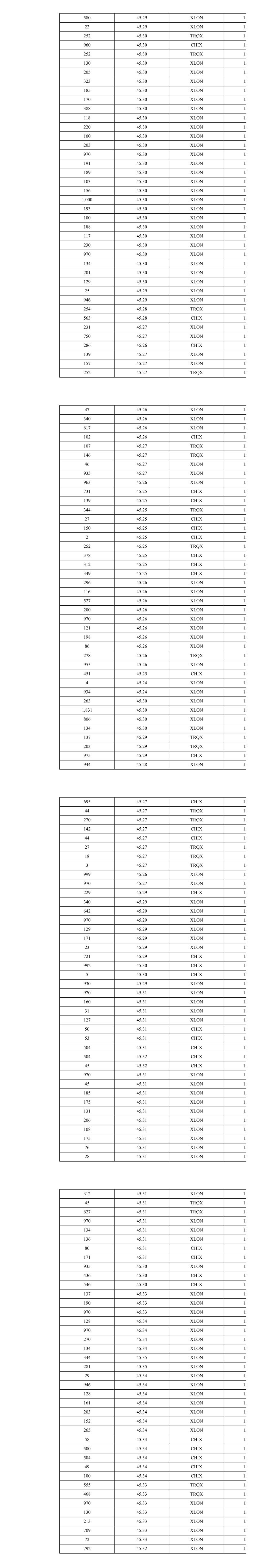 430 45.30 XLON 14 295 45.31 TRQX 14 738 45.31 CHIX 14 911 45.30 XLON 14 980 45.32 XLON 14 420 45.32 XLON 14 523 45.32 XLON 14 176 45.32 TRQX 14 109 45.32 TRQX 14 517 45.31 CHIX 14 396 45.32 XLON 14 564 45.32 XLON 14 269 45.32 TRQX 14 419 45.32 CHIX 14 234 45.35 XLON 14 263 45.34 TRQX 14 132 45.35 XLON 14 946 45.34 XLON 14 376 45.34 CHIX 14 275 45.34 CHIX 14 279 45.34 TRQX 14 972 45.34 XLON 14 37 45.32 XLON 14 888 45.32 XLON 14 441 45.32 CHIX 14 99 45.32 XLON 14 771 45.32 XLON 14 105 45.32 XLON 14 327 45.31 TRQX 14 542 45.33 XLON 15 81 45.33 XLON 15 123 45.33 XLON 15 623 45.33 XLON 15 486 45.32 XLON 15 218 45.32 XLON 15 268 45.32 XLON 15 253 45.32 TRQX 15 983 45.32 XLON 15 751 45.35 XLON 15 112 45.35 XLON 15 191 45.35 XLON 15 188 45.35 XLON 15 377 45.35 XLON 15 529 45.35 XLON 15 104 45.35 XLON 15 436 45.35 CHIX 15 493 45.35 CHIX 15 29 45.35 TRQX 15 222 45.35 TRQX 15 199 45.34 XLON 15 323 45.34 XLON 15 458 45.34 XLON 15 566 45.33 CHIX 15 422 45.33 CHIX 15 28 45.32 XLON 15 926 45.32 XLON 15 616 45.31 CHIX 15 253 45.31 TRQX 15 70 45.31 CHIX 15 527 45.31 CHIX 15 912 45.30 XLON 15 340 45.28 XLON 15 605 45.28 XLON 15 6 45.28 CHIX 15 804 45.28 CHIX 15 941 45.27 XLON 15 558 45.25 XLON 15 393 45.25 XLON 15 500 45.26 CHIX 15 25 45.26 CHIX 15 304 45.26 TRQX 15 953 45.26 XLON 15 223 45.27 CHIX 15 38 45.27 CHIX 15 945 45.27 XLON 15 438 45.29 XLON 15 163 45.29 XLON 15 394 45.29 XLON 15 75 45.30 CHIX 15 608 45.30 CHIX 15 261 45.29 TRQX 15 781 45.29 XLON 15 155 45.29 XLON 15 484 45.28 CHIX 15 776 45.29 XLON 15 550 45.29 XLON 15 270 45.29 XLON 15 118 45.29 XLON 15 142 45.29 XLON 15 292 45.28 TRQX 15 73 45.28 CHIX 15 627 45.28 CHIX 15 218 45.29 XLON 15 184 45.29 XLON 15 127 45.29 XLON 15 63 45.29 XLON 15 137 45.29 XLON 15 192 45.29 XLON 15 140 45.29 XLON 15 134 45.29 XLON 15 153 45.29 XLON 15 938 45.29 XLON 15 175 45.29 XLON 15 782 45.29 XLON 15 425 45.31 XLON 15 560 45.31 XLON 15 250 45.31 XLON 15 230 45.31 XLON 15 518 45.31 XLON 15 144 45.31 XLON 15 61 45.31 XLON 15 732 45.31 XLON 15 109 45.30 TRQX 15 148 45.30 TRQX 15 605 45.30 CHIX 15 628 45.31 XLON 15 743 45.31 CHIX 15 85 45.30 TRQX 15 776 45.30 XLON 15 124 45.30 XLON 15 195 45.30 XLON 15 178 45.30 XLON 15 306 45.30 XLON 15 190 45.30 XLON 15 166 45.30 XLON 15 159 45.30 XLON 15 2,094 45.30 XLON 15 2,094 45.30 XLON 15 119 45.31 XLON 15 204 45.31 XLON 15 173 45.31 XLON 15 190 45.31 XLON 15 776 45.31 XLON 15 118 45.31 XLON 15 124 45.31 XLON 15 2,094 45.30 XLON 15 2,094 45.30 XLON 15 204 45.31 XLON 15 355 45.31 XLON 15 340 45.31 XLON 15 233 45.31 XLON 15 125 45.31 XLON 15 164 45.31 XLON 15 100 45.31 XLON 15 353 45.31 XLON 15 280 45.31 XLON 15 174 45.31 XLON 15 161 45.31 XLON 15 2,094 45.30 XLON 15 2,094 45.30 XLON 15 2,094 45.30 XLON 15 2,094 45.30 XLON 15 2,094 45.30 XLON 15 2,094 45.30 XLON 15 2,094 45.30 XLON 15 124 45.30 CHIX 15 160 45.30 CHIX 15 331 45.30 TRQX 15 329 45.30 CHIX 15 399 45.29 XLON 15