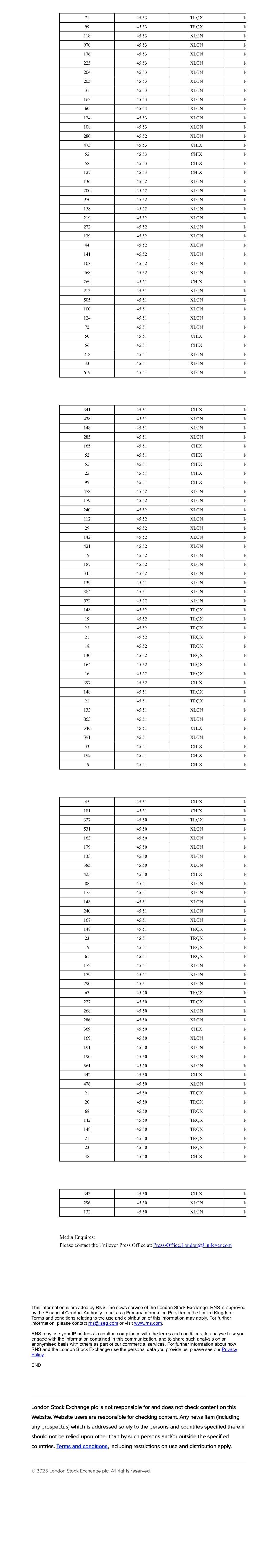 71 45.53 TRQX 16 99 45.53 TRQX 16 118 45.53 XLON 16 970 45.53 XLON 16 176 45.53 XLON 16 225 45.53 XLON 16 204 45.53 XLON 16 205 45.53 XLON 16 31 45.53 XLON 16 163 45.53 XLON 16 60 45.53 XLON 16 124 45.53 XLON 16 108 45.53 XLON 16 280 45.52 XLON 16 473 45.53 CHIX 16 55 45.53 CHIX 16 58 45.53 CHIX 16 127 45.53 CHIX 16 136 45.52 XLON 16 200 45.52 XLON 16 970 45.52 XLON 16 158 45.52 XLON 16 219 45.52 XLON 16 272 45.52 XLON 16 139 45.52 XLON 16 44 45.52 XLON 16 141 45.52 XLON 16 103 45.52 XLON 16 468 45.52 XLON 16 269 45.51 CHIX 16 213 45.51 XLON 16 505 45.51 XLON 16 100 45.51 XLON 16 124 45.51 XLON 16 72 45.51 XLON 16 50 45.51 CHIX 16 56 45.51 CHIX 16 218 45.51 XLON 16 33 45.51 XLON 16 619 45.51 XLON 16 341 45.51 CHIX 16 438 45.51 XLON 16 148 45.51 XLON 16 285 45.51 XLON 16 165 45.51 CHIX 16 52 45.51 CHIX 16 55 45.51 CHIX 16 25 45.51 CHIX 16 99 45.51 CHIX 16 478 45.52 XLON 16 179 45.52 XLON 16 240 45.52 XLON 16 112 45.52 XLON 16 29 45.52 XLON 16 142 45.52 XLON 16 421 45.52 XLON 16 19 45.52 XLON 16 187 45.52 XLON 16 345 45.52 XLON 16 139 45.51 XLON 16 384 45.51 XLON 16 572 45.52 XLON 16 148 45.52 TRQX 16 19 45.52 TRQX 16 23 45.52 TRQX 16 21 45.52 TRQX 16 18 45.52 TRQX 16 130 45.52 TRQX 16 164 45.52 TRQX 16 16 45.52 TRQX 16 397 45.52 CHIX 16 148 45.51 TRQX 16 21 45.51 TRQX 16 133 45.51 XLON 16 853 45.51 XLON 16 346 45.51 CHIX 16 391 45.51 XLON 16 33 45.51 CHIX 16 192 45.51 CHIX 16 19 45.51 CHIX 16 45 45.51 CHIX 16 181 45.51 CHIX 16 327 45.50 TRQX 16 531 45.50 XLON 16 163 45.50 XLON 16 179 45.50 XLON 16 133 45.50 XLON 16 385 45.50 XLON 16 425 45.50 CHIX 16 88 45.51 XLON 16 175 45.51 XLON 16 148 45.51 XLON 16 240 45.51 XLON 16 167 45.51 XLON 16 148 45.51 TRQX 16 23 45.51 TRQX 16 19 45.51 TRQX 16 61 45.51 TRQX 16 172 45.51 XLON 16 179 45.51 XLON 16 790 45.51 XLON 16 67 45.50 TRQX 16 227 45.50 TRQX 16 268 45.50 XLON 16 286 45.50 XLON 16 369 45.50 CHIX 16 169 45.50 XLON 16 191 45.50 XLON 16 190 45.50 XLON 16 361 45.50 XLON 16 442 45.50 CHIX 16 476 45.50 XLON 16 21 45.50 TRQX 16 20 45.50 TRQX 16 68 45.50 TRQX 16 142 45.50 TRQX 16 148 45.50 TRQX 16 21 45.50 TRQX 16 23 45.50 TRQX 16 48 45.50 CHIX 16 343 45.50 CHIX 16 296 45.50 XLON 16 132 45.50 XLON 16 Media Enquires: Please contact the Unilever Press Office at: Press-Office.London@Unilever.com This information is provided by RNS, the news service of the London Stock Exchange. RNS is approved by the Financial Conduct Authority to act as a Primary Information Provider in the United Kingdom. Terms and conditions relating to the use and distribution of this information may apply. For further information, please contact rns@lseg.com or visit www.rns.com. RNS may use your IP address to confirm compliance with the terms and conditions, to analyse how you engage with the information contained in this communication, and to share such analysis on an anonymised basis with others as part of our commercial services. For further information about how RNS and the London Stock Exchange use the personal data you provide us, please see our Privacy Policy. END London Stock Exchange plc is not responsible for and does not check content on this Website. Website users are responsible for checking content. Any news item (including any prospectus) which is addressed solely to the persons and countries specified therein should not be relied upon other than by such persons and/or outside the specified countries. Terms and conditions, including restrictions on use and distribution apply. © 2025 London Stock Exchange plc. All rights reserved.