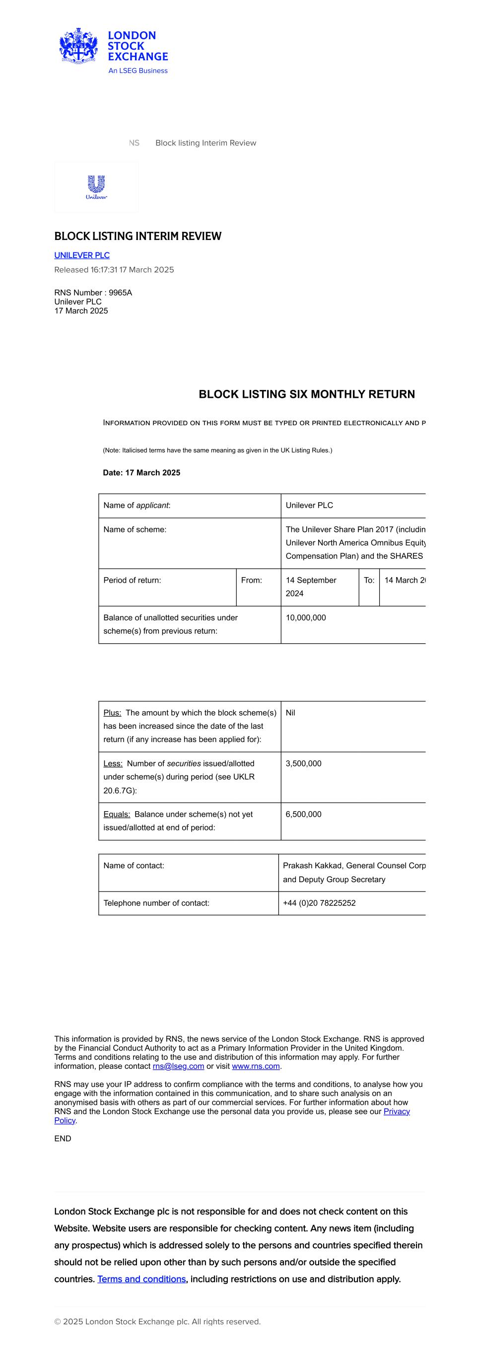 RNS Block listing Interim Review BLOCK LISTING INTERIM REVIEW UNILEVER PLC Released 16:17:31 17 March 2025 RNS Number : 9965A Unilever PLC 17 March 2025 BLOCK LISTING SIX MONTHLY RETURN Information provided on this form must be typed or printed electronically and p (Note: Italicised terms have the same meaning as given in the UK Listing Rules.) Date: 17 March 2025 Name of applicant: Unilever PLC Name of scheme: The Unilever Share Plan 2017 (includin Unilever North America Omnibus Equity Compensation Plan) and the SHARES Period of return: From: 14 September 2024 To: 14 March 20 Balance of unallotted securities under scheme(s) from previous return: 10,000,000 Plus: The amount by which the block scheme(s) has been increased since the date of the last return (if any increase has been applied for): Nil Less: Number of securities issued/allotted under scheme(s) during period (see UKLR 20.6.7G): 3,500,000 Equals: Balance under scheme(s) not yet issued/allotted at end of period: 6,500,000 Name of contact: Prakash Kakkad, General Counsel Corp and Deputy Group Secretary Telephone number of contact: +44 (0)20 78225252 This information is provided by RNS, the news service of the London Stock Exchange. RNS is approved by the Financial Conduct Authority to act as a Primary Information Provider in the United Kingdom. Terms and conditions relating to the use and distribution of this information may apply. For further information, please contact rns@lseg.com or visit www.rns.com. RNS may use your IP address to confirm compliance with the terms and conditions, to analyse how you engage with the information contained in this communication, and to share such analysis on an anonymised basis with others as part of our commercial services. For further information about how RNS and the London Stock Exchange use the personal data you provide us, please see our Privacy Policy. END London Stock Exchange plc is not responsible for and does not check content on this Website. Website users are responsible for checking content. Any news item (including any prospectus) which is addressed solely to the persons and countries specified therein should not be relied upon other than by such persons and/or outside the specified countries. Terms and conditions, including restrictions on use and distribution apply. © 2025 London Stock Exchange plc. All rights reserved.