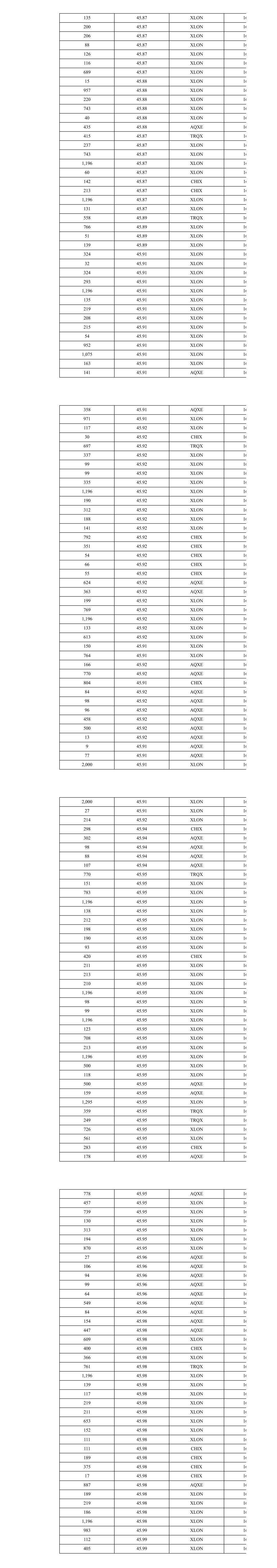 135 45.87 XLON 16 200 45.87 XLON 16 206 45.87 XLON 16 88 45.87 XLON 16 126 45.87 XLON 16 116 45.87 XLON 16 689 45.87 XLON 16 15 45.88 XLON 16 957 45.88 XLON 16 220 45.88 XLON 16 743 45.88 XLON 16 40 45.88 XLON 16 435 45.88 AQXE 16 415 45.87 TRQX 16 237 45.87 XLON 16 743 45.87 XLON 16 1,196 45.87 XLON 16 60 45.87 XLON 16 142 45.87 CHIX 16 213 45.87 CHIX 16 1,196 45.87 XLON 16 131 45.87 XLON 16 558 45.89 TRQX 16 766 45.89 XLON 16 51 45.89 XLON 16 139 45.89 XLON 16 324 45.91 XLON 16 32 45.91 XLON 16 324 45.91 XLON 16 293 45.91 XLON 16 1,196 45.91 XLON 16 135 45.91 XLON 16 219 45.91 XLON 16 208 45.91 XLON 16 215 45.91 XLON 16 54 45.91 XLON 16 952 45.91 XLON 16 1,075 45.91 XLON 16 163 45.91 XLON 16 141 45.91 AQXE 16 358 45.91 AQXE 16 971 45.91 XLON 16 117 45.92 XLON 16 30 45.92 CHIX 16 697 45.92 TRQX 16 337 45.92 XLON 16 99 45.92 XLON 16 99 45.92 XLON 16 335 45.92 XLON 16 1,196 45.92 XLON 16 190 45.92 XLON 16 312 45.92 XLON 16 188 45.92 XLON 16 141 45.92 XLON 16 792 45.92 CHIX 16 351 45.92 CHIX 16 54 45.92 CHIX 16 66 45.92 CHIX 16 55 45.92 CHIX 16 624 45.92 AQXE 16 363 45.92 AQXE 16 199 45.92 XLON 16 769 45.92 XLON 16 1,196 45.92 XLON 16 133 45.92 XLON 16 613 45.92 XLON 16 150 45.91 XLON 16 764 45.91 XLON 16 166 45.92 AQXE 16 770 45.92 AQXE 16 804 45.91 CHIX 16 84 45.92 AQXE 16 98 45.92 AQXE 16 96 45.92 AQXE 16 458 45.92 AQXE 16 500 45.92 AQXE 16 13 45.92 AQXE 16 9 45.91 AQXE 16 77 45.91 AQXE 16 2,000 45.91 XLON 16 2,000 45.91 XLON 16 27 45.91 XLON 16 214 45.92 XLON 16 298 45.94 CHIX 16 302 45.94 AQXE 16 98 45.94 AQXE 16 88 45.94 AQXE 16 107 45.94 AQXE 16 770 45.95 TRQX 16 151 45.95 XLON 16 783 45.95 XLON 16 1,196 45.95 XLON 16 138 45.95 XLON 16 212 45.95 XLON 16 198 45.95 XLON 16 190 45.95 XLON 16 93 45.95 XLON 16 420 45.95 CHIX 16 211 45.95 XLON 16 213 45.95 XLON 16 210 45.95 XLON 16 1,196 45.95 XLON 16 98 45.95 XLON 16 99 45.95 XLON 16 1,196 45.95 XLON 16 123 45.95 XLON 16 708 45.95 XLON 16 213 45.95 XLON 16 1,196 45.95 XLON 16 500 45.95 XLON 16 118 45.95 XLON 16 500 45.95 AQXE 16 159 45.95 AQXE 16 1,295 45.95 XLON 16 359 45.95 TRQX 16 249 45.95 TRQX 16 726 45.95 XLON 16 561 45.95 XLON 16 283 45.95 CHIX 16 178 45.95 AQXE 16 778 45.95 AQXE 16 457 45.95 XLON 16 739 45.95 XLON 16 130 45.95 XLON 16 313 45.95 XLON 16 194 45.95 XLON 16 870 45.95 XLON 16 27 45.96 AQXE 16 106 45.96 AQXE 16 94 45.96 AQXE 16 99 45.96 AQXE 16 64 45.96 AQXE 16 549 45.96 AQXE 16 84 45.96 AQXE 16 154 45.98 AQXE 16 447 45.98 AQXE 16 609 45.98 XLON 16 400 45.98 CHIX 16 366 45.98 XLON 16 761 45.98 TRQX 16 1,196 45.98 XLON 16 139 45.98 XLON 16 117 45.98 XLON 16 219 45.98 XLON 16 211 45.98 XLON 16 653 45.98 XLON 16 152 45.98 XLON 16 111 45.98 XLON 16 111 45.98 CHIX 16 189 45.98 CHIX 16 375 45.98 CHIX 16 17 45.98 CHIX 16 887 45.98 AQXE 16 189 45.98 XLON 16 219 45.98 XLON 16 186 45.98 XLON 16 1,196 45.98 XLON 16 983 45.99 XLON 16 112 45.99 XLON 16 405 45.99 XLON 16