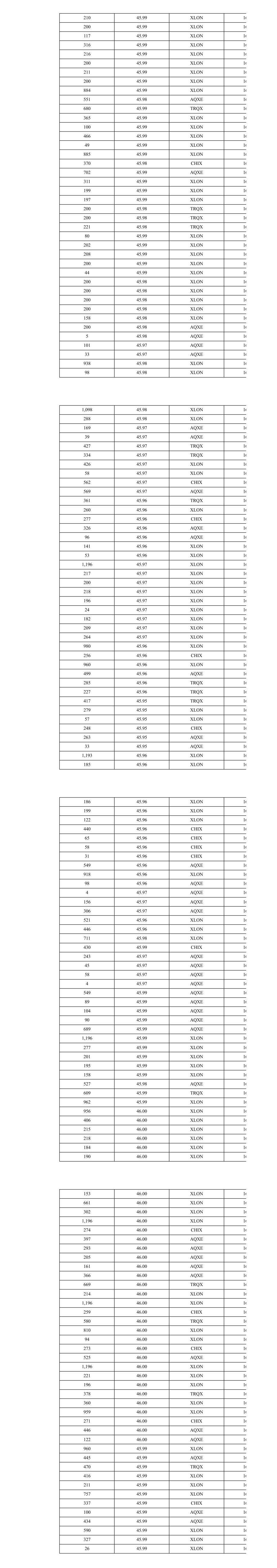 210 45.99 XLON 16 200 45.99 XLON 16 117 45.99 XLON 16 316 45.99 XLON 16 216 45.99 XLON 16 200 45.99 XLON 16 211 45.99 XLON 16 200 45.99 XLON 16 884 45.99 XLON 16 551 45.98 AQXE 16 680 45.99 TRQX 16 365 45.99 XLON 16 100 45.99 XLON 16 466 45.99 XLON 16 49 45.99 XLON 16 885 45.99 XLON 16 370 45.98 CHIX 16 702 45.99 AQXE 16 311 45.99 XLON 16 199 45.99 XLON 16 197 45.99 XLON 16 200 45.98 TRQX 16 200 45.98 TRQX 16 221 45.98 TRQX 16 80 45.99 XLON 16 202 45.99 XLON 16 208 45.99 XLON 16 200 45.99 XLON 16 44 45.99 XLON 16 200 45.98 XLON 16 200 45.98 XLON 16 200 45.98 XLON 16 200 45.98 XLON 16 158 45.98 XLON 16 200 45.98 AQXE 16 5 45.98 AQXE 16 101 45.97 AQXE 16 33 45.97 AQXE 16 938 45.98 XLON 16 98 45.98 XLON 16 1,098 45.98 XLON 16 288 45.98 XLON 16 169 45.97 AQXE 16 39 45.97 AQXE 16 427 45.97 TRQX 16 334 45.97 TRQX 16 426 45.97 XLON 16 58 45.97 XLON 16 562 45.97 CHIX 16 569 45.97 AQXE 16 361 45.96 TRQX 16 260 45.96 XLON 16 277 45.96 CHIX 16 326 45.96 AQXE 16 96 45.96 AQXE 16 141 45.96 XLON 16 53 45.96 XLON 16 1,196 45.97 XLON 16 217 45.97 XLON 16 200 45.97 XLON 16 218 45.97 XLON 16 196 45.97 XLON 16 24 45.97 XLON 16 182 45.97 XLON 16 209 45.97 XLON 16 264 45.97 XLON 16 980 45.96 XLON 16 256 45.96 CHIX 16 960 45.96 XLON 16 499 45.96 AQXE 16 285 45.96 TRQX 16 227 45.96 TRQX 16 417 45.95 TRQX 16 279 45.95 XLON 16 57 45.95 XLON 16 248 45.95 CHIX 16 263 45.95 AQXE 16 33 45.95 AQXE 16 1,193 45.96 XLON 16 185 45.96 XLON 16 186 45.96 XLON 16 199 45.96 XLON 16 122 45.96 XLON 16 440 45.96 CHIX 16 65 45.96 CHIX 16 58 45.96 CHIX 16 31 45.96 CHIX 16 549 45.96 AQXE 16 918 45.96 XLON 16 98 45.96 AQXE 16 4 45.97 AQXE 16 156 45.97 AQXE 16 306 45.97 AQXE 16 521 45.96 XLON 16 446 45.96 XLON 16 711 45.98 XLON 16 430 45.99 CHIX 16 243 45.97 AQXE 16 45 45.97 AQXE 16 58 45.97 AQXE 16 4 45.97 AQXE 16 549 45.99 AQXE 16 89 45.99 AQXE 16 104 45.99 AQXE 16 90 45.99 AQXE 16 689 45.99 AQXE 16 1,196 45.99 XLON 16 277 45.99 XLON 16 201 45.99 XLON 16 195 45.99 XLON 16 158 45.99 XLON 16 527 45.98 AQXE 16 609 45.99 TRQX 16 962 45.99 XLON 16 956 46.00 XLON 16 406 46.00 XLON 16 215 46.00 XLON 16 218 46.00 XLON 16 184 46.00 XLON 16 190 46.00 XLON 16 153 46.00 XLON 16 661 46.00 XLON 16 302 46.00 XLON 16 1,196 46.00 XLON 16 274 46.00 CHIX 16 397 46.00 AQXE 16 293 46.00 AQXE 16 205 46.00 AQXE 16 161 46.00 AQXE 16 366 46.00 AQXE 16 669 46.00 TRQX 16 214 46.00 XLON 16 1,196 46.00 XLON 16 259 46.00 CHIX 16 580 46.00 TRQX 16 810 46.00 XLON 16 94 46.00 XLON 16 273 46.00 CHIX 16 525 46.00 AQXE 16 1,196 46.00 XLON 16 221 46.00 XLON 16 196 46.00 XLON 16 378 46.00 TRQX 16 360 46.00 XLON 16 959 46.00 XLON 16 271 46.00 CHIX 16 446 46.00 AQXE 16 122 46.00 AQXE 16 960 45.99 XLON 16 445 45.99 AQXE 16 470 45.99 TRQX 16 416 45.99 XLON 16 211 45.99 XLON 16 757 45.99 XLON 16 337 45.99 CHIX 16 100 45.99 AQXE 16 434 45.99 AQXE 16 590 45.99 XLON 16 327 45.99 XLON 16 26 45.99 XLON 16