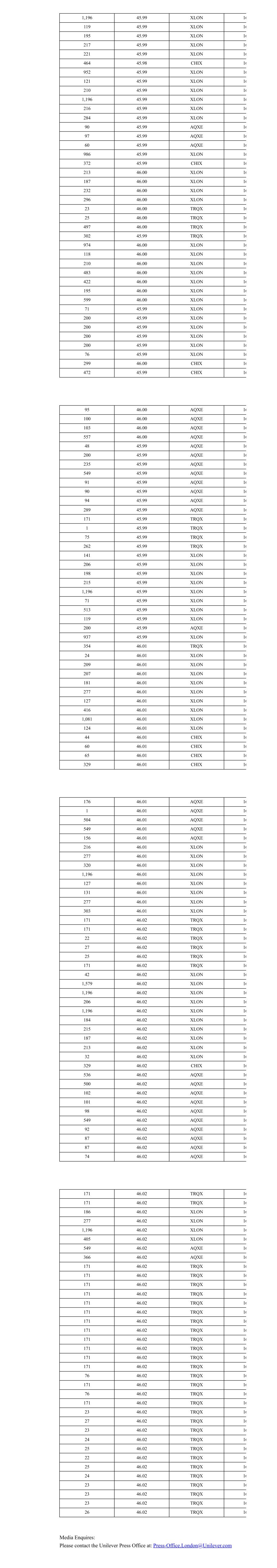 1,196 45.99 XLON 16 119 45.99 XLON 16 195 45.99 XLON 16 217 45.99 XLON 16 221 45.99 XLON 16 464 45.98 CHIX 16 952 45.99 XLON 16 121 45.99 XLON 16 210 45.99 XLON 16 1,196 45.99 XLON 16 216 45.99 XLON 16 284 45.99 XLON 16 90 45.99 AQXE 16 97 45.99 AQXE 16 60 45.99 AQXE 16 986 45.99 XLON 16 372 45.99 CHIX 16 213 46.00 XLON 16 187 46.00 XLON 16 232 46.00 XLON 16 296 46.00 XLON 16 23 46.00 TRQX 16 25 46.00 TRQX 16 497 46.00 TRQX 16 302 45.99 TRQX 16 974 46.00 XLON 16 118 46.00 XLON 16 210 46.00 XLON 16 483 46.00 XLON 16 422 46.00 XLON 16 195 46.00 XLON 16 599 46.00 XLON 16 71 45.99 XLON 16 200 45.99 XLON 16 200 45.99 XLON 16 200 45.99 XLON 16 200 45.99 XLON 16 76 45.99 XLON 16 299 46.00 CHIX 16 472 45.99 CHIX 16 95 46.00 AQXE 16 100 46.00 AQXE 16 103 46.00 AQXE 16 557 46.00 AQXE 16 48 45.99 AQXE 16 200 45.99 AQXE 16 235 45.99 AQXE 16 549 45.99 AQXE 16 91 45.99 AQXE 16 90 45.99 AQXE 16 94 45.99 AQXE 16 289 45.99 AQXE 16 171 45.99 TRQX 16 1 45.99 TRQX 16 75 45.99 TRQX 16 262 45.99 TRQX 16 141 45.99 XLON 16 206 45.99 XLON 16 198 45.99 XLON 16 215 45.99 XLON 16 1,196 45.99 XLON 16 71 45.99 XLON 16 513 45.99 XLON 16 119 45.99 XLON 16 200 45.99 AQXE 16 937 45.99 XLON 16 354 46.01 TRQX 16 24 46.01 XLON 16 209 46.01 XLON 16 207 46.01 XLON 16 181 46.01 XLON 16 277 46.01 XLON 16 127 46.01 XLON 16 416 46.01 XLON 16 1,081 46.01 XLON 16 124 46.01 XLON 16 44 46.01 CHIX 16 60 46.01 CHIX 16 65 46.01 CHIX 16 329 46.01 CHIX 16 176 46.01 AQXE 16 1 46.01 AQXE 16 504 46.01 AQXE 16 549 46.01 AQXE 16 156 46.01 AQXE 16 216 46.01 XLON 16 277 46.01 XLON 16 320 46.01 XLON 16 1,196 46.01 XLON 16 127 46.01 XLON 16 131 46.01 XLON 16 277 46.01 XLON 16 303 46.01 XLON 16 171 46.02 TRQX 16 171 46.02 TRQX 16 22 46.02 TRQX 16 27 46.02 TRQX 16 25 46.02 TRQX 16 171 46.02 TRQX 16 42 46.02 XLON 16 1,579 46.02 XLON 16 1,196 46.02 XLON 16 206 46.02 XLON 16 1,196 46.02 XLON 16 184 46.02 XLON 16 215 46.02 XLON 16 187 46.02 XLON 16 213 46.02 XLON 16 32 46.02 XLON 16 329 46.02 CHIX 16 536 46.02 AQXE 16 500 46.02 AQXE 16 102 46.02 AQXE 16 101 46.02 AQXE 16 98 46.02 AQXE 16 549 46.02 AQXE 16 92 46.02 AQXE 16 87 46.02 AQXE 16 87 46.02 AQXE 16 74 46.02 AQXE 16 171 46.02 TRQX 16 171 46.02 TRQX 16 186 46.02 XLON 16 277 46.02 XLON 16 1,196 46.02 XLON 16 405 46.02 XLON 16 549 46.02 AQXE 16 366 46.02 AQXE 16 171 46.02 TRQX 16 171 46.02 TRQX 16 171 46.02 TRQX 16 171 46.02 TRQX 16 171 46.02 TRQX 16 171 46.02 TRQX 16 171 46.02 TRQX 16 171 46.02 TRQX 16 171 46.02 TRQX 16 171 46.02 TRQX 16 171 46.02 TRQX 16 171 46.02 TRQX 16 76 46.02 TRQX 16 171 46.02 TRQX 16 76 46.02 TRQX 16 171 46.02 TRQX 16 23 46.02 TRQX 16 27 46.02 TRQX 16 23 46.02 TRQX 16 24 46.02 TRQX 16 25 46.02 TRQX 16 22 46.02 TRQX 16 25 46.02 TRQX 16 24 46.02 TRQX 16 23 46.02 TRQX 16 23 46.02 TRQX 16 23 46.02 TRQX 16 26 46.02 TRQX 16 Media Enquires: Please contact the Unilever Press Office at: Press-Office.London@Unilever.com