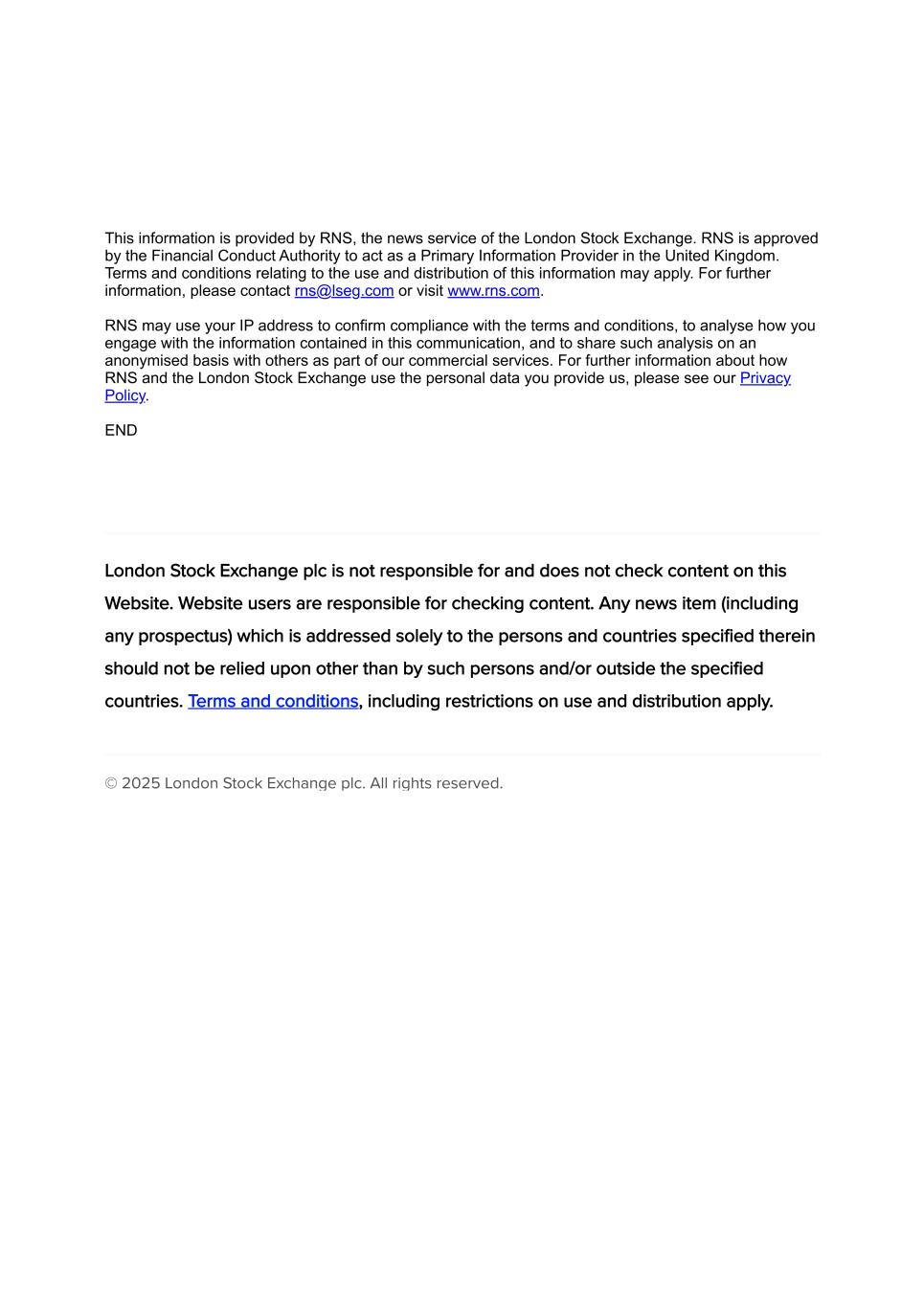 This information is provided by RNS, the news service of the London Stock Exchange. RNS is approved by the Financial Conduct Authority to act as a Primary Information Provider in the United Kingdom. Terms and conditions relating to the use and distribution of this information may apply. For further information, please contact rns@lseg.com or visit www.rns.com. RNS may use your IP address to confirm compliance with the terms and conditions, to analyse how you engage with the information contained in this communication, and to share such analysis on an anonymised basis with others as part of our commercial services. For further information about how RNS and the London Stock Exchange use the personal data you provide us, please see our Privacy Policy. END London Stock Exchange plc is not responsible for and does not check content on this Website. Website users are responsible for checking content. Any news item (including any prospectus) which is addressed solely to the persons and countries specified therein should not be relied upon other than by such persons and/or outside the specified countries. Terms and conditions, including restrictions on use and distribution apply. © 2025 London Stock Exchange plc. All rights reserved.