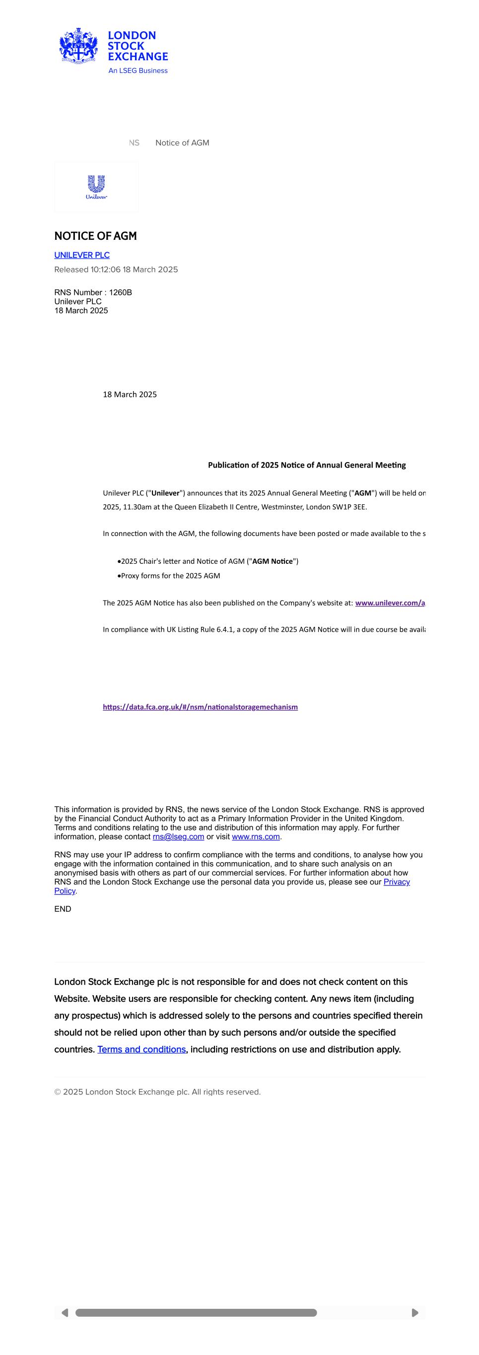 RNS Notice of AGM NOTICE OF AGM UNILEVER PLC Released 10:12:06 18 March 2025 RNS Number : 1260B Unilever PLC 18 March 2025 18 March 2025 Publication of 2025 Notice of Annual General Meeting Unilever PLC ("Unilever") announces that its 2025 Annual General Meeting ("AGM") will be held on 2025, 11.30am at the Queen Elizabeth II Centre, Westminster, London SW1P 3EE. In connection with the AGM, the following documents have been posted or made available to the s ·2025 Chair's letter and Notice of AGM ("AGM Notice") ·Proxy forms for the 2025 AGM The 2025 AGM Notice has also been published on the Company's website at: www.unilever.com/ag In compliance with UK Listing Rule 6.4.1, a copy of the 2025 AGM Notice will in due course be availa   https://data.fca.org.uk/#/nsm/nationalstoragemechanism This information is provided by RNS, the news service of the London Stock Exchange. RNS is approved by the Financial Conduct Authority to act as a Primary Information Provider in the United Kingdom. Terms and conditions relating to the use and distribution of this information may apply. For further information, please contact rns@lseg.com or visit www.rns.com. RNS may use your IP address to confirm compliance with the terms and conditions, to analyse how you engage with the information contained in this communication, and to share such analysis on an anonymised basis with others as part of our commercial services. For further information about how RNS and the London Stock Exchange use the personal data you provide us, please see our Privacy Policy. END London Stock Exchange plc is not responsible for and does not check content on this Website. Website users are responsible for checking content. Any news item (including any prospectus) which is addressed solely to the persons and countries specified therein should not be relied upon other than by such persons and/or outside the specified countries. Terms and conditions, including restrictions on use and distribution apply. © 2025 London Stock Exchange plc. All rights reserved.