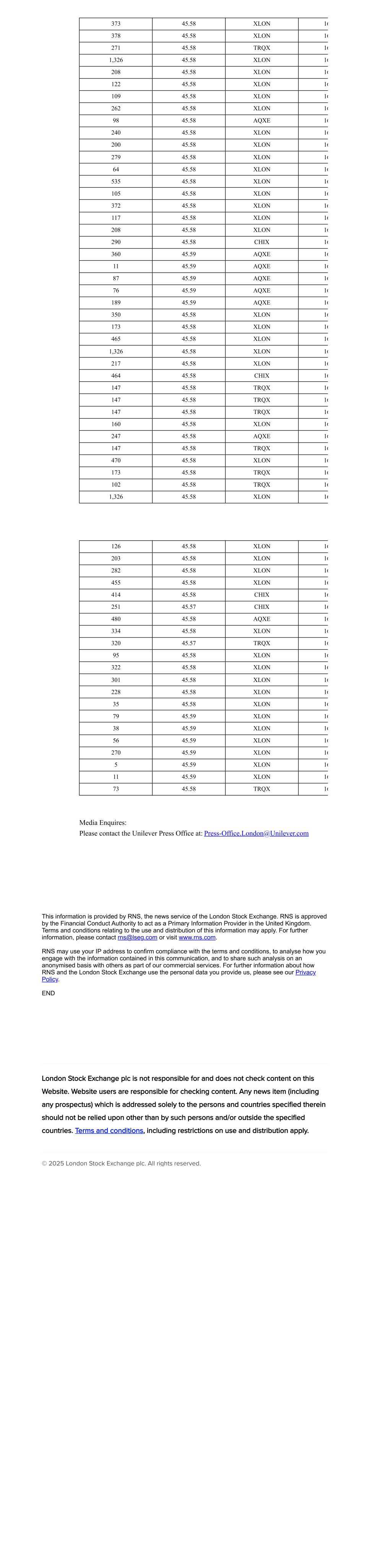373 45.58 XLON 16 378 45.58 XLON 16 271 45.58 TRQX 16 1,326 45.58 XLON 16 208 45.58 XLON 16 122 45.58 XLON 16 109 45.58 XLON 16 262 45.58 XLON 16 98 45.58 AQXE 16 240 45.58 XLON 16 200 45.58 XLON 16 279 45.58 XLON 16 64 45.58 XLON 16 535 45.58 XLON 16 105 45.58 XLON 16 372 45.58 XLON 16 117 45.58 XLON 16 208 45.58 XLON 16 290 45.58 CHIX 16 360 45.59 AQXE 16 11 45.59 AQXE 16 87 45.59 AQXE 16 76 45.59 AQXE 16 189 45.59 AQXE 16 350 45.58 XLON 16 173 45.58 XLON 16 465 45.58 XLON 16 1,326 45.58 XLON 16 217 45.58 XLON 16 464 45.58 CHIX 16 147 45.58 TRQX 16 147 45.58 TRQX 16 147 45.58 TRQX 16 160 45.58 XLON 16 247 45.58 AQXE 16 147 45.58 TRQX 16 470 45.58 XLON 16 173 45.58 TRQX 16 102 45.58 TRQX 16 1,326 45.58 XLON 16 126 45.58 XLON 16 203 45.58 XLON 16 282 45.58 XLON 16 455 45.58 XLON 16 414 45.58 CHIX 16 251 45.57 CHIX 16 480 45.58 AQXE 16 334 45.58 XLON 16 320 45.57 TRQX 16 95 45.58 XLON 16 322 45.58 XLON 16 301 45.58 XLON 16 228 45.58 XLON 16 35 45.58 XLON 16 79 45.59 XLON 16 38 45.59 XLON 16 56 45.59 XLON 16 270 45.59 XLON 16 5 45.59 XLON 16 11 45.59 XLON 16 73 45.58 TRQX 16 Media Enquires: Please contact the Unilever Press Office at: Press-Office.London@Unilever.com This information is provided by RNS, the news service of the London Stock Exchange. RNS is approved by the Financial Conduct Authority to act as a Primary Information Provider in the United Kingdom. Terms and conditions relating to the use and distribution of this information may apply. For further information, please contact rns@lseg.com or visit www.rns.com. RNS may use your IP address to confirm compliance with the terms and conditions, to analyse how you engage with the information contained in this communication, and to share such analysis on an anonymised basis with others as part of our commercial services. For further information about how RNS and the London Stock Exchange use the personal data you provide us, please see our Privacy Policy. END London Stock Exchange plc is not responsible for and does not check content on this Website. Website users are responsible for checking content. Any news item (including any prospectus) which is addressed solely to the persons and countries specified therein should not be relied upon other than by such persons and/or outside the specified countries. Terms and conditions, including restrictions on use and distribution apply. © 2025 London Stock Exchange plc. All rights reserved.