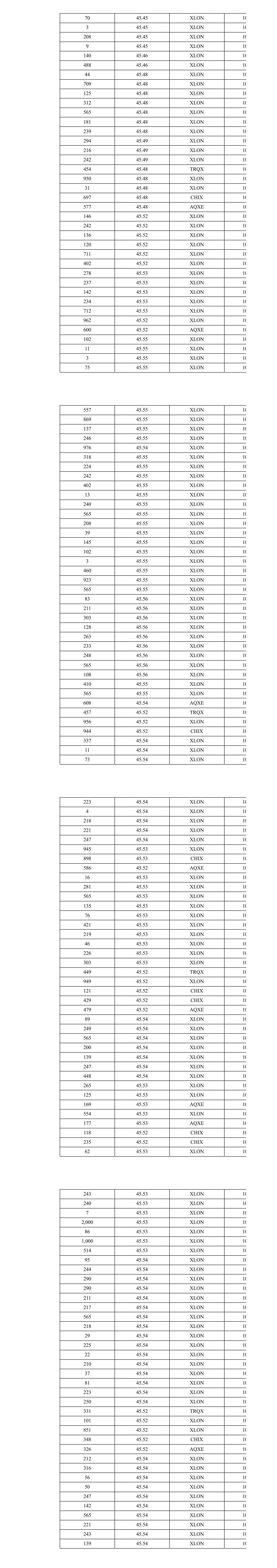 70 45.45 XLON 10 3 45.45 XLON 10 208 45.45 XLON 10 9 45.45 XLON 10 140 45.46 XLON 10 488 45.46 XLON 10 44 45.48 XLON 10 709 45.48 XLON 10 125 45.48 XLON 10 312 45.48 XLON 10 565 45.48 XLON 10 181 45.48 XLON 10 239 45.48 XLON 10 294 45.49 XLON 10 216 45.49 XLON 10 242 45.49 XLON 10 454 45.48 TRQX 10 950 45.48 XLON 10 31 45.48 XLON 10 697 45.48 CHIX 10 577 45.48 AQXE 10 146 45.52 XLON 10 242 45.52 XLON 10 136 45.52 XLON 10 120 45.52 XLON 10 711 45.52 XLON 10 402 45.52 XLON 10 278 45.53 XLON 10 237 45.53 XLON 10 142 45.53 XLON 10 234 45.53 XLON 10 712 45.53 XLON 10 962 45.52 XLON 10 600 45.52 AQXE 10 102 45.55 XLON 10 11 45.55 XLON 10 3 45.55 XLON 10 75 45.55 XLON 10 557 45.55 XLON 10 869 45.55 XLON 10 137 45.55 XLON 10 246 45.55 XLON 10 976 45.54 XLON 10 318 45.55 XLON 10 224 45.55 XLON 10 242 45.55 XLON 10 402 45.55 XLON 10 13 45.55 XLON 10 240 45.55 XLON 10 565 45.55 XLON 10 208 45.55 XLON 10 39 45.55 XLON 10 145 45.55 XLON 10 102 45.55 XLON 10 3 45.55 XLON 10 460 45.55 XLON 10 923 45.55 XLON 10 565 45.55 XLON 10 83 45.56 XLON 10 211 45.56 XLON 10 303 45.56 XLON 10 128 45.56 XLON 10 263 45.56 XLON 10 233 45.56 XLON 10 248 45.56 XLON 10 565 45.56 XLON 10 108 45.56 XLON 10 410 45.55 XLON 10 565 45.55 XLON 10 608 45.54 AQXE 10 457 45.52 TRQX 10 956 45.52 XLON 10 944 45.52 CHIX 10 337 45.54 XLON 10 11 45.54 XLON 10 73 45.54 XLON 10 223 45.54 XLON 10 4 45.54 XLON 10 218 45.54 XLON 10 221 45.54 XLON 10 247 45.54 XLON 10 945 45.53 XLON 10 898 45.53 CHIX 10 586 45.52 AQXE 10 16 45.53 XLON 10 281 45.53 XLON 10 565 45.53 XLON 10 135 45.53 XLON 10 76 45.53 XLON 10 421 45.53 XLON 10 219 45.53 XLON 10 46 45.53 XLON 10 226 45.53 XLON 10 303 45.53 XLON 10 449 45.52 TRQX 10 949 45.52 XLON 10 121 45.52 CHIX 10 429 45.52 CHIX 10 479 45.52 AQXE 10 89 45.54 XLON 10 249 45.54 XLON 10 565 45.54 XLON 10 200 45.54 XLON 10 139 45.54 XLON 10 247 45.54 XLON 10 448 45.54 XLON 10 265 45.53 XLON 10 125 45.53 XLON 10 169 45.53 AQXE 10 554 45.53 XLON 10 177 45.53 AQXE 10 118 45.52 CHIX 10 235 45.52 CHIX 10 62 45.53 XLON 10 243 45.53 XLON 10 240 45.53 XLON 10 7 45.53 XLON 10 2,000 45.53 XLON 10 86 45.53 XLON 10 1,000 45.53 XLON 10 514 45.53 XLON 10 95 45.54 XLON 10 244 45.54 XLON 10 290 45.54 XLON 10 290 45.54 XLON 10 211 45.54 XLON 10 217 45.54 XLON 10 565 45.54 XLON 10 218 45.54 XLON 10 29 45.54 XLON 10 225 45.54 XLON 10 22 45.54 XLON 10 210 45.54 XLON 10 37 45.54 XLON 10 81 45.54 XLON 10 223 45.54 XLON 10 250 45.54 XLON 10 331 45.52 TRQX 10 101 45.52 XLON 10 851 45.52 XLON 10 348 45.52 CHIX 10 326 45.52 AQXE 10 212 45.54 XLON 10 316 45.54 XLON 10 56 45.54 XLON 10 50 45.54 XLON 10 247 45.54 XLON 10 142 45.54 XLON 10 565 45.54 XLON 10 221 45.54 XLON 10 243 45.54 XLON 10 139 45.54 XLON 10