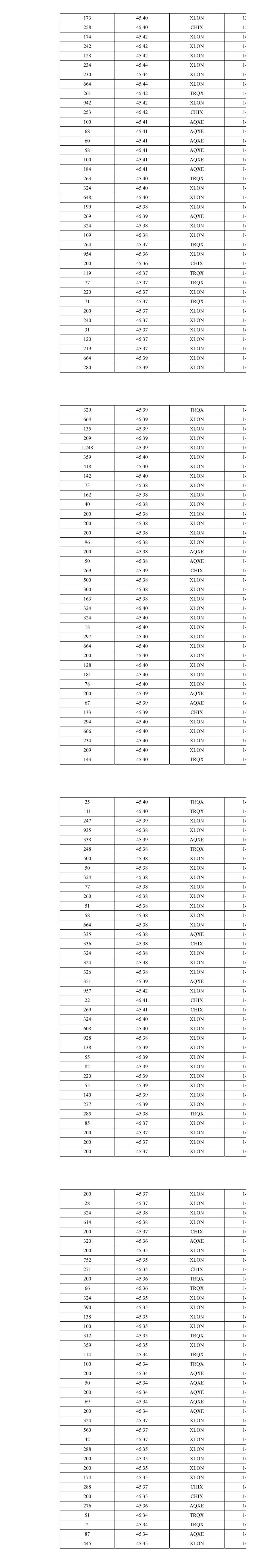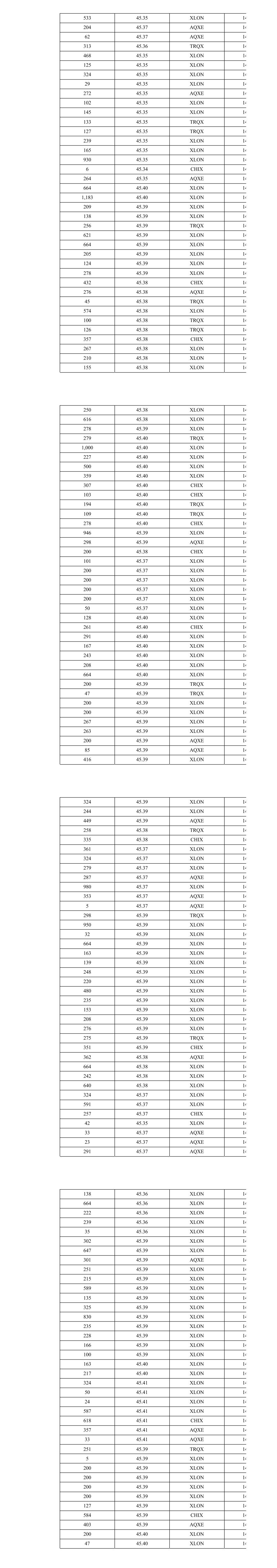 173 45.40 XLON 13 258 45.40 CHIX 13 174 45.42 XLON 14 242 45.42 XLON 14 128 45.42 XLON 14 234 45.44 XLON 14 230 45.44 XLON 14 664 45.44 XLON 14 261 45.42 TRQX 14 942 45.42 XLON 14 253 45.42 CHIX 14 100 45.41 AQXE 14 68 45.41 AQXE 14 60 45.41 AQXE 14 58 45.41 AQXE 14 100 45.41 AQXE 14 184 45.41 AQXE 14 263 45.40 TRQX 14 324 45.40 XLON 14 648 45.40 XLON 14 199 45.38 XLON 14 269 45.39 AQXE 14 324 45.38 XLON 14 109 45.38 XLON 14 264 45.37 TRQX 14 954 45.36 XLON 14 200 45.36 CHIX 14 119 45.37 TRQX 14 77 45.37 TRQX 14 220 45.37 XLON 14 71 45.37 TRQX 14 200 45.37 XLON 14 240 45.37 XLON 14 31 45.37 XLON 14 120 45.37 XLON 14 219 45.37 XLON 14 664 45.39 XLON 14 280 45.39 XLON 14 329 45.39 TRQX 14 664 45.39 XLON 14 135 45.39 XLON 14 209 45.39 XLON 14 1,248 45.39 XLON 14 359 45.40 XLON 14 418 45.40 XLON 14 142 45.40 XLON 14 73 45.38 XLON 14 162 45.38 XLON 14 40 45.38 XLON 14 200 45.38 XLON 14 200 45.38 XLON 14 200 45.38 XLON 14 96 45.38 XLON 14 200 45.38 AQXE 14 50 45.38 AQXE 14 269 45.39 CHIX 14 500 45.38 XLON 14 300 45.38 XLON 14 163 45.38 XLON 14 324 45.40 XLON 14 324 45.40 XLON 14 18 45.40 XLON 14 297 45.40 XLON 14 664 45.40 XLON 14 200 45.40 XLON 14 128 45.40 XLON 14 181 45.40 XLON 14 78 45.40 XLON 14 200 45.39 AQXE 14 67 45.39 AQXE 14 133 45.39 CHIX 14 294 45.40 XLON 14 666 45.40 XLON 14 234 45.40 XLON 14 209 45.40 XLON 14 143 45.40 TRQX 14 25 45.40 TRQX 14 111 45.40 TRQX 14 247 45.39 XLON 14 935 45.38 XLON 14 338 45.39 AQXE 14 248 45.38 TRQX 14 500 45.38 XLON 14 50 45.38 XLON 14 324 45.38 XLON 14 77 45.38 XLON 14 260 45.38 XLON 14 51 45.38 XLON 14 58 45.38 XLON 14 664 45.38 XLON 14 335 45.38 AQXE 14 336 45.38 CHIX 14 324 45.38 XLON 14 324 45.38 XLON 14 326 45.38 XLON 14 351 45.39 AQXE 14 957 45.42 XLON 14 22 45.41 CHIX 14 269 45.41 CHIX 14 324 45.40 XLON 14 608 45.40 XLON 14 928 45.38 XLON 14 138 45.39 XLON 14 55 45.39 XLON 14 82 45.39 XLON 14 220 45.39 XLON 14 55 45.39 XLON 14 140 45.39 XLON 14 277 45.39 XLON 14 285 45.38 TRQX 14 85 45.37 XLON 14 200 45.37 XLON 14 200 45.37 XLON 14 200 45.37 XLON 14 200 45.37 XLON 14 28 45.37 XLON 14 324 45.38 XLON 14 614 45.38 XLON 14 200 45.37 CHIX 14 320 45.36 AQXE 14 200 45.35 XLON 14 752 45.35 XLON 14 271 45.35 CHIX 14 200 45.36 TRQX 14 66 45.36 TRQX 14 324 45.35 XLON 14 590 45.35 XLON 14 138 45.35 XLON 14 100 45.35 XLON 14 312 45.35 TRQX 14 359 45.35 XLON 14 114 45.34 TRQX 14 100 45.34 TRQX 14 200 45.34 AQXE 14 50 45.34 AQXE 14 200 45.34 AQXE 14 69 45.34 AQXE 14 200 45.34 AQXE 14 324 45.37 XLON 14 560 45.37 XLON 14 42 45.37 XLON 14 288 45.35 XLON 14 200 45.35 XLON 14 200 45.35 XLON 14 174 45.35 XLON 14 288 45.37 CHIX 14 200 45.35 CHIX 14 276 45.36 AQXE 14 51 45.34 TRQX 14 2 45.34 TRQX 14 87 45.34 AQXE 14 445 45.35 XLON 14