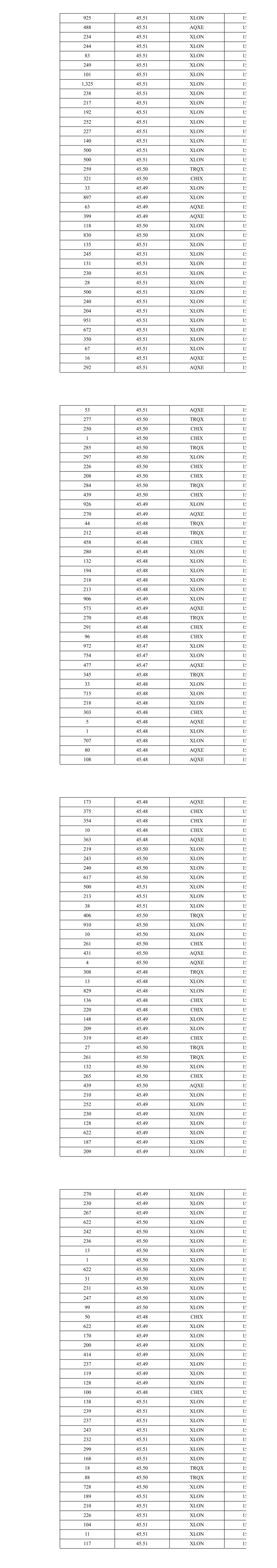 147 45.44 AQXE 12 101 45.44 AQXE 12 955 45.43 XLON 12 163 45.43 AQXE 12 106 45.43 AQXE 12 198 45.44 CHIX 12 110 45.45 XLON 12 466 45.45 XLON 12 256 45.44 CHIX 12 12 45.44 CHIX 12 17 45.44 CHIX 12 183 45.44 XLON 12 33 45.45 TRQX 12 270 45.45 TRQX 12 940 45.45 XLON 12 253 45.45 AQXE 12 292 45.47 TRQX 12 957 45.47 XLON 12 192 45.47 XLON 12 307 45.47 TRQX 12 191 45.47 XLON 12 954 45.47 XLON 12 530 45.46 XLON 12 335 45.46 XLON 12 233 45.46 XLON 12 530 45.46 XLON 12 191 45.46 XLON 12 530 45.46 XLON 12 192 45.46 XLON 12 55 45.46 XLON 12 277 45.47 TRQX 12 324 45.47 XLON 12 620 45.47 XLON 12 31 45.46 CHIX 12 190 45.46 XLON 12 217 45.46 XLON 12 249 45.46 XLON 12 217 45.46 XLON 12 206 45.46 XLON 12 231 45.46 CHIX 12 115 45.45 TRQX 12 180 45.45 TRQX 12 324 45.45 XLON 12 198 45.45 XLON 12 424 45.45 XLON 12 110 45.46 XLON 12 302 45.46 TRQX 12 95 45.46 XLON 12 106 45.46 XLON 12 144 45.47 XLON 12 156 45.47 XLON 12 118 45.47 XLON 12 250 45.47 XLON 12 251 45.47 XLON 12 133 45.47 XLON 12 127 45.47 XLON 12 29 45.47 XLON 12 104 45.47 XLON 12 142 45.47 XLON 12 150 45.46 XLON 12 327 45.46 TRQX 12 162 45.46 XLON 12 150 45.47 CHIX 12 973 45.47 XLON 12 69 45.47 CHIX 12 31 45.47 CHIX 12 51 45.47 AQXE 12 213 45.47 AQXE 12 17 45.46 TRQX 12 16 45.46 TRQX 12 15 45.46 TRQX 12 252 45.46 TRQX 12 959 45.45 XLON 12 260 45.45 CHIX 12 218 45.49 XLON 12 260 45.49 CHIX 12 354 45.49 AQXE 12 224 45.49 XLON 12 245 45.49 XLON 12 47 45.49 AQXE 12 254 45.49 XLON 12 225 45.49 XLON 12 226 45.49 XLON 12 282 45.49 XLON 12 225 45.49 XLON 12 144 45.49 XLON 12 220 45.49 XLON 12 1,497 45.49 XLON 12 230 45.50 XLON 12 17 45.50 XLON 12 247 45.50 XLON 12 248 45.49 CHIX 12 135 45.49 XLON 12 255 45.49 AQXE 12 127 45.49 CHIX 12 67 45.49 CHIX 12 172 45.50 XLON 12 174 45.50 XLON 12 270 45.50 XLON 12 4 45.50 XLON 12 148 45.50 XLON 12 312 45.50 XLON 12 194 45.50 XLON 12 362 45.49 AQXE 12 182 45.48 TRQX 12 837 45.48 XLON 12 143 45.48 XLON 12 121 45.48 TRQX 12 259 45.49 XLON 13 691 45.49 XLON 13 365 45.49 CHIX 13 343 45.49 AQXE 13 314 45.49 AQXE 13 286 45.48 TRQX 13 666 45.48 XLON 13 281 45.48 XLON 13 268 45.50 TRQX 13 324 45.50 XLON 13 50 45.50 XLON 13 601 45.50 XLON 13 462 45.51 XLON 13 526 45.51 XLON 13 326 45.51 CHIX 13 183 45.51 CHIX 13 163 45.51 CHIX 13 105 45.51 AQXE 13 268 45.51 AQXE 13 140 45.50 TRQX 13 9 45.50 TRQX 13 154 45.50 TRQX 13 9 45.49 AQXE 13 440 45.49 CHIX 13 308 45.49 AQXE 13 14 45.48 TRQX 13 260 45.48 TRQX 13 901 45.48 XLON 13 56 45.48 XLON 13 106 45.48 TRQX 13 194 45.48 TRQX 13 150 45.47 AQXE 13 256 45.47 CHIX 13 126 45.47 AQXE 13 263 45.46 XLON 13 292 45.48 TRQX 13 683 45.48 XLON 13 237 45.48 XLON 13 306 45.48 TRQX 13 33 45.48 TRQX 13 270 45.48 TRQX 13 130 45.49 XLON 13 597 45.49 XLON 13 3 45.48 XLON 13