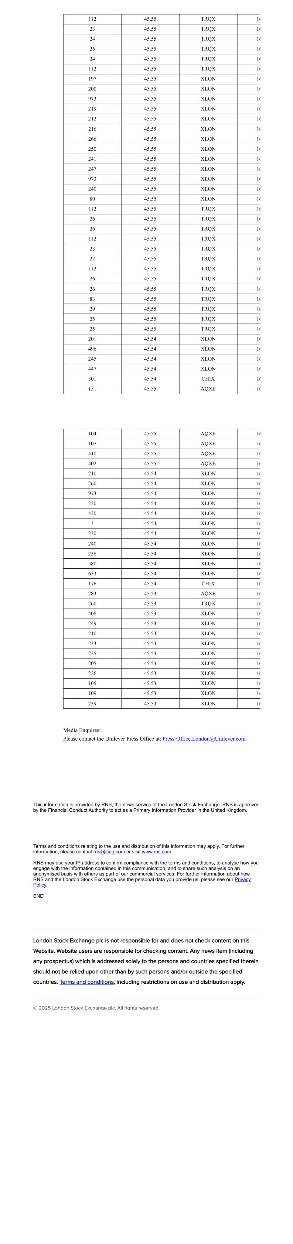 112 45.55 TRQX 16 23 45.55 TRQX 16 24 45.55 TRQX 16 26 45.55 TRQX 16 24 45.55 TRQX 16 112 45.55 TRQX 16 197 45.55 XLON 16 200 45.55 XLON 16 973 45.55 XLON 16 219 45.55 XLON 16 212 45.55 XLON 16 216 45.55 XLON 16 266 45.55 XLON 16 250 45.55 XLON 16 241 45.55 XLON 16 247 45.55 XLON 16 973 45.55 XLON 16 240 45.55 XLON 16 80 45.55 XLON 16 112 45.55 TRQX 16 26 45.55 TRQX 16 26 45.55 TRQX 16 112 45.55 TRQX 16 23 45.55 TRQX 16 27 45.55 TRQX 16 112 45.55 TRQX 16 26 45.55 TRQX 16 26 45.55 TRQX 16 83 45.55 TRQX 16 29 45.55 TRQX 16 25 45.55 TRQX 16 25 45.55 TRQX 16 201 45.54 XLON 16 496 45.54 XLON 16 245 45.54 XLON 16 447 45.54 XLON 16 301 45.54 CHIX 16 151 45.55 AQXE 16 104 45.55 AQXE 16 107 45.55 AQXE 16 410 45.55 AQXE 16 402 45.55 AQXE 16 210 45.54 XLON 16 260 45.54 XLON 16 973 45.54 XLON 16 220 45.54 XLON 16 420 45.54 XLON 16 3 45.54 XLON 16 230 45.54 XLON 16 240 45.54 XLON 16 238 45.54 XLON 16 580 45.54 XLON 16 633 45.54 XLON 16 176 45.54 CHIX 16 283 45.53 AQXE 16 260 45.53 TRQX 16 408 45.53 XLON 16 249 45.53 XLON 16 210 45.53 XLON 16 233 45.53 XLON 16 225 45.53 XLON 16 205 45.53 XLON 16 226 45.53 XLON 16 105 45.53 XLON 16 109 45.53 XLON 16 239 45.53 XLON 16 Media Enquires: Please contact the Unilever Press Office at: Press-Office.London@Unilever.com This information is provided by RNS, the news service of the London Stock Exchange. RNS is approved by the Financial Conduct Authority to act as a Primary Information Provider in the United Kingdom. Terms and conditions relating to the use and distribution of this information may apply. For further information, please contact rns@lseg.com or visit www.rns.com. RNS may use your IP address to confirm compliance with the terms and conditions, to analyse how you engage with the information contained in this communication, and to share such analysis on an anonymised basis with others as part of our commercial services. For further information about how RNS and the London Stock Exchange use the personal data you provide us, please see our Privacy Policy. END London Stock Exchange plc is not responsible for and does not check content on this Website. Website users are responsible for checking content. Any news item (including any prospectus) which is addressed solely to the persons and countries specified therein should not be relied upon other than by such persons and/or outside the specified countries. Terms and conditions, including restrictions on use and distribution apply. © 2025 London Stock Exchange plc. All rights reserved.