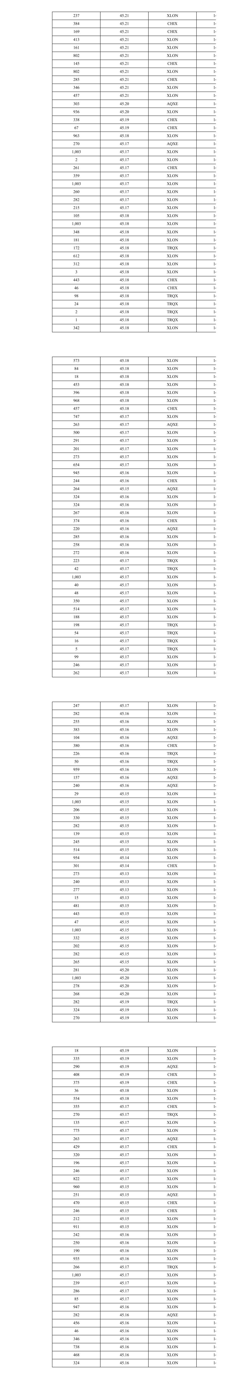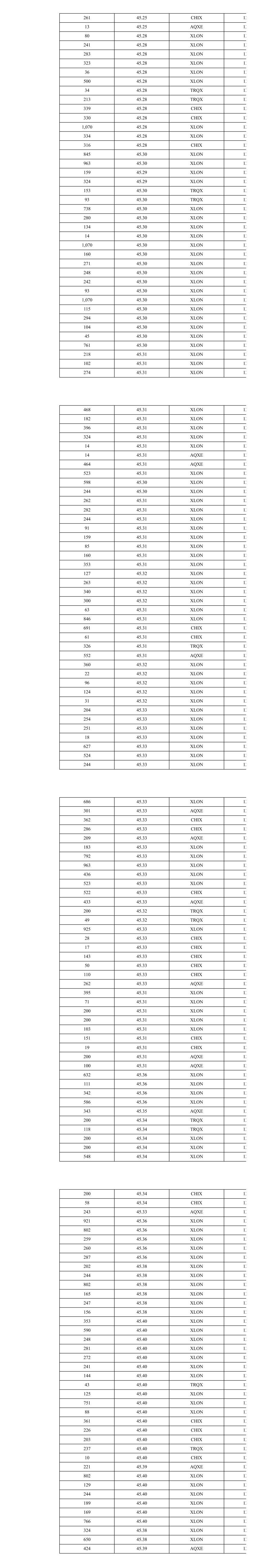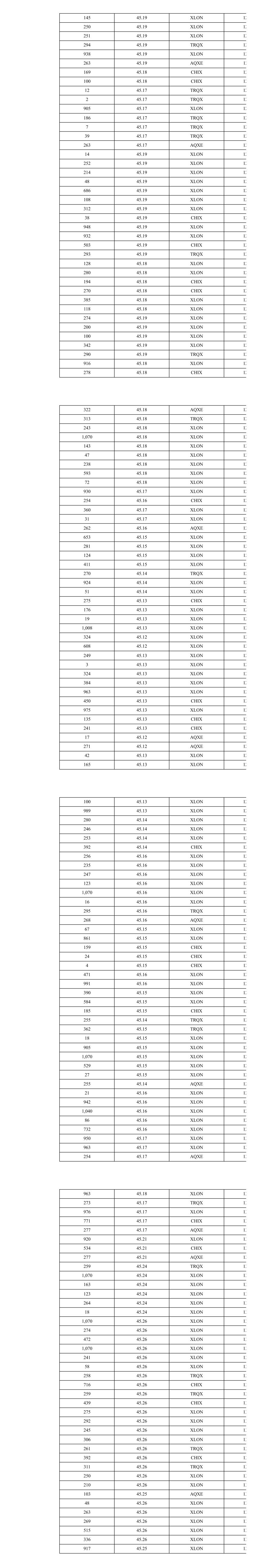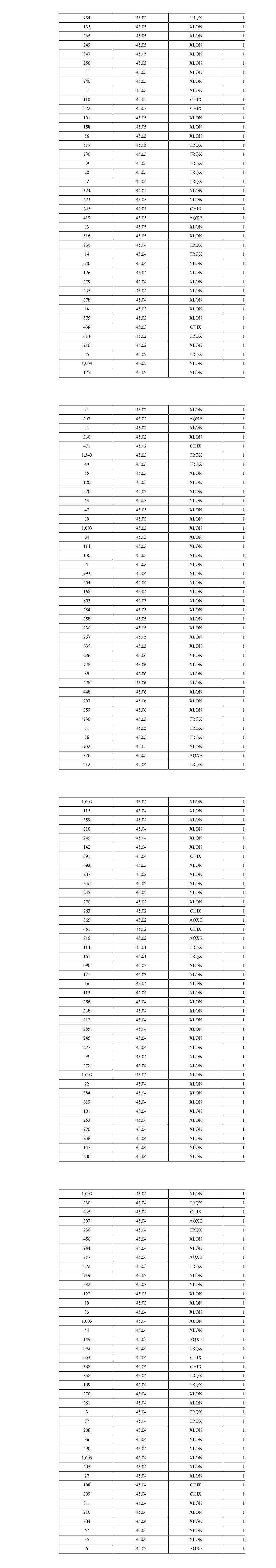 754 45.04 TRQX 16 135 45.05 XLON 16 265 45.05 XLON 16 249 45.05 XLON 16 347 45.05 XLON 16 256 45.05 XLON 16 11 45.05 XLON 16 240 45.05 XLON 16 51 45.05 XLON 16 110 45.05 CHIX 16 622 45.05 CHIX 16 101 45.05 XLON 16 158 45.05 XLON 16 56 45.05 XLON 16 517 45.05 TRQX 16 230 45.05 TRQX 16 29 45.05 TRQX 16 28 45.05 TRQX 16 32 45.05 TRQX 16 324 45.05 XLON 16 423 45.05 XLON 16 645 45.05 CHIX 16 419 45.05 AQXE 16 33 45.05 XLON 16 516 45.05 XLON 16 230 45.04 TRQX 16 14 45.04 TRQX 16 240 45.04 XLON 16 126 45.04 XLON 16 279 45.04 XLON 16 235 45.04 XLON 16 278 45.04 XLON 16 18 45.03 XLON 16 575 45.03 XLON 16 438 45.03 CHIX 16 414 45.02 TRQX 16 210 45.02 XLON 16 85 45.02 TRQX 16 1,003 45.02 XLON 16 125 45.02 XLON 16 21 45.02 XLON 16 293 45.02 AQXE 16 31 45.02 XLON 16 260 45.02 XLON 16 471 45.02 CHIX 16 1,340 45.03 TRQX 16 49 45.03 TRQX 16 55 45.03 XLON 16 120 45.03 XLON 16 270 45.03 XLON 16 64 45.03 XLON 16 47 45.03 XLON 16 39 45.03 XLON 16 1,003 45.03 XLON 16 64 45.03 XLON 16 114 45.03 XLON 16 130 45.03 XLON 16 4 45.03 XLON 16 993 45.04 XLON 16 254 45.04 XLON 16 168 45.04 XLON 16 853 45.03 XLON 16 284 45.05 XLON 16 258 45.05 XLON 16 230 45.05 XLON 16 267 45.05 XLON 16 639 45.05 XLON 16 226 45.06 XLON 16 778 45.06 XLON 16 89 45.06 XLON 16 278 45.06 XLON 16 448 45.06 XLON 16 207 45.06 XLON 16 259 45.06 XLON 16 230 45.05 TRQX 16 31 45.05 TRQX 16 26 45.05 TRQX 16 932 45.05 XLON 16 376 45.05 AQXE 16 512 45.04 TRQX 16 1,003 45.04 XLON 16 115 45.04 XLON 16 359 45.04 XLON 16 216 45.04 XLON 16 249 45.04 XLON 16 142 45.04 XLON 16 391 45.04 CHIX 16 693 45.03 XLON 16 207 45.02 XLON 16 246 45.02 XLON 16 245 45.02 XLON 16 270 45.02 XLON 16 283 45.02 CHIX 16 365 45.02 AQXE 16 451 45.02 CHIX 16 315 45.02 AQXE 16 114 45.01 TRQX 16 161 45.01 TRQX 16 690 45.03 XLON 16 121 45.03 XLON 16 16 45.04 XLON 16 113 45.04 XLON 16 256 45.04 XLON 16 268 45.04 XLON 16 212 45.04 XLON 16 285 45.04 XLON 16 245 45.04 XLON 16 277 45.04 XLON 16 99 45.04 XLON 16 278 45.04 XLON 16 1,003 45.04 XLON 16 22 45.04 XLON 16 384 45.04 XLON 16 619 45.04 XLON 16 101 45.04 XLON 16 253 45.04 XLON 16 270 45.04 XLON 16 238 45.04 XLON 16 147 45.04 XLON 16 200 45.04 XLON 16 1,003 45.04 XLON 16 230 45.04 TRQX 16 435 45.04 CHIX 16 307 45.04 AQXE 16 230 45.04 TRQX 16 450 45.04 XLON 16 244 45.04 XLON 16 317 45.04 AQXE 16 572 45.03 TRQX 16 919 45.03 XLON 16 532 45.03 XLON 16 122 45.03 XLON 16 19 45.03 XLON 16 33 45.04 XLON 16 1,003 45.04 XLON 16 44 45.04 XLON 16 149 45.03 AQXE 16 632 45.04 TRQX 16 653 45.04 CHIX 16 338 45.04 CHIX 16 358 45.04 TRQX 16 109 45.04 TRQX 16 270 45.04 XLON 16 281 45.04 XLON 16 3 45.04 TRQX 16 27 45.04 TRQX 16 208 45.04 XLON 16 36 45.04 XLON 16 290 45.04 XLON 16 1,003 45.04 XLON 16 205 45.04 XLON 16 27 45.04 XLON 16 198 45.04 CHIX 16 209 45.04 CHIX 16 311 45.04 XLON 16 216 45.04 XLON 16 784 45.04 XLON 16 67 45.05 XLON 16 35 45.04 XLON 16 6 45.03 AQXE 16