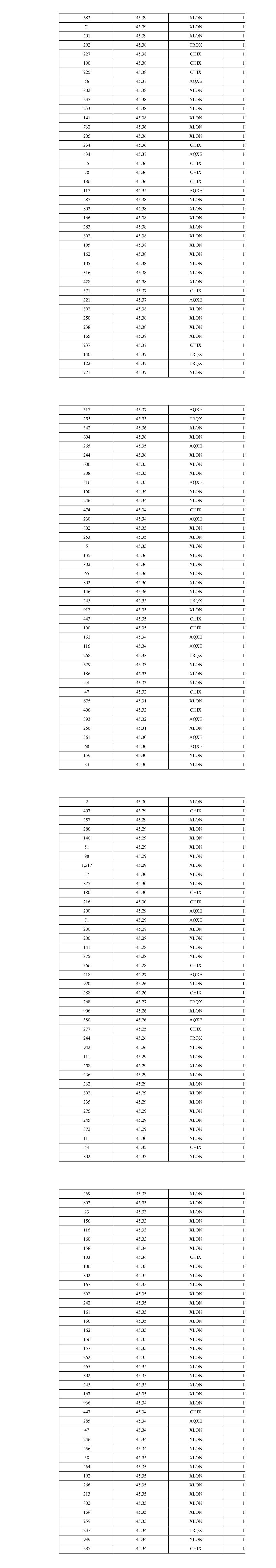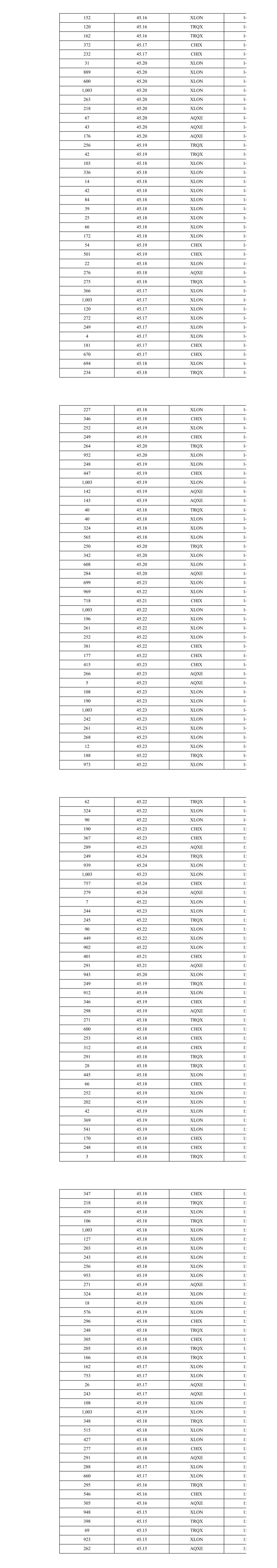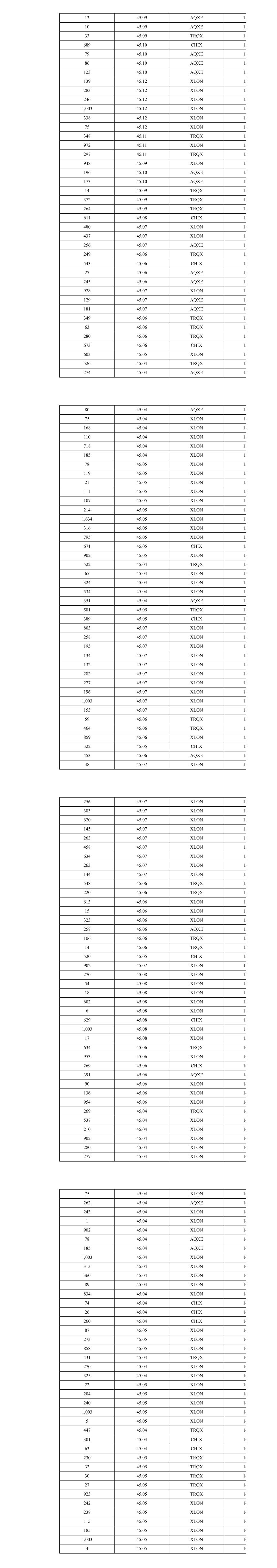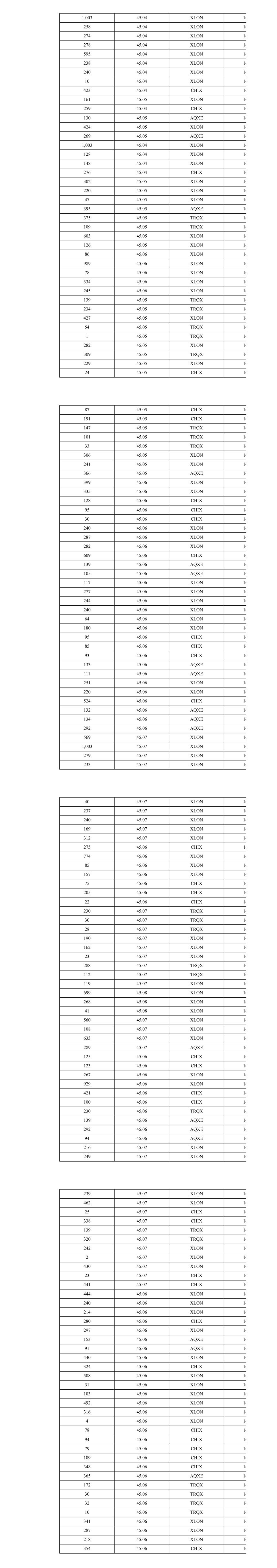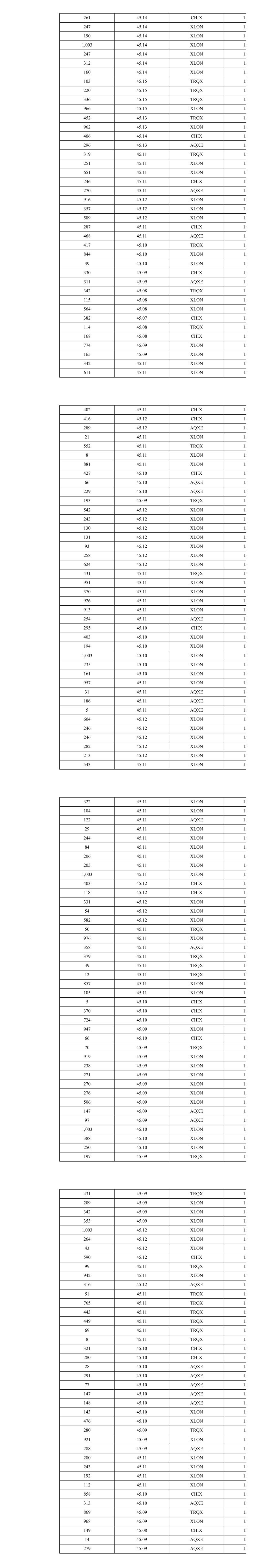 754 45.04 TRQX 16 135 45.05 XLON 16 265 45.05 XLON 16 249 45.05 XLON 16 347 45.05 XLON 16 256 45.05 XLON 16 11 45.05 XLON 16 240 45.05 XLON 16 51 45.05 XLON 16 110 45.05 CHIX 16 622 45.05 CHIX 16 101 45.05 XLON 16 158 45.05 XLON 16 56 45.05 XLON 16 517 45.05 TRQX 16 230 45.05 TRQX 16 29 45.05 TRQX 16 28 45.05 TRQX 16 32 45.05 TRQX 16 324 45.05 XLON 16 423 45.05 XLON 16 645 45.05 CHIX 16 419 45.05 AQXE 16 33 45.05 XLON 16 516 45.05 XLON 16 230 45.04 TRQX 16 14 45.04 TRQX 16 240 45.04 XLON 16 126 45.04 XLON 16 279 45.04 XLON 16 235 45.04 XLON 16 278 45.04 XLON 16 18 45.03 XLON 16 575 45.03 XLON 16 438 45.03 CHIX 16 414 45.02 TRQX 16 210 45.02 XLON 16 85 45.02 TRQX 16 1,003 45.02 XLON 16 125 45.02 XLON 16 21 45.02 XLON 16 293 45.02 AQXE 16 31 45.02 XLON 16 260 45.02 XLON 16 471 45.02 CHIX 16 1,340 45.03 TRQX 16 49 45.03 TRQX 16 55 45.03 XLON 16 120 45.03 XLON 16 270 45.03 XLON 16 64 45.03 XLON 16 47 45.03 XLON 16 39 45.03 XLON 16 1,003 45.03 XLON 16 64 45.03 XLON 16 114 45.03 XLON 16 130 45.03 XLON 16 4 45.03 XLON 16 993 45.04 XLON 16 254 45.04 XLON 16 168 45.04 XLON 16 853 45.03 XLON 16 284 45.05 XLON 16 258 45.05 XLON 16 230 45.05 XLON 16 267 45.05 XLON 16 639 45.05 XLON 16 226 45.06 XLON 16 778 45.06 XLON 16 89 45.06 XLON 16 278 45.06 XLON 16 448 45.06 XLON 16 207 45.06 XLON 16 259 45.06 XLON 16 230 45.05 TRQX 16 31 45.05 TRQX 16 26 45.05 TRQX 16 932 45.05 XLON 16 376 45.05 AQXE 16 512 45.04 TRQX 16 1,003 45.04 XLON 16 115 45.04 XLON 16 359 45.04 XLON 16 216 45.04 XLON 16 249 45.04 XLON 16 142 45.04 XLON 16 391 45.04 CHIX 16 693 45.03 XLON 16 207 45.02 XLON 16 246 45.02 XLON 16 245 45.02 XLON 16 270 45.02 XLON 16 283 45.02 CHIX 16 365 45.02 AQXE 16 451 45.02 CHIX 16 315 45.02 AQXE 16 114 45.01 TRQX 16 161 45.01 TRQX 16 690 45.03 XLON 16 121 45.03 XLON 16 16 45.04 XLON 16 113 45.04 XLON 16 256 45.04 XLON 16 268 45.04 XLON 16 212 45.04 XLON 16 285 45.04 XLON 16 245 45.04 XLON 16 277 45.04 XLON 16 99 45.04 XLON 16 278 45.04 XLON 16 1,003 45.04 XLON 16 22 45.04 XLON 16 384 45.04 XLON 16 619 45.04 XLON 16 101 45.04 XLON 16 253 45.04 XLON 16 270 45.04 XLON 16 238 45.04 XLON 16 147 45.04 XLON 16 200 45.04 XLON 16 1,003 45.04 XLON 16 230 45.04 TRQX 16 435 45.04 CHIX 16 307 45.04 AQXE 16 230 45.04 TRQX 16 450 45.04 XLON 16 244 45.04 XLON 16 317 45.04 AQXE 16 572 45.03 TRQX 16 919 45.03 XLON 16 532 45.03 XLON 16 122 45.03 XLON 16 19 45.03 XLON 16 33 45.04 XLON 16 1,003 45.04 XLON 16 44 45.04 XLON 16 149 45.03 AQXE 16 632 45.04 TRQX 16 653 45.04 CHIX 16 338 45.04 CHIX 16 358 45.04 TRQX 16 109 45.04 TRQX 16 270 45.04 XLON 16 281 45.04 XLON 16 3 45.04 TRQX 16 27 45.04 TRQX 16 208 45.04 XLON 16 36 45.04 XLON 16 290 45.04 XLON 16 1,003 45.04 XLON 16 205 45.04 XLON 16 27 45.04 XLON 16 198 45.04 CHIX 16 209 45.04 CHIX 16 311 45.04 XLON 16 216 45.04 XLON 16 784 45.04 XLON 16 67 45.05 XLON 16 35 45.04 XLON 16 6 45.03 AQXE 16