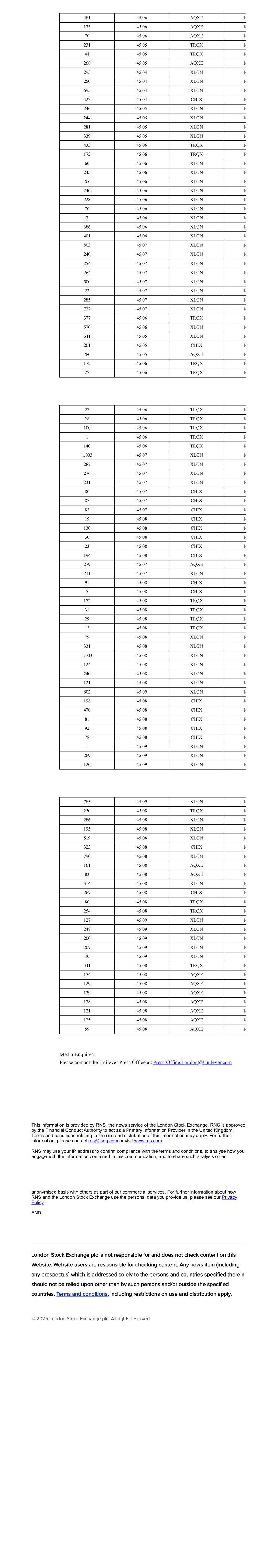 481 45.06 AQXE 16 133 45.06 AQXE 16 70 45.06 AQXE 16 231 45.05 TRQX 16 48 45.05 TRQX 16 268 45.05 AQXE 16 293 45.04 XLON 16 250 45.04 XLON 16 695 45.04 XLON 16 423 45.04 CHIX 16 246 45.05 XLON 16 244 45.05 XLON 16 281 45.05 XLON 16 339 45.05 XLON 16 433 45.06 TRQX 16 172 45.06 TRQX 16 60 45.06 XLON 16 245 45.06 XLON 16 266 45.06 XLON 16 240 45.06 XLON 16 228 45.06 XLON 16 70 45.06 XLON 16 3 45.06 XLON 16 686 45.06 XLON 16 401 45.06 XLON 16 803 45.07 XLON 16 240 45.07 XLON 16 254 45.07 XLON 16 264 45.07 XLON 16 500 45.07 XLON 16 23 45.07 XLON 16 285 45.07 XLON 16 727 45.07 XLON 16 377 45.06 TRQX 16 570 45.06 XLON 16 641 45.05 XLON 16 261 45.05 CHIX 16 280 45.05 AQXE 16 172 45.06 TRQX 16 27 45.06 TRQX 16 27 45.06 TRQX 16 28 45.06 TRQX 16 100 45.06 TRQX 16 1 45.06 TRQX 16 140 45.06 TRQX 16 1,003 45.07 XLON 16 287 45.07 XLON 16 276 45.07 XLON 16 231 45.07 XLON 16 80 45.07 CHIX 16 87 45.07 CHIX 16 82 45.07 CHIX 16 19 45.08 CHIX 16 130 45.08 CHIX 16 30 45.08 CHIX 16 23 45.08 CHIX 16 194 45.08 CHIX 16 279 45.07 AQXE 16 211 45.07 XLON 16 91 45.08 CHIX 16 5 45.08 CHIX 16 172 45.08 TRQX 16 31 45.08 TRQX 16 29 45.08 TRQX 16 12 45.08 TRQX 16 79 45.08 XLON 16 331 45.08 XLON 16 1,003 45.08 XLON 16 124 45.08 XLON 16 240 45.08 XLON 16 121 45.08 XLON 16 802 45.09 XLON 16 198 45.08 CHIX 16 470 45.08 CHIX 16 81 45.08 CHIX 16 92 45.08 CHIX 16 78 45.08 CHIX 16 1 45.09 XLON 16 269 45.09 XLON 16 120 45.09 XLON 16 785 45.09 XLON 16 250 45.08 TRQX 16 286 45.08 XLON 16 195 45.08 XLON 16 519 45.08 XLON 16 323 45.08 CHIX 16 790 45.08 XLON 16 161 45.08 AQXE 16 83 45.08 AQXE 16 314 45.08 XLON 16 267 45.08 CHIX 16 80 45.08 TRQX 16 254 45.08 TRQX 16 127 45.09 XLON 16 248 45.09 XLON 16 200 45.09 XLON 16 207 45.09 XLON 16 40 45.09 XLON 16 341 45.08 TRQX 16 154 45.08 AQXE 16 129 45.08 AQXE 16 129 45.08 AQXE 16 128 45.08 AQXE 16 121 45.08 AQXE 16 125 45.08 AQXE 16 59 45.08 AQXE 16 Media Enquires: Please contact the Unilever Press Office at: Press-Office.London@Unilever.com This information is provided by RNS, the news service of the London Stock Exchange. RNS is approved by the Financial Conduct Authority to act as a Primary Information Provider in the United Kingdom. Terms and conditions relating to the use and distribution of this information may apply. For further information, please contact rns@lseg.com or visit www.rns.com. RNS may use your IP address to confirm compliance with the terms and conditions, to analyse how you engage with the information contained in this communication, and to share such analysis on an anonymised basis with others as part of our commercial services. For further information about how RNS and the London Stock Exchange use the personal data you provide us, please see our Privacy Policy. END London Stock Exchange plc is not responsible for and does not check content on this Website. Website users are responsible for checking content. Any news item (including any prospectus) which is addressed solely to the persons and countries specified therein should not be relied upon other than by such persons and/or outside the specified countries. Terms and conditions, including restrictions on use and distribution apply. © 2025 London Stock Exchange plc. All rights reserved.
