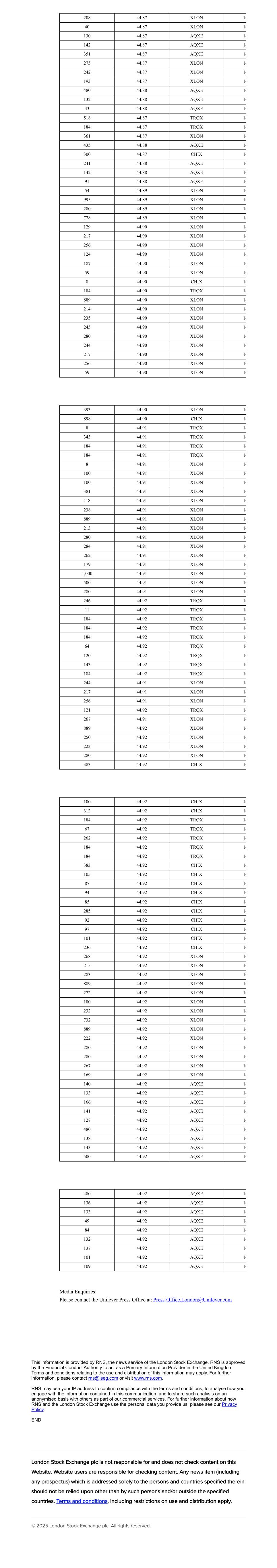 208 44.87 XLON 16 40 44.87 XLON 16 130 44.87 AQXE 16 142 44.87 AQXE 16 351 44.87 AQXE 16 275 44.87 XLON 16 242 44.87 XLON 16 193 44.87 XLON 16 480 44.88 AQXE 16 132 44.88 AQXE 16 43 44.88 AQXE 16 518 44.87 TRQX 16 184 44.87 TRQX 16 361 44.87 XLON 16 435 44.88 AQXE 16 300 44.87 CHIX 16 241 44.88 AQXE 16 142 44.88 AQXE 16 91 44.88 AQXE 16 54 44.89 XLON 16 995 44.89 XLON 16 280 44.89 XLON 16 778 44.89 XLON 16 129 44.90 XLON 16 217 44.90 XLON 16 256 44.90 XLON 16 124 44.90 XLON 16 187 44.90 XLON 16 59 44.90 XLON 16 8 44.90 CHIX 16 184 44.90 TRQX 16 889 44.90 XLON 16 214 44.90 XLON 16 235 44.90 XLON 16 245 44.90 XLON 16 280 44.90 XLON 16 244 44.90 XLON 16 217 44.90 XLON 16 256 44.90 XLON 16 59 44.90 XLON 16 393 44.90 XLON 16 898 44.90 CHIX 16 8 44.91 TRQX 16 343 44.91 TRQX 16 184 44.91 TRQX 16 184 44.91 TRQX 16 8 44.91 XLON 16 100 44.91 XLON 16 100 44.91 XLON 16 381 44.91 XLON 16 118 44.91 XLON 16 238 44.91 XLON 16 889 44.91 XLON 16 213 44.91 XLON 16 280 44.91 XLON 16 284 44.91 XLON 16 262 44.91 XLON 16 179 44.91 XLON 16 1,000 44.91 XLON 16 500 44.91 XLON 16 280 44.91 XLON 16 246 44.92 TRQX 16 11 44.92 TRQX 16 184 44.92 TRQX 16 184 44.92 TRQX 16 184 44.92 TRQX 16 64 44.92 TRQX 16 120 44.92 TRQX 16 143 44.92 TRQX 16 184 44.92 TRQX 16 244 44.91 XLON 16 217 44.91 XLON 16 256 44.91 XLON 16 121 44.92 TRQX 16 267 44.91 XLON 16 889 44.92 XLON 16 250 44.92 XLON 16 223 44.92 XLON 16 280 44.92 XLON 16 383 44.92 CHIX 16 100 44.92 CHIX 16 312 44.92 CHIX 16 184 44.92 TRQX 16 67 44.92 TRQX 16 262 44.92 TRQX 16 184 44.92 TRQX 16 184 44.92 TRQX 16 383 44.92 CHIX 16 105 44.92 CHIX 16 87 44.92 CHIX 16 94 44.92 CHIX 16 85 44.92 CHIX 16 285 44.92 CHIX 16 92 44.92 CHIX 16 97 44.92 CHIX 16 101 44.92 CHIX 16 236 44.92 CHIX 16 268 44.92 XLON 16 215 44.92 XLON 16 283 44.92 XLON 16 889 44.92 XLON 16 272 44.92 XLON 16 180 44.92 XLON 16 232 44.92 XLON 16 732 44.92 XLON 16 889 44.92 XLON 16 222 44.92 XLON 16 280 44.92 XLON 16 280 44.92 XLON 16 267 44.92 XLON 16 169 44.92 XLON 16 140 44.92 AQXE 16 133 44.92 AQXE 16 166 44.92 AQXE 16 141 44.92 AQXE 16 127 44.92 AQXE 16 480 44.92 AQXE 16 138 44.92 AQXE 16 143 44.92 AQXE 16 500 44.92 AQXE 16 480 44.92 AQXE 16 136 44.92 AQXE 16 133 44.92 AQXE 16 49 44.92 AQXE 16 84 44.92 AQXE 16 132 44.92 AQXE 16 137 44.92 AQXE 16 101 44.92 AQXE 16 109 44.92 AQXE 16 Media Enquiries: Please contact the Unilever Press Office at: Press-Office.London@Unilever.com This information is provided by RNS, the news service of the London Stock Exchange. RNS is approved by the Financial Conduct Authority to act as a Primary Information Provider in the United Kingdom. Terms and conditions relating to the use and distribution of this information may apply. For further information, please contact rns@lseg.com or visit www.rns.com. RNS may use your IP address to confirm compliance with the terms and conditions, to analyse how you engage with the information contained in this communication, and to share such analysis on an anonymised basis with others as part of our commercial services. For further information about how RNS and the London Stock Exchange use the personal data you provide us, please see our Privacy Policy. END London Stock Exchange plc is not responsible for and does not check content on this Website. Website users are responsible for checking content. Any news item (including any prospectus) which is addressed solely to the persons and countries specified therein should not be relied upon other than by such persons and/or outside the specified countries. Terms and conditions, including restrictions on use and distribution apply. © 2025 London Stock Exchange plc. All rights reserved.