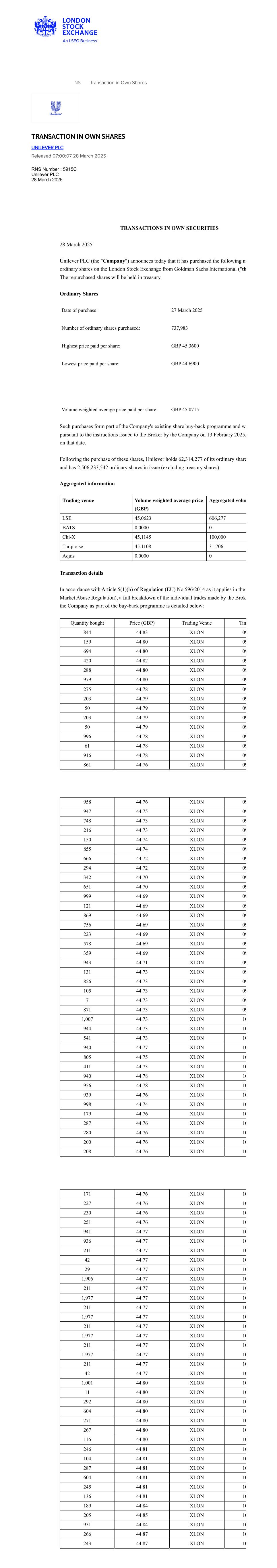 RNS Transaction in Own Shares TRANSACTION IN OWN SHARES UNILEVER PLC Released 07:00:07 28 March 2025 RNS Number : 5915C Unilever PLC 28 March 2025 TRANSACTIONS IN OWN SECURITIES 28 March 2025 Unilever PLC (the "Company") announces today that it has purchased the following nu ordinary shares on the London Stock Exchange from Goldman Sachs International ("th The repurchased shares will be held in treasury. Ordinary Shares Date of purchase: 27 March 2025 Number of ordinary shares purchased: 737,983 Highest price paid per share: GBP 45.3600 Lowest price paid per share: GBP 44.6900 Volume weighted average price paid per share: GBP 45.0715 Such purchases form part of the Company's existing share buy-back programme and we pursuant to the instructions issued to the Broker by the Company on 13 February 2025, on that date. Following the purchase of these shares, Unilever holds 62,314,277 of its ordinary share and has 2,506,233,542 ordinary shares in issue (excluding treasury shares). Aggregated information Trading venue Volume weighted average price (GBP) Aggregated volum LSE 45.0623 606,277 BATS 0.0000 0 Chi-X 45.1145 100,000 Turquoise 45.1108 31,706 Aquis 0.0000 0 Transaction details In accordance with Article 5(1)(b) of Regulation (EU) No 596/2014 as it applies in the Market Abuse Regulation), a full breakdown of the individual trades made by the Broke the Company as part of the buy-back programme is detailed below: Quantity bought Price (GBP) Trading Venue Tim 844 44.83 XLON 09 159 44.80 XLON 09 694 44.80 XLON 09 420 44.82 XLON 09 288 44.80 XLON 09 979 44.80 XLON 09 275 44.78 XLON 09 203 44.79 XLON 09 50 44.79 XLON 09 203 44.79 XLON 09 50 44.79 XLON 09 996 44.78 XLON 09 61 44.78 XLON 09 916 44.78 XLON 09 861 44.76 XLON 09 958 44.76 XLON 09 947 44.75 XLON 09 748 44.73 XLON 09 216 44.73 XLON 09 150 44.74 XLON 09 855 44.74 XLON 09 666 44.72 XLON 09 294 44.72 XLON 09 342 44.70 XLON 09 651 44.70 XLON 09 999 44.69 XLON 09 121 44.69 XLON 09 869 44.69 XLON 09 756 44.69 XLON 09 223 44.69 XLON 09 578 44.69 XLON 09 359 44.69 XLON 09 943 44.71 XLON 09 131 44.73 XLON 09 856 44.73 XLON 09 105 44.73 XLON 09 7 44.73 XLON 09 871 44.73 XLON 09 1,007 44.73 XLON 10 944 44.73 XLON 10 541 44.73 XLON 10 940 44.77 XLON 10 805 44.75 XLON 10 411 44.73 XLON 10 940 44.78 XLON 10 956 44.78 XLON 10 939 44.76 XLON 10 998 44.74 XLON 10 179 44.76 XLON 10 287 44.76 XLON 10 280 44.76 XLON 10 200 44.76 XLON 10 208 44.76 XLON 10 171 44.76 XLON 10 227 44.76 XLON 10 230 44.76 XLON 10 251 44.76 XLON 10 941 44.77 XLON 10 936 44.77 XLON 10 211 44.77 XLON 10 42 44.77 XLON 10 29 44.77 XLON 10 1,906 44.77 XLON 10 211 44.77 XLON 10 1,977 44.77 XLON 10 211 44.77 XLON 10 1,977 44.77 XLON 10 211 44.77 XLON 10 1,977 44.77 XLON 10 211 44.77 XLON 10 1,977 44.77 XLON 10 211 44.77 XLON 10 42 44.77 XLON 10 1,001 44.80 XLON 10 11 44.80 XLON 10 292 44.80 XLON 10 604 44.80 XLON 10 271 44.80 XLON 10 267 44.80 XLON 10 116 44.80 XLON 10 246 44.81 XLON 10 104 44.81 XLON 10 287 44.81 XLON 10 604 44.81 XLON 10 245 44.81 XLON 10 136 44.81 XLON 10 189 44.84 XLON 10 205 44.85 XLON 10 951 44.84 XLON 10 266 44.87 XLON 10 243 44.87 XLON 10