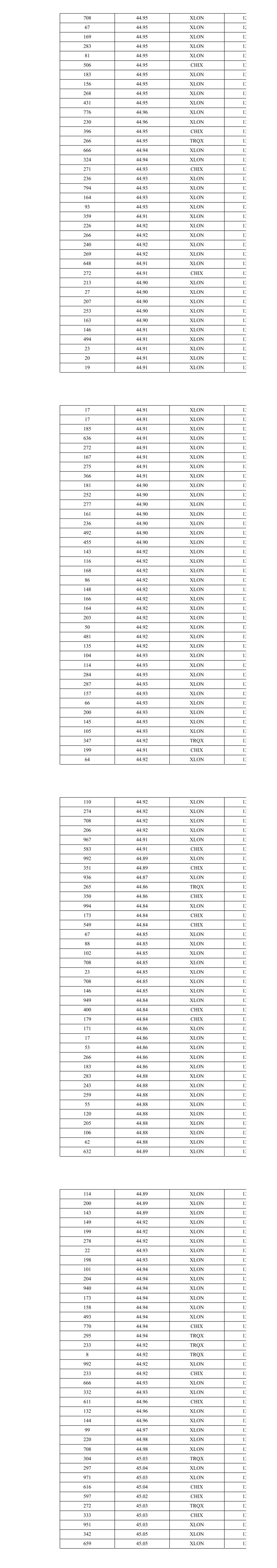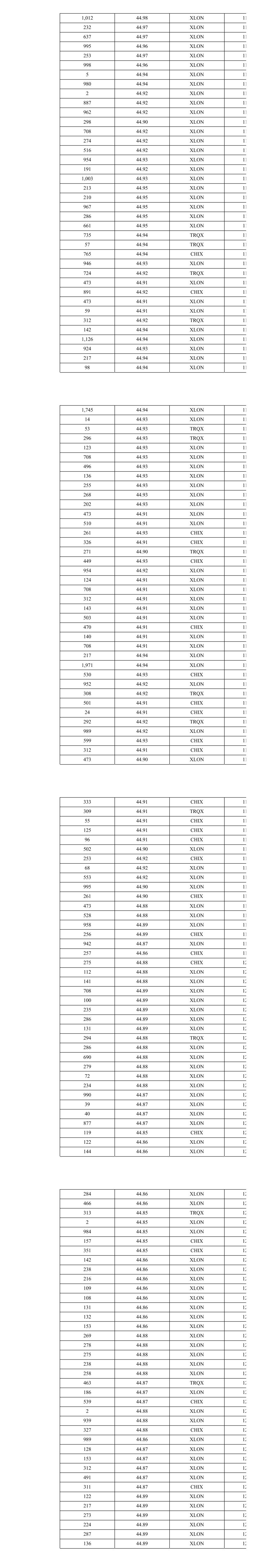 250 44.89 XLON 12 648 44.89 XLON 12 201 44.91 XLON 12 219 44.92 XLON 12 258 44.91 TRQX 12 420 44.91 XLON 12 280 44.91 XLON 12 112 44.91 XLON 12 136 44.91 XLON 12 107 44.92 XLON 12 256 44.92 XLON 12 708 44.92 XLON 12 275 44.92 XLON 12 16 44.92 XLON 12 578 44.91 CHIX 12 994 44.90 XLON 12 404 44.89 CHIX 12 998 44.88 XLON 12 334 44.89 CHIX 12 270 44.91 XLON 12 237 44.91 XLON 12 77 44.91 XLON 12 309 44.91 CHIX 12 286 44.92 TRQX 12 951 44.92 XLON 12 360 44.92 XLON 12 212 44.92 XLON 12 120 44.92 XLON 12 240 44.92 XLON 12 146 44.92 XLON 12 481 44.92 XLON 12 1,007 44.92 XLON 12 132 44.91 CHIX 12 156 44.91 CHIX 12 976 44.92 XLON 12 270 44.92 XLON 12 99 44.92 XLON 12 248 44.92 XLON 12 208 44.92 XLON 12 401 44.91 CHIX 12 22 44.92 XLON 12 265 44.92 XLON 12 273 44.92 XLON 12 503 44.92 XLON 12 57 44.92 XLON 12 336 44.91 CHIX 12 177 44.91 XLON 12 76 44.91 XLON 12 278 44.93 XLON 12 277 44.93 XLON 12 51 44.93 XLON 12 395 44.93 CHIX 12 270 44.94 XLON 12 338 44.94 XLON 12 36 44.94 XLON 12 284 44.94 XLON 12 139 44.94 XLON 12 12 44.94 XLON 12 235 44.95 XLON 12 36 44.95 XLON 12 235 44.95 XLON 12 708 44.95 XLON 12 95 44.95 XLON 12 955 44.94 XLON 12 136 44.95 XLON 12 403 44.95 CHIX 12 247 44.96 XLON 12 268 44.96 XLON 12 211 44.98 XLON 12 290 44.97 XLON 12 201 44.97 XLON 12 302 44.97 CHIX 12 76 44.97 CHIX 12 372 44.97 CHIX 12 123 44.98 XLON 12 28 44.98 XLON 12 278 44.98 XLON 12 268 44.98 XLON 12 708 44.98 XLON 12 195 44.98 XLON 12 271 44.98 XLON 12 128 44.98 XLON 12 708 44.98 XLON 12 250 44.98 XLON 12 38 44.98 XLON 12 236 44.98 XLON 12 246 44.98 XLON 12 201 44.98 XLON 12 273 44.98 XLON 12 146 44.98 XLON 12 496 44.98 XLON 12 371 44.97 CHIX 12 266 44.99 CHIX 12 288 44.98 TRQX 12 1,007 44.98 XLON 12 308 44.97 CHIX 12 197 44.97 XLON 12 56 44.97 XLON 12 205 44.97 XLON 12 948 44.96 XLON 12 17 44.96 TRQX 12 2 44.96 TRQX 12 1 44.96 TRQX 12 1 44.96 TRQX 12 1 44.96 TRQX 12 19 44.96 TRQX 12 152 44.96 TRQX 12 105 44.96 TRQX 12 302 44.95 CHIX 12 218 44.98 XLON 12 285 44.98 XLON 12 692 44.98 XLON 12 311 44.98 TRQX 12 950 44.98 XLON 12 255 44.98 CHIX 12 982 44.98 XLON 12 1,070 44.98 XLON 12 220 44.98 XLON 12 136 44.98 XLON 12 54 44.98 XLON 12 264 44.98 XLON 12 265 44.98 CHIX 12 266 44.98 CHIX 12 140 44.98 XLON 12 148 44.98 XLON 12 99 44.98 XLON 12 22 44.99 XLON 12 283 44.99 XLON 12 261 44.99 XLON 12 277 44.99 XLON 12 195 44.99 XLON 12 950 44.98 XLON 12 265 44.98 CHIX 12 342 44.98 XLON 12 608 44.98 XLON 12 266 44.98 CHIX 12 222 44.98 TRQX 12 40 44.98 TRQX 12 132 44.97 XLON 12 143 44.97 XLON 12 110 44.97 XLON 12 151 44.97 XLON 12 236 44.97 XLON 12 412 44.97 XLON 12 946 44.96 XLON 12 254 44.96 CHIX 12 986 44.94 XLON 12 281 44.95 CHIX 12 959 44.94 XLON 12 995 44.94 XLON 12 112 44.95 XLON 12 154 44.95 XLON 12