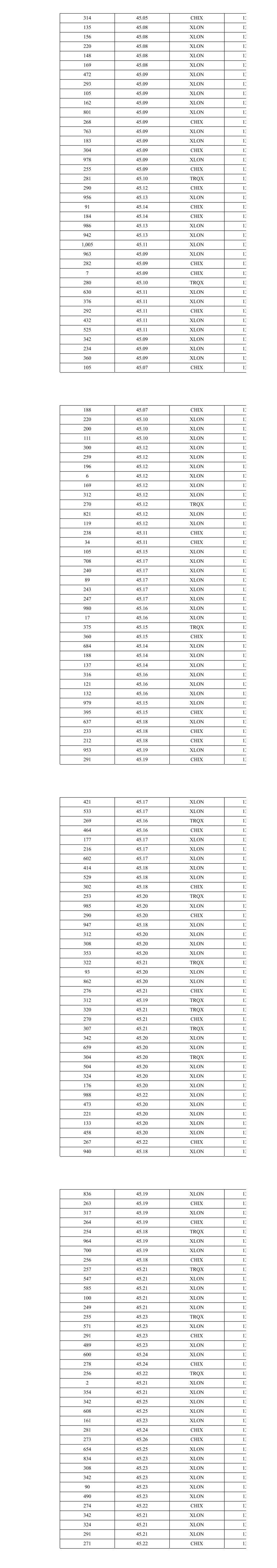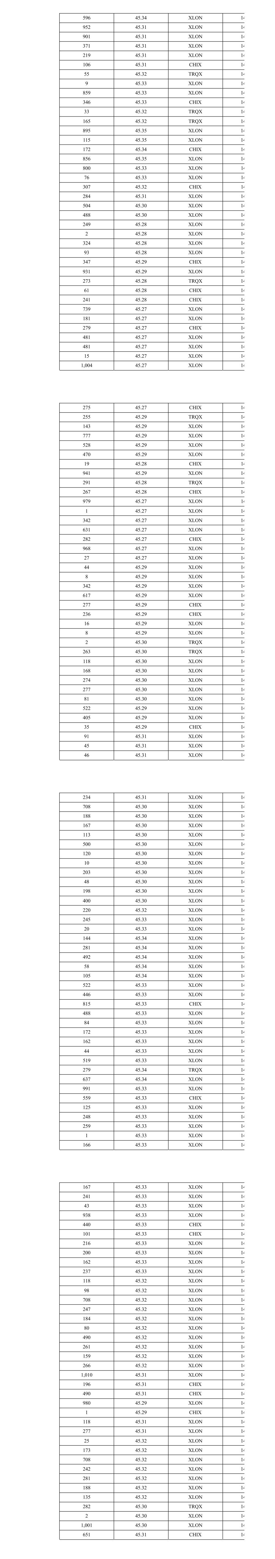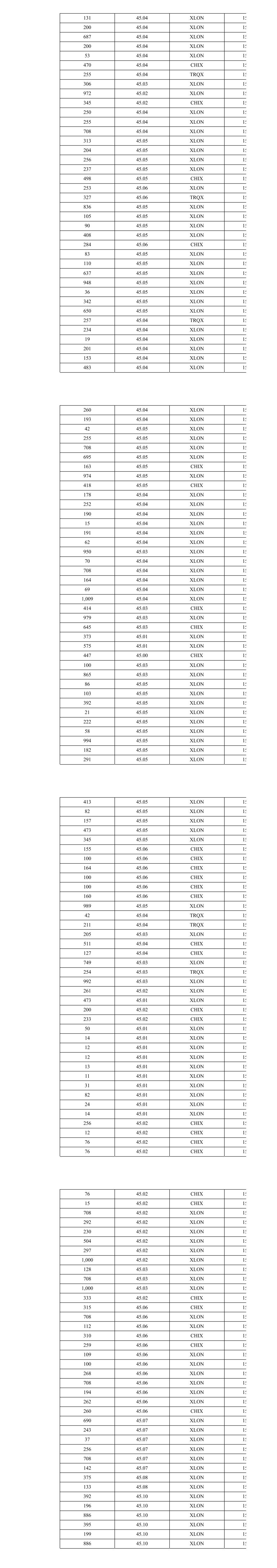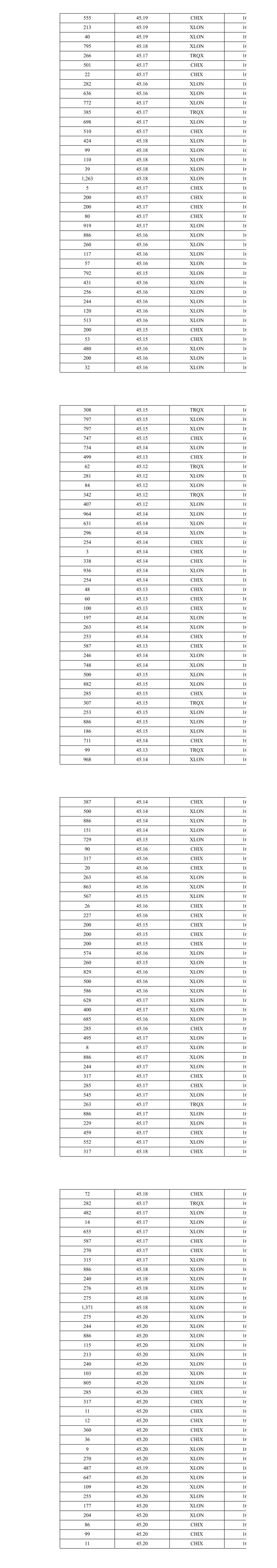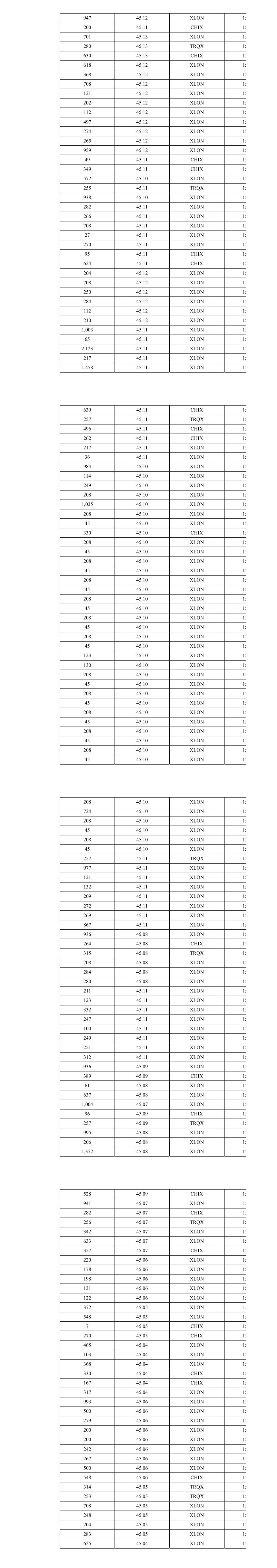 947 45.12 XLON 15 200 45.11 CHIX 15 701 45.13 XLON 15 280 45.13 TRQX 15 630 45.13 CHIX 15 618 45.12 XLON 15 368 45.12 XLON 15 708 45.12 XLON 15 121 45.12 XLON 15 202 45.12 XLON 15 112 45.12 XLON 15 497 45.12 XLON 15 274 45.12 XLON 15 265 45.12 XLON 15 959 45.12 XLON 15 49 45.11 CHIX 15 349 45.11 CHIX 15 572 45.10 XLON 15 255 45.11 TRQX 15 938 45.10 XLON 15 282 45.11 XLON 15 266 45.11 XLON 15 708 45.11 XLON 15 27 45.11 XLON 15 270 45.11 XLON 15 95 45.11 CHIX 15 624 45.11 CHIX 15 204 45.12 XLON 15 708 45.12 XLON 15 250 45.12 XLON 15 284 45.12 XLON 15 112 45.12 XLON 15 210 45.12 XLON 15 1,003 45.11 XLON 15 65 45.11 XLON 15 2,123 45.11 XLON 15 217 45.11 XLON 15 1,458 45.11 XLON 15 639 45.11 CHIX 15 257 45.11 TRQX 15 496 45.11 CHIX 15 262 45.11 CHIX 15 217 45.11 XLON 15 36 45.11 XLON 15 984 45.10 XLON 15 114 45.10 XLON 15 249 45.10 XLON 15 208 45.10 XLON 15 1,035 45.10 XLON 15 208 45.10 XLON 15 45 45.10 XLON 15 330 45.10 CHIX 15 208 45.10 XLON 15 45 45.10 XLON 15 208 45.10 XLON 15 45 45.10 XLON 15 208 45.10 XLON 15 45 45.10 XLON 15 208 45.10 XLON 15 45 45.10 XLON 15 208 45.10 XLON 15 45 45.10 XLON 15 208 45.10 XLON 15 45 45.10 XLON 15 123 45.10 XLON 15 130 45.10 XLON 15 208 45.10 XLON 15 45 45.10 XLON 15 208 45.10 XLON 15 45 45.10 XLON 15 208 45.10 XLON 15 45 45.10 XLON 15 208 45.10 XLON 15 45 45.10 XLON 15 208 45.10 XLON 15 45 45.10 XLON 15 208 45.10 XLON 15 724 45.10 XLON 15 208 45.10 XLON 15 45 45.10 XLON 15 208 45.10 XLON 15 45 45.10 XLON 15 257 45.11 TRQX 15 977 45.11 XLON 15 121 45.11 XLON 15 132 45.11 XLON 15 209 45.11 XLON 15 272 45.11 XLON 15 269 45.11 XLON 15 867 45.11 XLON 15 936 45.08 XLON 15 264 45.08 CHIX 15 315 45.08 TRQX 15 708 45.08 XLON 15 284 45.08 XLON 15 280 45.08 XLON 15 211 45.11 XLON 15 123 45.11 XLON 15 332 45.11 XLON 15 247 45.11 XLON 15 100 45.11 XLON 15 249 45.11 XLON 15 251 45.11 XLON 15 312 45.11 XLON 15 936 45.09 XLON 15 389 45.09 CHIX 15 61 45.08 XLON 15 637 45.08 XLON 15 1,004 45.07 XLON 15 96 45.09 CHIX 15 257 45.09 TRQX 15 995 45.08 XLON 15 206 45.08 XLON 15 1,372 45.08 XLON 15 528 45.09 CHIX 15 941 45.07 XLON 15 282 45.07 CHIX 15 256 45.07 TRQX 15 342 45.07 XLON 15 633 45.07 XLON 15 357 45.07 CHIX 15 220 45.06 XLON 15 178 45.06 XLON 15 198 45.06 XLON 15 131 45.06 XLON 15 122 45.06 XLON 15 372 45.05 XLON 15 548 45.05 XLON 15 7 45.05 CHIX 15 270 45.05 CHIX 15 465 45.04 XLON 15 103 45.04 XLON 15 368 45.04 XLON 15 330 45.04 CHIX 15 167 45.04 CHIX 15 317 45.04 XLON 15 993 45.06 XLON 15 500 45.06 XLON 15 279 45.06 XLON 15 200 45.06 XLON 15 200 45.06 XLON 15 242 45.06 XLON 15 267 45.06 XLON 15 500 45.06 XLON 15 548 45.06 CHIX 15 314 45.05 TRQX 15 253 45.05 TRQX 15 708 45.05 XLON 15 248 45.05 XLON 15 204 45.05 XLON 15 283 45.05 XLON 15 625 45.04 XLON 15