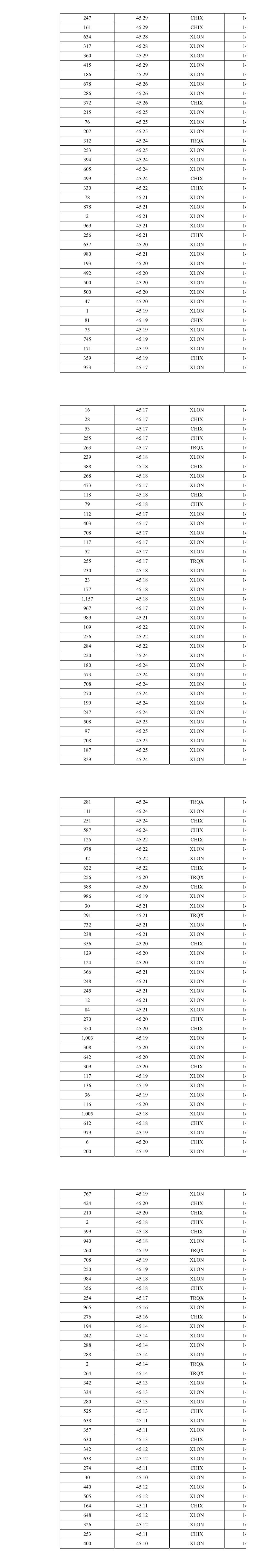 120 45.10 XLON 15 230 45.10 XLON 15 110 45.10 XLON 15 237 45.11 XLON 15 261 45.11 XLON 15 375 45.11 XLON 15 886 45.11 XLON 15 190 45.11 XLON 15 100 45.11 CHIX 15 54 45.11 CHIX 15 284 45.11 TRQX 15 99 45.11 XLON 15 839 45.11 XLON 15 10 45.11 CHIX 15 192 45.11 CHIX 15 10 45.11 CHIX 15 34 45.11 CHIX 15 284 45.09 TRQX 15 945 45.09 XLON 15 359 45.09 CHIX 15 36 45.09 CHIX 15 480 45.11 TRQX 15 947 45.11 XLON 15 265 45.11 CHIX 15 329 45.11 XLON 15 131 45.11 XLON 15 467 45.11 XLON 15 108 45.14 XLON 15 886 45.14 XLON 15 201 45.14 XLON 15 999 45.13 XLON 15 294 45.13 CHIX 15 1,009 45.11 XLON 15 317 45.11 CHIX 15 471 45.09 XLON 15 59 45.09 XLON 15 472 45.09 XLON 15 145 45.09 CHIX 15 203 45.09 CHIX 15 59 45.08 XLON 15 371 45.08 TRQX 15 599 45.08 XLON 15 348 45.08 XLON 15 930 45.08 XLON 15 753 45.08 XLON 15 891 45.09 XLON 15 448 45.09 CHIX 15 721 45.09 XLON 15 554 45.09 CHIX 15 345 45.08 XLON 15 43 45.08 XLON 15 226 45.08 XLON 15 308 45.07 CHIX 15 281 45.06 TRQX 15 690 45.06 XLON 15 481 45.06 XLON 15 941 45.08 XLON 15 712 45.08 XLON 15 709 45.08 XLON 15 741 45.08 XLON 15 264 45.07 TRQX 15 481 45.07 CHIX 15 286 45.07 TRQX 15 690 45.07 CHIX 15 520 45.07 CHIX 15 377 45.09 CHIX 15 900 45.08 XLON 15 255 45.08 XLON 15 798 45.08 XLON 15 253 45.09 XLON 15 285 45.09 XLON 15 393 45.09 XLON 15 124 45.09 XLON 15 619 45.09 CHIX 15 228 45.09 XLON 15 886 45.11 XLON 15 206 45.11 XLON 15 253 45.11 XLON 15 253 45.12 XLON 15 8 45.12 XLON 15 263 45.12 XLON 15 886 45.12 XLON 15 540 45.12 XLON 15 295 45.12 TRQX 15 407 45.12 XLON 15 801 45.12 CHIX 15 842 45.14 XLON 15 403 45.15 XLON 15 449 45.15 XLON 15 421 45.14 TRQX 15 125 45.16 XLON 16 496 45.16 XLON 16 371 45.17 TRQX 16 433 45.17 XLON 16 499 45.17 XLON 16 974 45.17 CHIX 16 210 45.16 XLON 16 116 45.16 XLON 16 258 45.16 XLON 16 222 45.16 XLON 16 886 45.16 XLON 16 240 45.16 XLON 16 38 45.16 XLON 16 227 45.16 XLON 16 216 45.16 XLON 16 240 45.16 XLON 16 350 45.16 XLON 16 281 45.16 XLON 16 210 45.16 XLON 16 43 45.16 XLON 16 462 45.15 XLON 16 42 45.15 CHIX 16 160 45.15 CHIX 16 76 45.15 CHIX 16 200 45.15 CHIX 16 373 45.15 TRQX 16 257 45.12 TRQX 16 513 45.15 XLON 16 599 45.14 XLON 16 112 45.14 XLON 16 491 45.14 XLON 16 235 45.14 XLON 16 285 45.14 XLON 16 161 45.15 CHIX 16 562 45.13 CHIX 16 101 45.15 XLON 16 618 45.15 XLON 16 46 45.14 XLON 16 275 45.14 CHIX 16 200 45.14 CHIX 16 98 45.14 CHIX 16 797 45.15 XLON 16 281 45.16 XLON 16 287 45.16 XLON 16 409 45.16 XLON 16 270 45.16 XLON 16 426 45.16 XLON 16 494 45.16 CHIX 16 473 45.14 XLON 16 146 45.14 XLON 16 355 45.14 TRQX 16 295 45.14 CHIX 16 956 45.16 XLON 16 274 45.17 XLON 16 271 45.17 XLON 16 150 45.17 XLON 16 281 45.20 XLON 16 248 45.20 XLON 16 886 45.20 XLON 16 43 45.20 XLON 16 797 45.20 XLON 16 21 45.19 CHIX 16