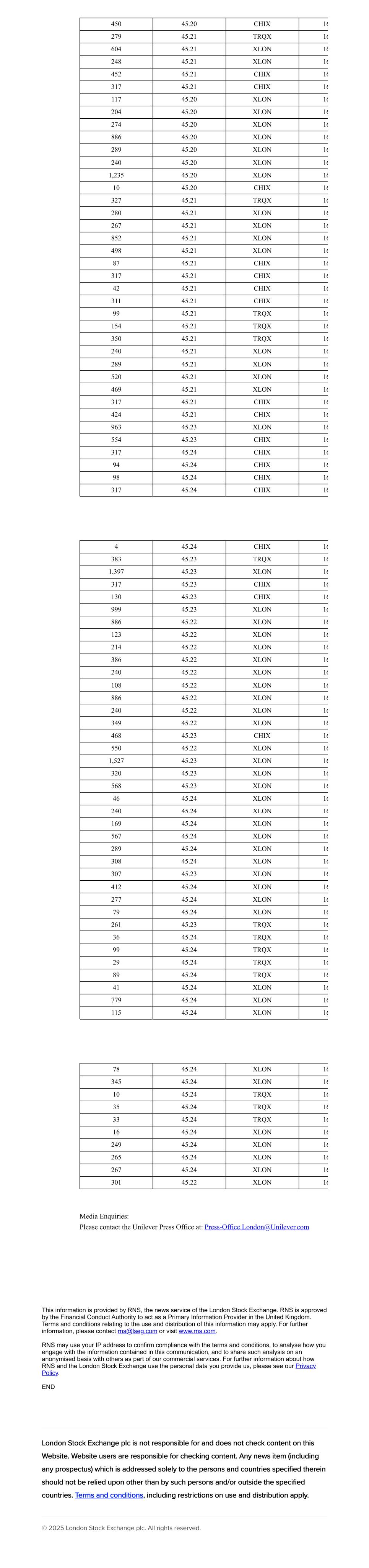 450 45.20 CHIX 16 279 45.21 TRQX 16 604 45.21 XLON 16 248 45.21 XLON 16 452 45.21 CHIX 16 317 45.21 CHIX 16 117 45.20 XLON 16 204 45.20 XLON 16 274 45.20 XLON 16 886 45.20 XLON 16 289 45.20 XLON 16 240 45.20 XLON 16 1,235 45.20 XLON 16 10 45.20 CHIX 16 327 45.21 TRQX 16 280 45.21 XLON 16 267 45.21 XLON 16 852 45.21 XLON 16 498 45.21 XLON 16 87 45.21 CHIX 16 317 45.21 CHIX 16 42 45.21 CHIX 16 311 45.21 CHIX 16 99 45.21 TRQX 16 154 45.21 TRQX 16 350 45.21 TRQX 16 240 45.21 XLON 16 289 45.21 XLON 16 520 45.21 XLON 16 469 45.21 XLON 16 317 45.21 CHIX 16 424 45.21 CHIX 16 963 45.23 XLON 16 554 45.23 CHIX 16 317 45.24 CHIX 16 94 45.24 CHIX 16 98 45.24 CHIX 16 317 45.24 CHIX 16 4 45.24 CHIX 16 383 45.23 TRQX 16 1,397 45.23 XLON 16 317 45.23 CHIX 16 130 45.23 CHIX 16 999 45.23 XLON 16 886 45.22 XLON 16 123 45.22 XLON 16 214 45.22 XLON 16 386 45.22 XLON 16 240 45.22 XLON 16 108 45.22 XLON 16 886 45.22 XLON 16 240 45.22 XLON 16 349 45.22 XLON 16 468 45.23 CHIX 16 550 45.22 XLON 16 1,527 45.23 XLON 16 320 45.23 XLON 16 568 45.23 XLON 16 46 45.24 XLON 16 240 45.24 XLON 16 169 45.24 XLON 16 567 45.24 XLON 16 289 45.24 XLON 16 308 45.24 XLON 16 307 45.23 XLON 16 412 45.24 XLON 16 277 45.24 XLON 16 79 45.24 XLON 16 261 45.23 TRQX 16 36 45.24 TRQX 16 99 45.24 TRQX 16 29 45.24 TRQX 16 89 45.24 TRQX 16 41 45.24 XLON 16 779 45.24 XLON 16 115 45.24 XLON 16 78 45.24 XLON 16 345 45.24 XLON 16 10 45.24 TRQX 16 35 45.24 TRQX 16 33 45.24 TRQX 16 16 45.24 XLON 16 249 45.24 XLON 16 265 45.24 XLON 16 267 45.24 XLON 16 301 45.22 XLON 16 Media Enquiries: Please contact the Unilever Press Office at: Press-Office.London@Unilever.com This information is provided by RNS, the news service of the London Stock Exchange. RNS is approved by the Financial Conduct Authority to act as a Primary Information Provider in the United Kingdom. Terms and conditions relating to the use and distribution of this information may apply. For further information, please contact rns@lseg.com or visit www.rns.com. RNS may use your IP address to confirm compliance with the terms and conditions, to analyse how you engage with the information contained in this communication, and to share such analysis on an anonymised basis with others as part of our commercial services. For further information about how RNS and the London Stock Exchange use the personal data you provide us, please see our Privacy Policy. END London Stock Exchange plc is not responsible for and does not check content on this Website. Website users are responsible for checking content. Any news item (including any prospectus) which is addressed solely to the persons and countries specified therein should not be relied upon other than by such persons and/or outside the specified countries. Terms and conditions, including restrictions on use and distribution apply. © 2025 London Stock Exchange plc. All rights reserved.