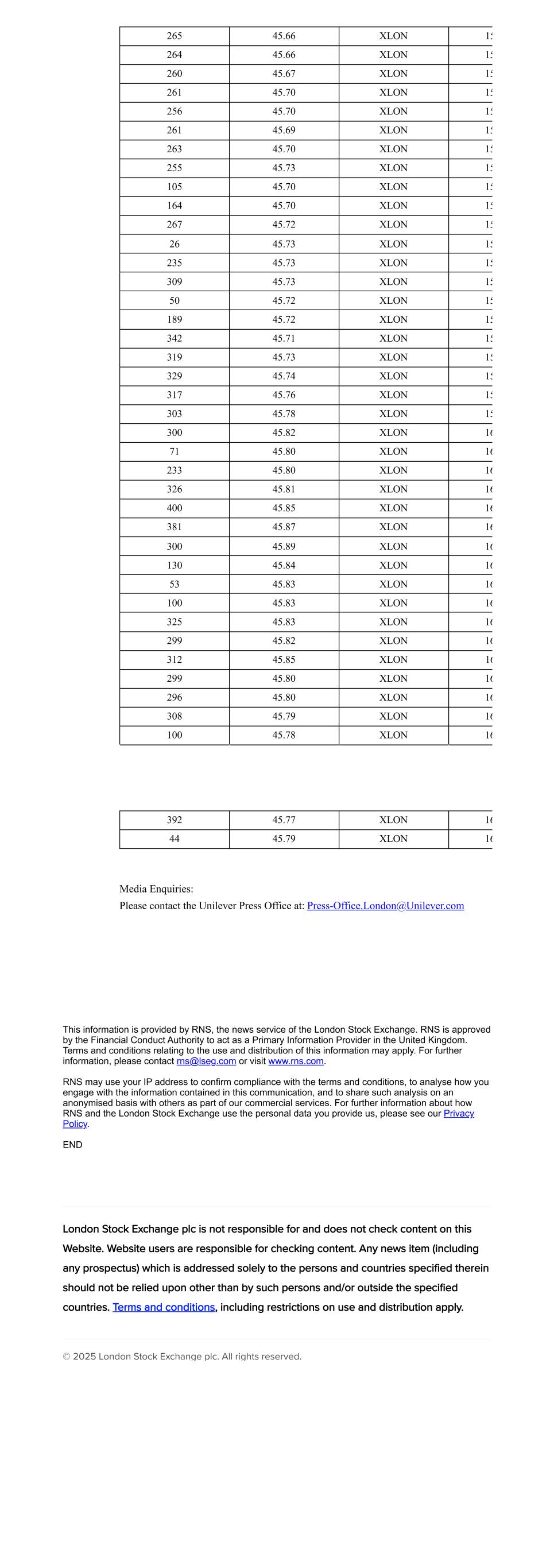 265 45.66 XLON 15 264 45.66 XLON 15 260 45.67 XLON 15 261 45.70 XLON 15 256 45.70 XLON 15 261 45.69 XLON 15 263 45.70 XLON 15 255 45.73 XLON 15 105 45.70 XLON 15 164 45.70 XLON 15 267 45.72 XLON 15 26 45.73 XLON 15 235 45.73 XLON 15 309 45.73 XLON 15 50 45.72 XLON 15 189 45.72 XLON 15 342 45.71 XLON 15 319 45.73 XLON 15 329 45.74 XLON 15 317 45.76 XLON 15 303 45.78 XLON 15 300 45.82 XLON 16 71 45.80 XLON 16 233 45.80 XLON 16 326 45.81 XLON 16 400 45.85 XLON 16 381 45.87 XLON 16 300 45.89 XLON 16 130 45.84 XLON 16 53 45.83 XLON 16 100 45.83 XLON 16 325 45.83 XLON 16 299 45.82 XLON 16 312 45.85 XLON 16 299 45.80 XLON 16 296 45.80 XLON 16 308 45.79 XLON 16 100 45.78 XLON 16 392 45.77 XLON 16 44 45.79 XLON 16 Media Enquiries: Please contact the Unilever Press Office at: Press-Office.London@Unilever.com This information is provided by RNS, the news service of the London Stock Exchange. RNS is approved by the Financial Conduct Authority to act as a Primary Information Provider in the United Kingdom. Terms and conditions relating to the use and distribution of this information may apply. For further information, please contact rns@lseg.com or visit www.rns.com. RNS may use your IP address to confirm compliance with the terms and conditions, to analyse how you engage with the information contained in this communication, and to share such analysis on an anonymised basis with others as part of our commercial services. For further information about how RNS and the London Stock Exchange use the personal data you provide us, please see our Privacy Policy. END London Stock Exchange plc is not responsible for and does not check content on this Website. Website users are responsible for checking content. Any news item (including any prospectus) which is addressed solely to the persons and countries specified therein should not be relied upon other than by such persons and/or outside the specified countries. Terms and conditions, including restrictions on use and distribution apply. © 2025 London Stock Exchange plc. All rights reserved.