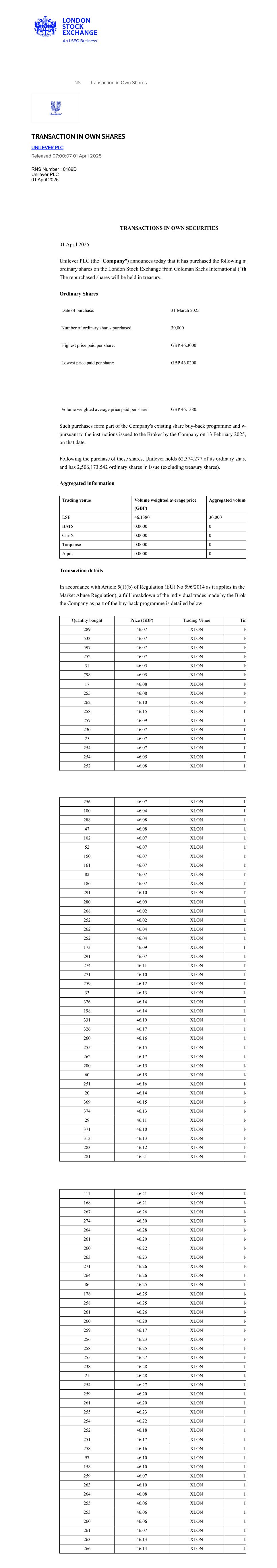 RNS Transaction in Own Shares TRANSACTION IN OWN SHARES UNILEVER PLC Released 07:00:07 01 April 2025 RNS Number : 0189D Unilever PLC 01 April 2025 TRANSACTIONS IN OWN SECURITIES 01 April 2025 Unilever PLC (the "Company") announces today that it has purchased the following nu ordinary shares on the London Stock Exchange from Goldman Sachs International ("th The repurchased shares will be held in treasury. Ordinary Shares Date of purchase: 31 March 2025 Number of ordinary shares purchased: 30,000 Highest price paid per share: GBP 46.3000 Lowest price paid per share: GBP 46.0200 Volume weighted average price paid per share: GBP 46.1380 Such purchases form part of the Company's existing share buy-back programme and we pursuant to the instructions issued to the Broker by the Company on 13 February 2025, on that date. Following the purchase of these shares, Unilever holds 62,374,277 of its ordinary share and has 2,506,173,542 ordinary shares in issue (excluding treasury shares). Aggregated information Trading venue Volume weighted average price (GBP) Aggregated volume LSE 46.1380 30,000 BATS 0.0000 0 Chi-X 0.0000 0 Turquoise 0.0000 0 Aquis 0.0000 0 Transaction details In accordance with Article 5(1)(b) of Regulation (EU) No 596/2014 as it applies in the U Market Abuse Regulation), a full breakdown of the individual trades made by the Broke the Company as part of the buy-back programme is detailed below: Quantity bought Price (GBP) Trading Venue Tim 289 46.07 XLON 10 533 46.07 XLON 10 597 46.07 XLON 10 252 46.07 XLON 10 31 46.05 XLON 10 798 46.05 XLON 10 17 46.08 XLON 10 255 46.08 XLON 10 262 46.10 XLON 10 258 46.15 XLON 11 257 46.09 XLON 11 230 46.07 XLON 11 25 46.07 XLON 11 254 46.07 XLON 11 254 46.05 XLON 11 252 46.08 XLON 11 256 46.07 XLON 11 100 46.04 XLON 11 288 46.08 XLON 12 47 46.08 XLON 12 102 46.07 XLON 12 52 46.07 XLON 12 150 46.07 XLON 12 161 46.07 XLON 12 82 46.07 XLON 12 186 46.07 XLON 12 291 46.10 XLON 12 280 46.09 XLON 12 268 46.02 XLON 12 252 46.02 XLON 12 262 46.04 XLON 13 252 46.04 XLON 13 173 46.09 XLON 13 291 46.07 XLON 13 274 46.11 XLON 13 271 46.10 XLON 13 259 46.12 XLON 13 33 46.13 XLON 13 376 46.14 XLON 13 198 46.14 XLON 13 331 46.19 XLON 13 326 46.17 XLON 13 260 46.16 XLON 13 255 46.15 XLON 14 262 46.17 XLON 14 200 46.15 XLON 14 60 46.15 XLON 14 251 46.16 XLON 14 20 46.14 XLON 14 369 46.15 XLON 14 374 46.13 XLON 14 29 46.11 XLON 14 371 46.10 XLON 14 313 46.13 XLON 14 283 46.12 XLON 14 281 46.21 XLON 14 111 46.21 XLON 14 168 46.21 XLON 14 267 46.26 XLON 14 274 46.30 XLON 14 264 46.28 XLON 14 261 46.20 XLON 14 260 46.22 XLON 14 263 46.23 XLON 14 271 46.26 XLON 14 264 46.26 XLON 14 86 46.25 XLON 14 178 46.25 XLON 14 258 46.25 XLON 14 261 46.26 XLON 14 260 46.20 XLON 14 259 46.17 XLON 14 256 46.23 XLON 14 258 46.25 XLON 14 255 46.27 XLON 14 238 46.28 XLON 14 21 46.28 XLON 14 254 46.27 XLON 15 259 46.20 XLON 15 261 46.20 XLON 15 255 46.23 XLON 15 254 46.22 XLON 15 252 46.18 XLON 15 251 46.17 XLON 15 258 46.16 XLON 15 97 46.10 XLON 15 158 46.10 XLON 15 259 46.07 XLON 15 263 46.10 XLON 15 264 46.08 XLON 15 255 46.06 XLON 15 253 46.06 XLON 15 260 46.06 XLON 15 261 46.07 XLON 15 263 46.13 XLON 15 266 46.14 XLON 15
