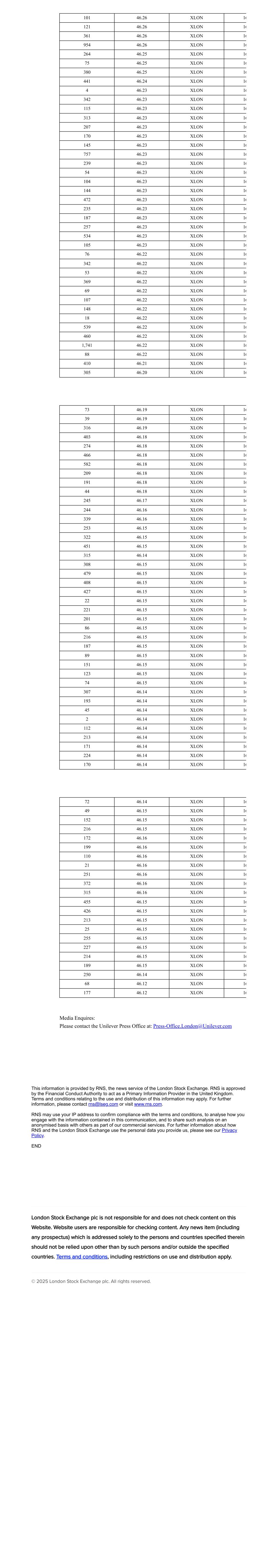 101 46.26 XLON 16 121 46.26 XLON 16 361 46.26 XLON 16 954 46.26 XLON 16 264 46.25 XLON 16 75 46.25 XLON 16 380 46.25 XLON 16 441 46.24 XLON 16 4 46.23 XLON 16 342 46.23 XLON 16 115 46.23 XLON 16 313 46.23 XLON 16 207 46.23 XLON 16 170 46.23 XLON 16 145 46.23 XLON 16 757 46.23 XLON 16 239 46.23 XLON 16 54 46.23 XLON 16 104 46.23 XLON 16 144 46.23 XLON 16 472 46.23 XLON 16 235 46.23 XLON 16 187 46.23 XLON 16 257 46.23 XLON 16 534 46.23 XLON 16 105 46.23 XLON 16 76 46.22 XLON 16 342 46.22 XLON 16 53 46.22 XLON 16 369 46.22 XLON 16 69 46.22 XLON 16 107 46.22 XLON 16 148 46.22 XLON 16 18 46.22 XLON 16 539 46.22 XLON 16 460 46.22 XLON 16 1,741 46.22 XLON 16 88 46.22 XLON 16 410 46.21 XLON 16 305 46.20 XLON 16 73 46.19 XLON 16 39 46.19 XLON 16 316 46.19 XLON 16 403 46.18 XLON 16 274 46.18 XLON 16 466 46.18 XLON 16 582 46.18 XLON 16 209 46.18 XLON 16 191 46.18 XLON 16 44 46.18 XLON 16 245 46.17 XLON 16 244 46.16 XLON 16 339 46.16 XLON 16 253 46.15 XLON 16 322 46.15 XLON 16 451 46.15 XLON 16 315 46.14 XLON 16 308 46.15 XLON 16 479 46.15 XLON 16 408 46.15 XLON 16 427 46.15 XLON 16 22 46.15 XLON 16 221 46.15 XLON 16 201 46.15 XLON 16 86 46.15 XLON 16 216 46.15 XLON 16 187 46.15 XLON 16 89 46.15 XLON 16 151 46.15 XLON 16 123 46.15 XLON 16 74 46.15 XLON 16 307 46.14 XLON 16 193 46.14 XLON 16 45 46.14 XLON 16 2 46.14 XLON 16 112 46.14 XLON 16 213 46.14 XLON 16 171 46.14 XLON 16 224 46.14 XLON 16 170 46.14 XLON 16 72 46.14 XLON 16 49 46.15 XLON 16 152 46.15 XLON 16 216 46.15 XLON 16 172 46.16 XLON 16 199 46.16 XLON 16 110 46.16 XLON 16 21 46.16 XLON 16 251 46.16 XLON 16 372 46.16 XLON 16 315 46.16 XLON 16 455 46.15 XLON 16 426 46.15 XLON 16 213 46.15 XLON 16 25 46.15 XLON 16 255 46.15 XLON 16 227 46.15 XLON 16 214 46.15 XLON 16 189 46.15 XLON 16 250 46.14 XLON 16 68 46.12 XLON 16 177 46.12 XLON 16 Media Enquires: Please contact the Unilever Press Office at: Press-Office.London@Unilever.com This information is provided by RNS, the news service of the London Stock Exchange. RNS is approved by the Financial Conduct Authority to act as a Primary Information Provider in the United Kingdom. Terms and conditions relating to the use and distribution of this information may apply. For further information, please contact rns@lseg.com or visit www.rns.com. RNS may use your IP address to confirm compliance with the terms and conditions, to analyse how you engage with the information contained in this communication, and to share such analysis on an anonymised basis with others as part of our commercial services. For further information about how RNS and the London Stock Exchange use the personal data you provide us, please see our Privacy Policy. END London Stock Exchange plc is not responsible for and does not check content on this Website. Website users are responsible for checking content. Any news item (including any prospectus) which is addressed solely to the persons and countries specified therein should not be relied upon other than by such persons and/or outside the specified countries. Terms and conditions, including restrictions on use and distribution apply. © 2025 London Stock Exchange plc. All rights reserved.