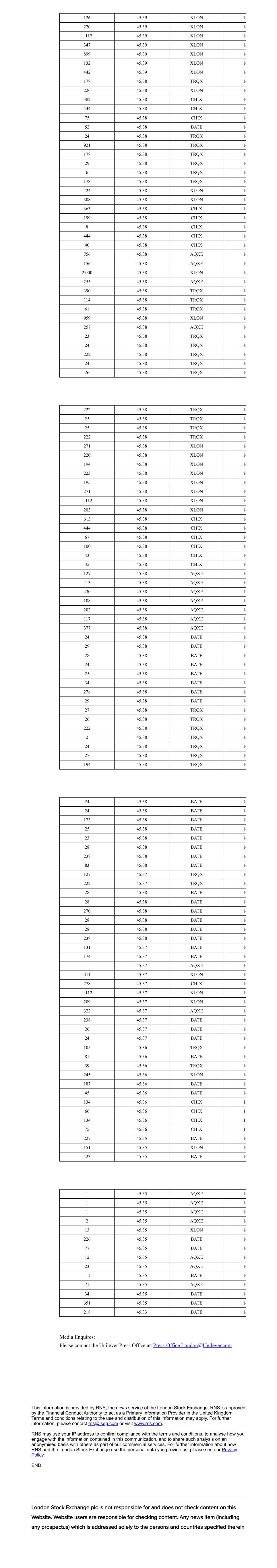 126 45.39 XLON 16 220 45.39 XLON 16 1,112 45.39 XLON 16 347 45.39 XLON 16 899 45.39 XLON 16 132 45.39 XLON 16 442 45.39 XLON 16 178 45.38 TRQX 16 226 45.38 XLON 16 382 45.38 CHIX 16 444 45.38 CHIX 16 75 45.38 CHIX 16 52 45.38 BATE 16 24 45.38 TRQX 16 921 45.38 TRQX 16 178 45.38 TRQX 16 29 45.38 TRQX 16 6 45.38 TRQX 16 178 45.38 TRQX 16 424 45.38 XLON 16 308 45.38 XLON 16 363 45.38 CHIX 16 199 45.38 CHIX 16 8 45.38 CHIX 16 444 45.38 CHIX 16 40 45.38 CHIX 16 756 45.38 AQXE 16 156 45.38 AQXE 16 2,000 45.38 XLON 16 255 45.38 AQXE 16 390 45.38 TRQX 16 114 45.38 TRQX 16 61 45.38 TRQX 16 959 45.38 XLON 16 257 45.38 AQXE 16 23 45.38 TRQX 16 24 45.38 TRQX 16 222 45.38 TRQX 16 24 45.38 TRQX 16 26 45.38 TRQX 16 222 45.38 TRQX 16 25 45.38 TRQX 16 25 45.38 TRQX 16 222 45.38 TRQX 16 271 45.38 XLON 16 220 45.38 XLON 16 194 45.38 XLON 16 223 45.38 XLON 16 195 45.38 XLON 16 271 45.38 XLON 16 1,112 45.38 XLON 16 203 45.38 XLON 16 613 45.38 CHIX 16 444 45.38 CHIX 16 67 45.38 CHIX 16 100 45.38 CHIX 16 43 45.38 CHIX 16 35 45.38 CHIX 16 127 45.38 AQXE 16 413 45.38 AQXE 16 430 45.38 AQXE 16 108 45.38 AQXE 16 202 45.38 AQXE 16 117 45.38 AQXE 16 377 45.38 AQXE 16 24 45.38 BATE 16 29 45.38 BATE 16 28 45.38 BATE 16 24 45.38 BATE 16 25 45.38 BATE 16 34 45.38 BATE 16 278 45.38 BATE 16 29 45.38 BATE 16 27 45.38 TRQX 16 26 45.38 TRQX 16 222 45.38 TRQX 16 2 45.38 TRQX 16 24 45.38 TRQX 16 27 45.38 TRQX 16 194 45.38 TRQX 16 24 45.38 BATE 16 24 45.38 BATE 16 173 45.38 BATE 16 25 45.38 BATE 16 23 45.38 BATE 16 28 45.38 BATE 16 238 45.38 BATE 16 83 45.38 BATE 16 127 45.37 TRQX 16 222 45.37 TRQX 16 28 45.38 BATE 16 28 45.38 BATE 16 270 45.38 BATE 16 28 45.38 BATE 16 28 45.38 BATE 16 238 45.38 BATE 16 131 45.37 BATE 16 174 45.37 BATE 16 1 45.37 AQXE 16 311 45.37 XLON 16 278 45.37 CHIX 16 1,112 45.37 XLON 16 209 45.37 XLON 16 322 45.37 AQXE 16 238 45.37 BATE 16 26 45.37 BATE 16 24 45.37 BATE 16 105 45.36 TRQX 16 81 45.36 BATE 16 39 45.36 TRQX 16 245 45.36 XLON 16 187 45.36 BATE 16 45 45.36 BATE 16 134 45.36 CHIX 16 66 45.36 CHIX 16 134 45.36 CHIX 16 75 45.36 CHIX 16 227 45.35 BATE 16 151 45.35 XLON 16 423 45.35 BATE 16 1 45.35 AQXE 16 1 45.35 AQXE 16 1 45.35 AQXE 16 2 45.35 AQXE 16 13 45.35 XLON 16 226 45.35 BATE 16 77 45.35 BATE 16 12 45.35 AQXE 16 23 45.35 AQXE 16 111 45.35 BATE 16 71 45.35 AQXE 16 34 45.35 BATE 16 651 45.35 BATE 16 218 45.33 BATE 16 Media Enquires: Please contact the Unilever Press Office at: Press-Office.London@Unilever.com This information is provided by RNS, the news service of the London Stock Exchange. RNS is approved by the Financial Conduct Authority to act as a Primary Information Provider in the United Kingdom. Terms and conditions relating to the use and distribution of this information may apply. For further information, please contact rns@lseg.com or visit www.rns.com. RNS may use your IP address to confirm compliance with the terms and conditions, to analyse how you engage with the information contained in this communication, and to share such analysis on an anonymised basis with others as part of our commercial services. For further information about how RNS and the London Stock Exchange use the personal data you provide us, please see our Privacy Policy. END London Stock Exchange plc is not responsible for and does not check content on this Website. Website users are responsible for checking content. Any news item (including any prospectus) which is addressed solely to the persons and countries specified therein
