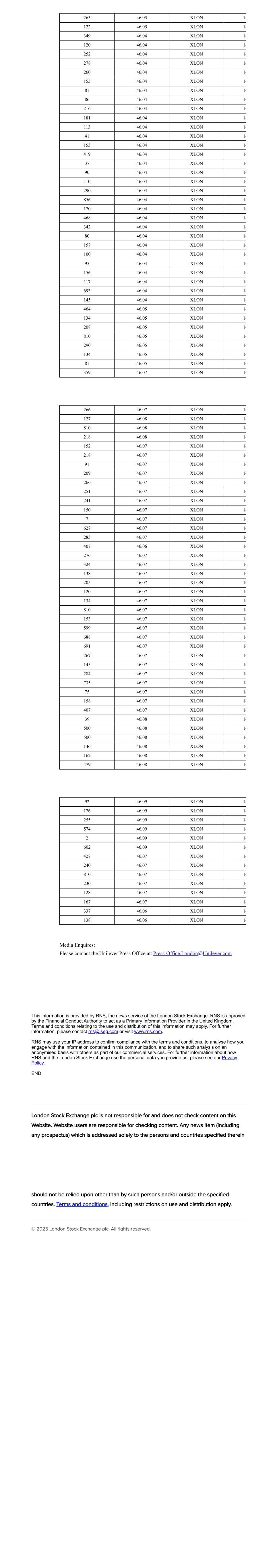 265 46.05 XLON 16 122 46.05 XLON 16 349 46.04 XLON 16 120 46.04 XLON 16 252 46.04 XLON 16 278 46.04 XLON 16 260 46.04 XLON 16 155 46.04 XLON 16 81 46.04 XLON 16 86 46.04 XLON 16 216 46.04 XLON 16 181 46.04 XLON 16 113 46.04 XLON 16 41 46.04 XLON 16 153 46.04 XLON 16 419 46.04 XLON 16 37 46.04 XLON 16 90 46.04 XLON 16 110 46.04 XLON 16 290 46.04 XLON 16 856 46.04 XLON 16 170 46.04 XLON 16 468 46.04 XLON 16 342 46.04 XLON 16 80 46.04 XLON 16 157 46.04 XLON 16 100 46.04 XLON 16 95 46.04 XLON 16 156 46.04 XLON 16 117 46.04 XLON 16 693 46.04 XLON 16 145 46.04 XLON 16 464 46.05 XLON 16 134 46.05 XLON 16 208 46.05 XLON 16 810 46.05 XLON 16 290 46.05 XLON 16 134 46.05 XLON 16 81 46.05 XLON 16 359 46.07 XLON 16 266 46.07 XLON 16 127 46.08 XLON 16 810 46.08 XLON 16 218 46.08 XLON 16 152 46.07 XLON 16 218 46.07 XLON 16 91 46.07 XLON 16 209 46.07 XLON 16 266 46.07 XLON 16 251 46.07 XLON 16 241 46.07 XLON 16 150 46.07 XLON 16 7 46.07 XLON 16 627 46.07 XLON 16 283 46.07 XLON 16 407 46.06 XLON 16 276 46.07 XLON 16 324 46.07 XLON 16 138 46.07 XLON 16 205 46.07 XLON 16 120 46.07 XLON 16 134 46.07 XLON 16 810 46.07 XLON 16 153 46.07 XLON 16 599 46.07 XLON 16 688 46.07 XLON 16 691 46.07 XLON 16 267 46.07 XLON 16 145 46.07 XLON 16 284 46.07 XLON 16 735 46.07 XLON 16 75 46.07 XLON 16 158 46.07 XLON 16 407 46.07 XLON 16 39 46.08 XLON 16 500 46.08 XLON 16 500 46.08 XLON 16 146 46.08 XLON 16 162 46.08 XLON 16 479 46.08 XLON 16 92 46.09 XLON 16 176 46.09 XLON 16 255 46.09 XLON 16 574 46.09 XLON 16 2 46.09 XLON 16 602 46.09 XLON 16 427 46.07 XLON 16 240 46.07 XLON 16 810 46.07 XLON 16 230 46.07 XLON 16 128 46.07 XLON 16 167 46.07 XLON 16 337 46.06 XLON 16 138 46.06 XLON 16 Media Enquires: Please contact the Unilever Press Office at: Press-Office.London@Unilever.com This information is provided by RNS, the news service of the London Stock Exchange. RNS is approved by the Financial Conduct Authority to act as a Primary Information Provider in the United Kingdom. Terms and conditions relating to the use and distribution of this information may apply. For further information, please contact rns@lseg.com or visit www.rns.com. RNS may use your IP address to confirm compliance with the terms and conditions, to analyse how you engage with the information contained in this communication, and to share such analysis on an anonymised basis with others as part of our commercial services. For further information about how RNS and the London Stock Exchange use the personal data you provide us, please see our Privacy Policy. END London Stock Exchange plc is not responsible for and does not check content on this Website. Website users are responsible for checking content. Any news item (including any prospectus) which is addressed solely to the persons and countries specified therein should not be relied upon other than by such persons and/or outside the specified countries. Terms and conditions, including restrictions on use and distribution apply. © 2025 London Stock Exchange plc. All rights reserved.