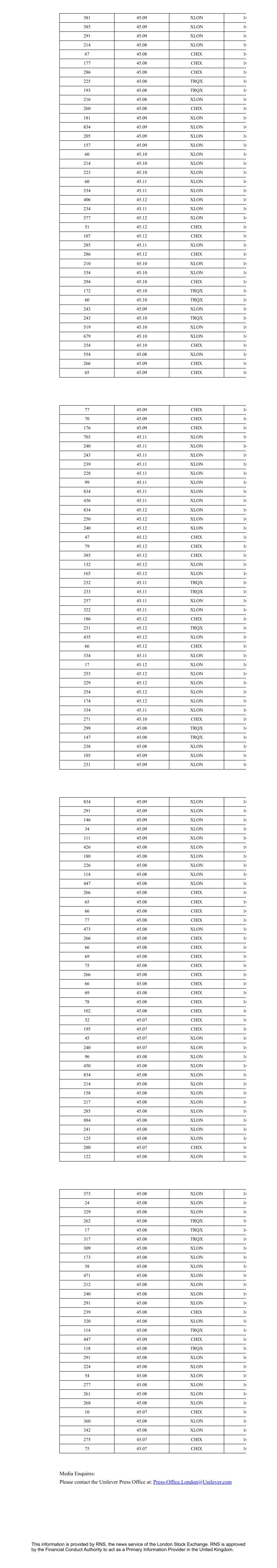 381 45.09 XLON 16 385 45.09 XLON 16 291 45.09 XLON 16 214 45.08 XLON 16 67 45.08 CHIX 16 177 45.08 CHIX 16 286 45.08 CHIX 16 225 45.08 TRQX 16 193 45.08 TRQX 16 216 45.08 XLON 16 260 45.08 CHIX 16 181 45.09 XLON 16 834 45.09 XLON 16 205 45.09 XLON 16 157 45.09 XLON 16 60 45.10 XLON 16 214 45.10 XLON 16 223 45.10 XLON 16 60 45.11 XLON 16 534 45.11 XLON 16 406 45.12 XLON 16 234 45.11 XLON 16 577 45.12 XLON 16 51 45.12 CHIX 16 107 45.12 CHIX 16 285 45.11 XLON 16 286 45.12 CHIX 16 210 45.10 XLON 16 334 45.10 XLON 16 294 45.10 CHIX 16 172 45.10 TRQX 16 60 45.10 TRQX 16 243 45.09 XLON 16 243 45.10 TRQX 16 519 45.10 XLON 16 679 45.10 XLON 16 254 45.10 CHIX 16 554 45.08 XLON 16 266 45.09 CHIX 16 65 45.09 CHIX 16 77 45.09 CHIX 16 70 45.09 CHIX 16 176 45.09 CHIX 16 703 45.11 XLON 16 240 45.11 XLON 16 243 45.11 XLON 16 239 45.11 XLON 16 228 45.11 XLON 16 99 45.11 XLON 16 834 45.11 XLON 16 436 45.11 XLON 16 834 45.12 XLON 16 250 45.12 XLON 16 240 45.12 XLON 16 47 45.12 CHIX 16 79 45.12 CHIX 16 385 45.12 CHIX 16 132 45.12 XLON 16 165 45.12 XLON 16 232 45.11 TRQX 16 233 45.11 TRQX 16 257 45.11 XLON 16 322 45.11 XLON 16 186 45.12 CHIX 16 231 45.12 TRQX 16 435 45.12 XLON 16 66 45.12 CHIX 16 334 45.11 XLON 16 17 45.12 XLON 16 253 45.12 XLON 16 229 45.12 XLON 16 254 45.12 XLON 16 174 45.12 XLON 16 334 45.11 XLON 16 271 45.10 CHIX 16 299 45.08 TRQX 16 147 45.08 TRQX 16 238 45.08 XLON 16 105 45.09 XLON 16 231 45.09 XLON 16 834 45.09 XLON 16 291 45.09 XLON 16 146 45.09 XLON 16 34 45.09 XLON 16 111 45.09 XLON 16 426 45.08 XLON 16 180 45.08 XLON 16 226 45.08 XLON 16 114 45.08 XLON 16 447 45.08 XLON 16 266 45.08 CHIX 16 65 45.08 CHIX 16 66 45.08 CHIX 16 77 45.08 CHIX 16 473 45.08 XLON 16 266 45.08 CHIX 16 66 45.08 CHIX 16 69 45.08 CHIX 16 75 45.08 CHIX 16 266 45.08 CHIX 16 66 45.08 CHIX 16 69 45.08 CHIX 16 78 45.08 CHIX 16 102 45.08 CHIX 16 52 45.07 CHIX 16 195 45.07 CHIX 16 45 45.07 XLON 16 240 45.07 XLON 16 96 45.08 XLON 16 450 45.08 XLON 16 834 45.08 XLON 16 214 45.08 XLON 16 158 45.08 XLON 16 217 45.08 XLON 16 285 45.08 XLON 16 884 45.08 XLON 16 241 45.08 XLON 16 125 45.08 XLON 16 280 45.07 CHIX 16 122 45.08 XLON 16 373 45.08 XLON 16 24 45.08 XLON 16 329 45.08 XLON 16 262 45.08 TRQX 16 17 45.08 TRQX 16 317 45.08 TRQX 16 309 45.08 XLON 16 173 45.08 XLON 16 58 45.08 XLON 16 471 45.08 XLON 16 212 45.08 XLON 16 240 45.08 XLON 16 291 45.08 XLON 16 239 45.08 CHIX 16 320 45.08 XLON 16 114 45.08 TRQX 16 447 45.09 CHIX 16 118 45.08 TRQX 16 291 45.08 XLON 16 224 45.08 XLON 16 54 45.08 XLON 16 277 45.08 XLON 16 261 45.08 XLON 16 268 45.08 XLON 16 10 45.07 CHIX 16 360 45.08 XLON 16 342 45.08 XLON 16 275 45.07 CHIX 16 75 45.07 CHIX 16 Media Enquires: Please contact the Unilever Press Office at: Press-Office.London@Unilever.com This information is provided by RNS, the news service of the London Stock Exchange. RNS is approved by the Financial Conduct Authority to act as a Primary Information Provider in the United Kingdom.