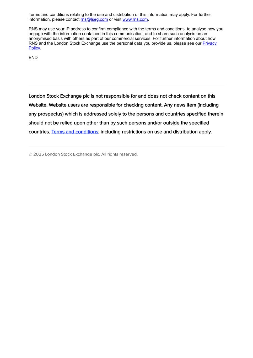 Terms and conditions relating to the use and distribution of this information may apply. For further information, please contact rns@lseg.com or visit www.rns.com. RNS may use your IP address to confirm compliance with the terms and conditions, to analyse how you engage with the information contained in this communication, and to share such analysis on an anonymised basis with others as part of our commercial services. For further information about how RNS and the London Stock Exchange use the personal data you provide us, please see our Privacy Policy. END London Stock Exchange plc is not responsible for and does not check content on this Website. Website users are responsible for checking content. Any news item (including any prospectus) which is addressed solely to the persons and countries specified therein should not be relied upon other than by such persons and/or outside the specified countries. Terms and conditions, including restrictions on use and distribution apply. © 2025 London Stock Exchange plc. All rights reserved.