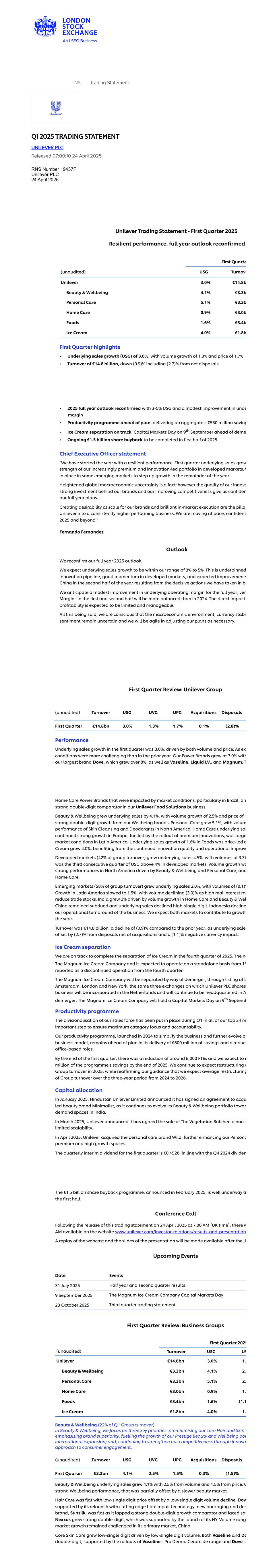 RNS Trading Statement Q1 2025 TRADING STATEMENT UNILEVER PLC Released 07:00:10 24 April 2025 RNS Number : 9437F Unilever PLC 24 April 2025 Unilever Trading Statement - First Quarter 2025 Resilient performance, full year outlook reconfirmed   First Quarte (unaudited) USG Turnove Unilever 3.0% €14.8b Beauty & Wellbeing 4.1% €3.3b Personal Care 5.1% €3.3b Home Care 0.9% €3.0b Foods 1.6% €3.4b Ice Cream 4.0% €1.8b First Quarter highlights •      Underlying sales growth (USG) of 3.0%, with volume growth of 1.3% and price of 1.7% •      Turnover of €14.8 billion, down (0.9)% including (2.7)% from net disposals •      2025 full year outlook reconfirmed with 3-5% USG and a modest improvement in unde margin •      Productivity programme ahead of plan, delivering an aggregate c.€550 million saving •      Ice Cream separation on track, Capital Markets Day on 9th September ahead of deme •      Ongoing €1.5 billion share buyback to be completed in first half of 2025 Chief Executive Officer statement "We have started the year with a resilient performance. First quarter underlying sales grow strength of our increasingly premium and innovation-led portfolio in developed markets. W in place in some emerging markets to step up growth in the remainder of the year. Heightened global macroeconomic uncertainty is a fact; however the quality of our innova strong investment behind our brands and our improving competitiveness give us confiden our full year plans. Creating desirability at scale for our brands and brilliant in-market execution are the pillar Unilever into a consistently higher performing business. We are moving at pace, confident 2025 and beyond." Fernando Fernandez   Outlook We reconfirm our full year 2025 outlook. We expect underlying sales growth to be within our range of 3% to 5%. This is underpinned innovation pipeline, good momentum in developed markets, and expected improvements China in the second half of the year resulting from the decisive actions we have taken in bo We anticipate a modest improvement in underlying operating margin for the full year, vers Margins in the first and second half will be more balanced than in 2024. The direct impact profitability is expected to be limited and manageable. All this being said, we are conscious that the macroeconomic environment, currency stabil sentiment remain uncertain and we will be agile in adjusting our plans as necessary.   First Quarter Review: Unilever Group   (unaudited) Turnover USG UVG UPG Acquisitions Disposals First Quarter €14.8bn 3.0% 1.3% 1.7% 0.1% (2.8)% Performance Underlying sales growth in the first quarter was 3.0%, driven by both volume and price. As exp conditions were more challenging than in the prior year. Our Power Brands grew at 3.0% with our largest brand Dove, which grew over 8%, as well as Vaseline, Liquid I.V., and Magnum. T Home Care Power Brands that were impacted by market conditions, particularly in Brazil, an strong double-digit comparator in our Unilever Food Solutions business. Beauty & Wellbeing grew underlying sales by 4.1%, with volume growth of 2.5% and price of 1 strong double-digit growth from our Wellbeing brands. Personal Care grew 5.1%, with volum performance of Skin Cleansing and Deodorants in North America. Home Care underlying sal continued strong growth in Europe, fuelled by the rollout of premium innovations, was large market conditions in Latin America. Underlying sales growth of 1.6% in Foods was price-led a Cream grew 4.0%, benefiting from the continued innovation quality and operational improve Developed markets (42% of group turnover) grew underlying sales 4.5%, with volumes of 3.3% was the third consecutive quarter of USG above 4% in developed markets. Volume growth wa strong performances in North America driven by Beauty & Wellbeing and Personal Care, and Home Care. Emerging markets (58% of group turnover) grew underlying sales 2.0%, with volumes of (0.1)% Growth in Latin America slowed to 1.5%, with volume declining (3.0)% as high real interest rat reduce trade stocks. India grew 3% driven by volume growth in Home Care and Beauty & Wel China remained subdued and underlying sales declined high-single digit. Indonesia decline our operational turnaround of the business. We expect both markets to contribute to growth the year. Turnover was €14.8 billion, a decline of (0.9)% compared to the prior year, as underlying sales offset by (2.7)% from disposals net of acquisitions and a (1.1)% negative currency impact. Ice Cream separation We are on track to complete the separation of Ice Cream in the fourth quarter of 2025. The ne The Magnum Ice Cream Company and is expected to operate on a standalone basis from 1s reported as a discontinued operation from the fourth quarter. The Magnum Ice Cream Company will be separated by way of demerger, through listing of th Amsterdam, London and New York, the same three exchanges on which Unilever PLC shares business will be incorporated in the Netherlands and will continue to be headquartered in A demerger, The Magnum Ice Cream Company will hold a Capital Markets Day on 9th Septemb Productivity programme The divisionalisation of our sales force has been put in place during Q1 in all of our top 24 m important step to ensure maximum category focus and accountability. Our productivity programme, launched in 2024 to simplify the business and further evolve ou business model, remains ahead of plan in its delivery of €800 million of savings and a reduct office-based roles. By the end of the first quarter, there was a reduction of around 6,000 FTEs and we expect to r million of the programme's savings by the end of 2025. We continue to expect restructuring c Group turnover in 2025, while reaffirming our guidance that we expect average restructuring of Group turnover over the three-year period from 2024 to 2026. Capital allocation In January 2025, Hindustan Unilever Limited announced it has sign