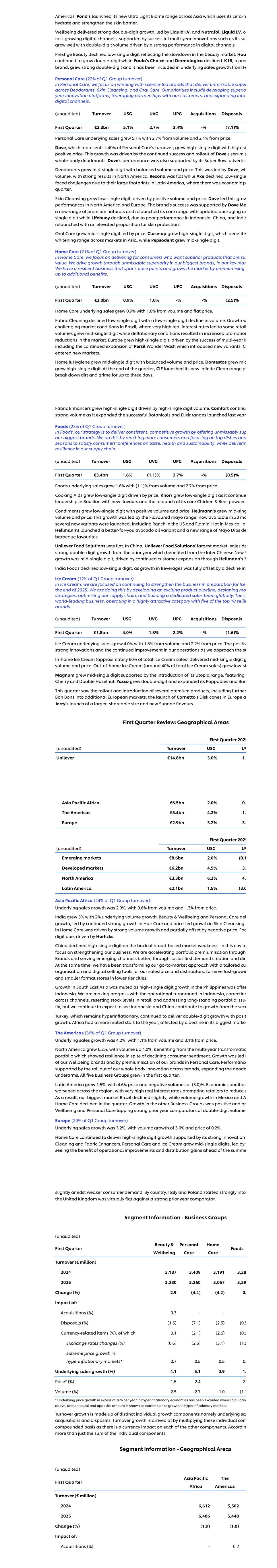 Americas. Pond's launched its new Ultra Light Biome range across Asia which uses its cera-hy hydrate and strengthen the skin barrier. Wellbeing delivered strong double-digit growth, led by Liquid I.V. and Nutrafol. Liquid I.V. co fast-growing digital channels, supported by successful multi-year innovations such as its sug grew well with double-digit volume driven by a strong performance in digital channels. Prestige Beauty declined low-single digit reflecting the slowdown in the beauty market. Hou continued to grow double-digit while Paula's Choice and Dermalogica declined. K18, a prem brand, grew strong double-digit and it has been included in underlying sales growth from Fe Personal Care (22% of Q1 Group turnover) In Personal Care, we focus on winning with science-led brands that deliver unmissable super across Deodorants, Skin Cleansing, and Oral Care. Our priorities include developing superio year innovation platforms, leveraging partnerships with our customers, and expanding into digital channels. (unaudited) Turnover USG UVG UPG Acquisitions Disposals First Quarter €3.3bn 5.1% 2.7% 2.4% -% (7.1)% Personal Care underlying sales grew 5.1% with 2.7% from volume and 2.4% from price. Dove, which represents c.40% of Personal Care's turnover, grew high-single digit with high-si positive price. This growth was driven by the continued success and rollout of Dove's serum s whole-body deodorants. Dove's performance was also supported by its Super Bowl advertisi Deodorants grew mid-single digit with balanced volume and price. This was led by Dove, wh volume, with strong results in North America. Rexona was flat while Axe declined low-single faced challenges due to their large footprints in Latin America, where there was economic pr quarter. Skin Cleansing grew low-single digit, driven by positive volume and price. Dove led this grow performances in North America and Europe. The brand's success was supported by Dove Me a new range of premium naturals and relaunched its core range with updated packaging an single digit while Lifebuoy declined, due to poor performance in Indonesia, China, and India relaunched with an elevated proposition for skin protection. Oral Care grew mid-single digit led by price. Close-up grew high-single digit, which benefited whitening range across markets in Asia, while Pepsodent grew mid-single digit. Home Care (21% of Q1 Group turnover) In Home Care, we focus on delivering for consumers who want superior products that are sus value. We drive growth through unmissable superiority in our biggest brands, in our key mark We have a resilient business that spans price points and grows the market by premiumising a up to additional benefits. (unaudited) Turnover USG UVG UPG Acquisitions Disposals First Quarter €3.0bn 0.9% 1.0% -% -% (2.5)% Home Care underlying sales grew 0.9% with 1.0% from volume and flat price. Fabric Cleaning declined low-single digit with a low-single digit decline in volume. Growth w challenging market conditions in Brazil, where very high real interest rates led to some retail volumes grew mid-single digit while deflationary conditions resulted in increased promotion reductions in the market. Europe grew high-single digit, driven by the success of multi-year in including the continued expansion of Persil Wonder Wash which introduced new variants, Co entered new markets. Home & Hygiene grew mid-single digit with balanced volume and price. Domestos grew mid grew high-single digit. At the end of the quarter, CIF launched its new Infinite Clean range po break down dirt and grime for up to three days. Fabric Enhancers grew high-single digit driven by high-single digit volume. Comfort continue strong volume as it expanded the successful Botanicals and Elixir ranges launched last year. Foods (23% of Q1 Group turnover) In Foods, our strategy is to deliver consistent, competitive growth by offering unmissably sup our biggest brands. We do this by reaching more consumers and focusing on top dishes and seasons to satisfy consumers' preferences on taste, health and sustainability; while deliverin resilience in our supply chain. (unaudited) Turnover USG UVG UPG Acquisitions Disposals First Quarter €3.4bn 1.6% (1.1)% 2.7% -% (0.5)% Foods underlying sales grew 1.6% with (1.1)% from volume and 2.7% from price. Cooking Aids grew low-single digit driven by price. Knorr grew low-single digit as it continue leadership in Bouillon with new flavours and the relaunch of its core Chicken & Beef powder. Condiments grew low-single digit with positive volume and price. Hellmann's grew mid-sing volume and price. This growth was led by the Flavoured mayo range, now available in 30 ma several new variants were launched, including Ranch in the US and Flamin' Hot in Mexico. In Hellmann's launched a better-for-you avocado oil variant and a new range of Mayo Dips de barbeque favourites. Unilever Food Solutions was flat. In China, Unilever Food Solutions' largest market, sales de strong double-digit growth from the prior year which benefited from the later Chinese New Y growth was mid-single digit, driven by continued customer expansion through Hellmann's fo India Foods declined low-single digit, as growth in Beverages was fully offset by a decline in Ice Cream (12% of Q1 Group turnover) In Ice Cream, we are focused on continuing to strengthen the business in preparation for Ice the end of 2025. We are doing this by developing an exciting product pipeline, designing mo strategies, optimising our supply chain, and building a dedicated sales team globally. The se world-leading business, operating in a highly attractive category with five of the top 10 sellin brands. (unaudited) Turnover USG UVG UPG Acquisitions Disposals First Quarter €1.8bn 4.0% 1.8% 2.2% -% (1.6)% Ice Cream underlying sales grew 4.0% with 1.8% from volume and 2.2% from price. The positiv strong innovations and the continued improvement in our operations as we approach the su In-home Ice Cream (approximately 60% o