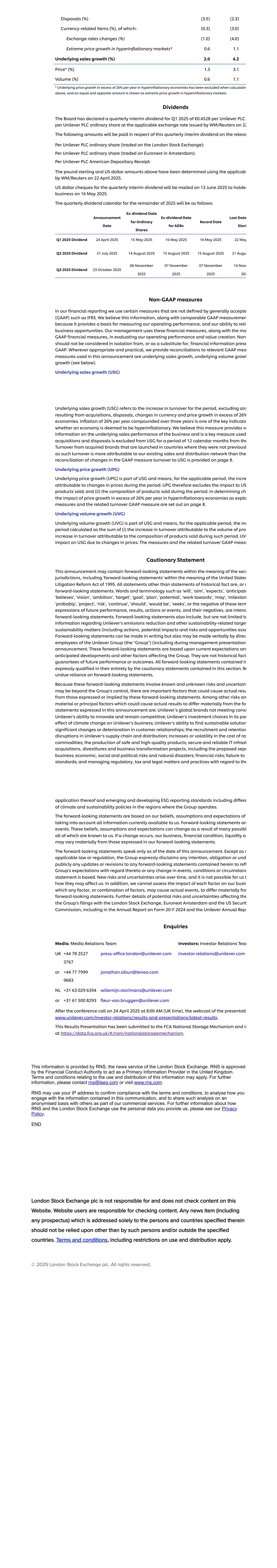 Disposals (%) (3.5) (2.3) Currency-related items (%), of which: (0.3) (3.0) Exchange rates changes (%) (1.0) (4.0) Extreme price growth in hyperinflationary markets* 0.6 1.1 Underlying sales growth (%) 2.0 4.2 Price* (%) 1.3 3.1 Volume (%) 0.6 1.1 * Underlying price growth in excess of 26% per year in hyperinflationary economies has been excluded when calculating above, and an equal and opposite amount is shown as extreme price growth in hyperinflationary markets.   Dividends The Board has declared a quarterly interim dividend for Q1 2025 of €0.4528 per Unilever PLC per Unilever PLC ordinary share at the applicable exchange rate issued by WM/Reuters on 22 The following amounts will be paid in respect of this quarterly interim dividend on the releva Per Unilever PLC ordinary share (traded on the London Stock Exchange): Per Unilever PLC ordinary share (traded on Euronext in Amsterdam): Per Unilever PLC American Depositary Receipt: The pound sterling and US dollar amounts above have been determined using the applicab by WM/Reuters on 22 April 2025. US dollar cheques for the quarterly interim dividend will be mailed on 13 June 2025 to holder business on 16 May 2025. The quarterly dividend calendar for the remainder of 2025 will be as follows: Announcement Date Ex-dividend Date for Ordinary Shares Ex-dividend Date for ADRs Record Date Last Date Elect Q1 2025 Dividend 24 April 2025 15 May 2025 16 May 2025 16 May 2025 22 May Q2 2025 Dividend 31 July 2025 14 August 2025 15 August 2025 15 August 2025 21 Augu Q3 2025 Dividend 23 October 2025 06 November 2025 07 November 2025 07 November 2025 14 Nove 202     Non-GAAP measures In our financial reporting we use certain measures that are not defined by generally accepte (GAAP) such as IFRS. We believe this information, along with comparable GAAP measuremen because it provides a basis for measuring our operating performance, and our ability to retir business opportunities. Our management uses these financial measures, along with the mo GAAP financial measures, in evaluating our operating performance and value creation. Non- should not be considered in isolation from, or as a substitute for, financial information prese GAAP. Wherever appropriate and practical, we provide reconciliations to relevant GAAP mea measures used in this announcement are underlying sales growth, underlying volume growt growth (see below). Underlying sales growth (USG) Underlying sales growth (USG) refers to the increase in turnover for the period, excluding any resulting from acquisitions, disposals, changes in currency and price growth in excess of 26% economies. Inflation of 26% per year compounded over three years is one of the key indicato whether an economy is deemed to be hyperinflationary. We believe this measure provides va information on the underlying sales performance of the business and is a key measure used acquisitions and disposals is excluded from USG for a period of 12 calendar months from the Turnover from acquired brands that are launched in countries where they were not previousl as such turnover is more attributable to our existing sales and distribution network than the reconciliation of changes in the GAAP measure turnover to USG is provided on page 8. Underlying price growth (UPG) Underlying price growth (UPG) is part of USG and means, for the applicable period, the incre attributable to changes in prices during the period. UPG therefore excludes the impact to US products sold; and (ii) the composition of products sold during the period. In determining cha the impact of price growth in excess of 26% per year in hyperinflationary economies as expla measures and the related turnover GAAP measure are set out on page 8. Underlying volume growth (UVG) Underlying volume growth (UVG) is part of USG and means, for the applicable period, the inc period calculated as the sum of (i) the increase in turnover attributable to the volume of prod increase in turnover attributable to the composition of products sold during such period. UVG impact on USG due to changes in prices. The measures and the related turnover GAAP measu   Cautionary Statement This announcement may contain forward-looking statements within the meaning of the secu jurisdictions, including 'forward-looking statements' within the meaning of the United States Litigation Reform Act of 1995. All statements other than statements of historical fact are, or m forward-looking statements. Words and terminology such as 'will', 'aim', 'expects', 'anticipate 'believes', 'vision', 'ambition', 'target', 'goal', 'plan', 'potential', 'work towards', 'may', 'mileston 'probably', 'project', 'risk', 'continue', 'should', 'would be', 'seeks', or the negative of these term expressions of future performance, results, actions or events, and their negatives, are intend forward-looking statements. Forward-looking statements also include, but are not limited to information regarding Unilever's emissions reduction and other sustainability-related target sustainability matters (including actions, potential impacts and risks and opportunities asso Forward-looking statements can be made in writing but also may be made verbally by direc employees of the Unilever Group (the "Group") (including during management presentations announcement. These forward-looking statements are based upon current expectations and anticipated developments and other factors affecting the Group. They are not historical fact guarantees of future performance or outcomes. All forward-looking statements contained in expressly qualified in their entirety by the cautionary statements contained in this section. Re undue reliance on forward-looking statements. Because these forward-looking statements involve known and unknown risks and uncertaint may be beyond the Group's control, there are important factors that could cause actual resu from those expressed or implied by these forward-looking statements. Among other risks an material or principal factors 