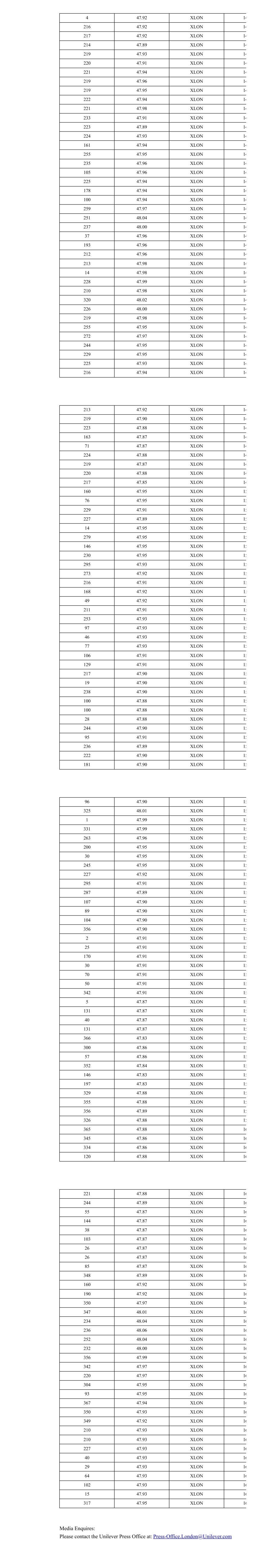 4 47.92 XLON 14 216 47.92 XLON 14 217 47.92 XLON 14 214 47.89 XLON 14 219 47.93 XLON 14 220 47.91 XLON 14 221 47.94 XLON 14 219 47.96 XLON 14 219 47.95 XLON 14 222 47.94 XLON 14 221 47.98 XLON 14 233 47.91 XLON 14 223 47.89 XLON 14 224 47.93 XLON 14 161 47.94 XLON 14 255 47.95 XLON 14 235 47.96 XLON 14 105 47.96 XLON 14 225 47.94 XLON 14 178 47.94 XLON 14 100 47.94 XLON 14 259 47.97 XLON 14 251 48.04 XLON 14 237 48.00 XLON 14 37 47.96 XLON 14 193 47.96 XLON 14 212 47.96 XLON 14 213 47.98 XLON 14 14 47.98 XLON 14 228 47.99 XLON 14 210 47.98 XLON 14 320 48.02 XLON 14 226 48.00 XLON 14 219 47.98 XLON 14 255 47.95 XLON 14 272 47.97 XLON 14 244 47.95 XLON 14 229 47.95 XLON 14 225 47.93 XLON 14 216 47.94 XLON 14 213 47.92 XLON 14 219 47.90 XLON 14 223 47.88 XLON 14 163 47.87 XLON 14 71 47.87 XLON 14 224 47.88 XLON 14 219 47.87 XLON 14 220 47.88 XLON 14 217 47.85 XLON 14 160 47.95 XLON 15 76 47.95 XLON 15 229 47.91 XLON 15 227 47.89 XLON 15 14 47.95 XLON 15 279 47.95 XLON 15 146 47.95 XLON 15 230 47.95 XLON 15 295 47.93 XLON 15 273 47.92 XLON 15 216 47.91 XLON 15 168 47.92 XLON 15 49 47.92 XLON 15 211 47.91 XLON 15 253 47.93 XLON 15 97 47.93 XLON 15 46 47.93 XLON 15 77 47.93 XLON 15 106 47.91 XLON 15 129 47.91 XLON 15 217 47.90 XLON 15 19 47.90 XLON 15 238 47.90 XLON 15 100 47.88 XLON 15 100 47.88 XLON 15 28 47.88 XLON 15 244 47.90 XLON 15 95 47.91 XLON 15 236 47.89 XLON 15 222 47.90 XLON 15 181 47.90 XLON 15 96 47.90 XLON 15 325 48.01 XLON 15 1 47.99 XLON 15 331 47.99 XLON 15 263 47.96 XLON 15 200 47.95 XLON 15 30 47.95 XLON 15 245 47.95 XLON 15 227 47.92 XLON 15 295 47.91 XLON 15 287 47.89 XLON 15 107 47.90 XLON 15 89 47.90 XLON 15 104 47.90 XLON 15 356 47.90 XLON 15 2 47.91 XLON 15 25 47.91 XLON 15 170 47.91 XLON 15 30 47.91 XLON 15 70 47.91 XLON 15 50 47.91 XLON 15 342 47.91 XLON 15 5 47.87 XLON 15 131 47.87 XLON 15 40 47.87 XLON 15 131 47.87 XLON 15 366 47.83 XLON 15 300 47.86 XLON 15 57 47.86 XLON 15 352 47.84 XLON 15 146 47.83 XLON 15 197 47.83 XLON 15 329 47.88 XLON 15 355 47.88 XLON 15 356 47.89 XLON 15 326 47.88 XLON 15 365 47.88 XLON 16 345 47.86 XLON 16 334 47.86 XLON 16 120 47.88 XLON 16 221 47.88 XLON 16 244 47.89 XLON 16 55 47.87 XLON 16 144 47.87 XLON 16 38 47.87 XLON 16 103 47.87 XLON 16 26 47.87 XLON 16 26 47.87 XLON 16 85 47.87 XLON 16 348 47.89 XLON 16 160 47.92 XLON 16 190 47.92 XLON 16 350 47.97 XLON 16 347 48.01 XLON 16 234 48.04 XLON 16 236 48.06 XLON 16 252 48.04 XLON 16 232 48.00 XLON 16 356 47.99 XLON 16 342 47.97 XLON 16 220 47.97 XLON 16 304 47.95 XLON 16 93 47.95 XLON 16 367 47.94 XLON 16 350 47.93 XLON 16 349 47.92 XLON 16 210 47.93 XLON 16 210 47.93 XLON 16 227 47.93 XLON 16 40 47.93 XLON 16 29 47.93 XLON 16 64 47.93 XLON 16 102 47.93 XLON 16 15 47.93 XLON 16 317 47.95 XLON 16 Media Enquires: Please contact the Unilever Press Office at: Press-Office.London@Unilever.com