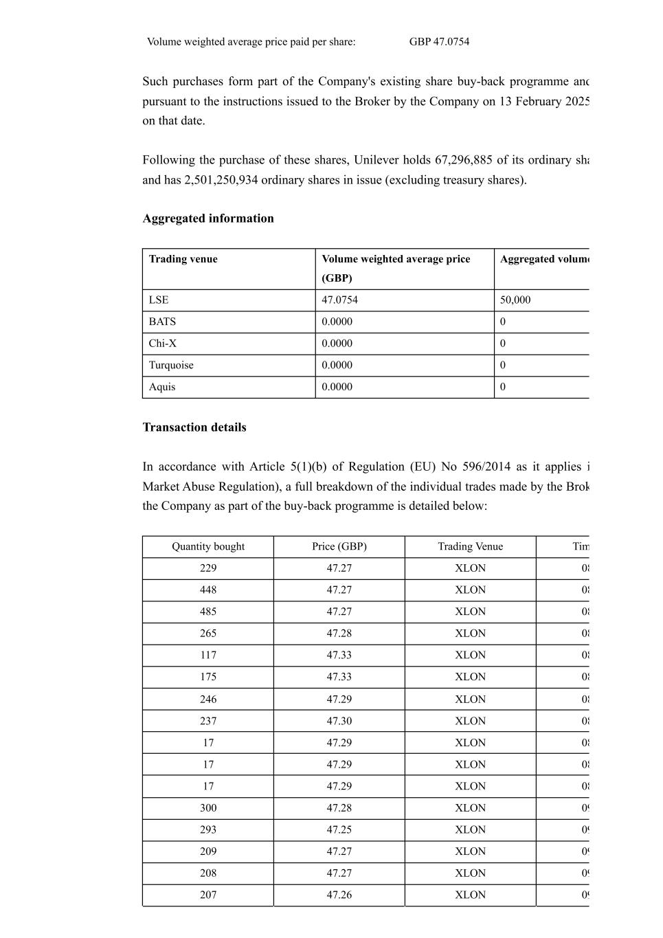 Volume weighted average price paid per share: GBP 47.0754 Such purchases form part of the Company's existing share buy-back programme and pursuant to the instructions issued to the Broker by the Company on 13 February 2025 on that date. Following the purchase of these shares, Unilever holds 67,296,885 of its ordinary sha and has 2,501,250,934 ordinary shares in issue (excluding treasury shares). Aggregated information Trading venue Volume weighted average price (GBP) Aggregated volume LSE 47.0754 50,000 BATS 0.0000 0 Chi-X 0.0000 0 Turquoise 0.0000 0 Aquis 0.0000 0 Transaction details In accordance with Article 5(1)(b) of Regulation (EU) No 596/2014 as it applies i Market Abuse Regulation), a full breakdown of the individual trades made by the Brok the Company as part of the buy-back programme is detailed below: Quantity bought Price (GBP) Trading Venue Tim 229 47.27 XLON 08 448 47.27 XLON 08 485 47.27 XLON 08 265 47.28 XLON 08 117 47.33 XLON 08 175 47.33 XLON 08 246 47.29 XLON 08 237 47.30 XLON 08 17 47.29 XLON 08 17 47.29 XLON 08 17 47.29 XLON 08 300 47.28 XLON 09 293 47.25 XLON 09 209 47.27 XLON 09 208 47.27 XLON 09 207 47.26 XLON 09