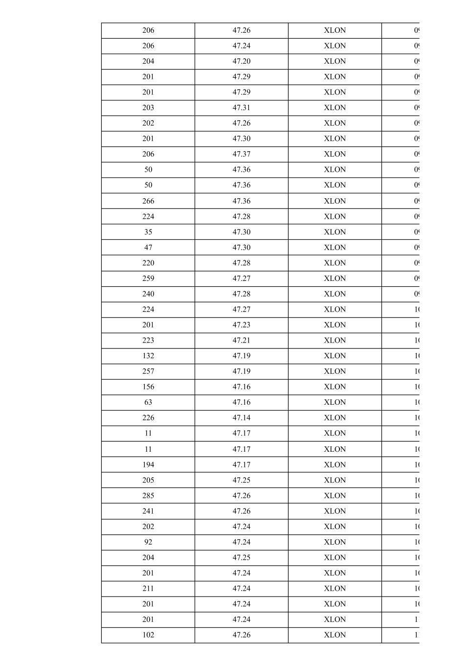 206 47.26 XLON 09 206 47.24 XLON 09 204 47.20 XLON 09 201 47.29 XLON 09 201 47.29 XLON 09 203 47.31 XLON 09 202 47.26 XLON 09 201 47.30 XLON 09 206 47.37 XLON 09 50 47.36 XLON 09 50 47.36 XLON 09 266 47.36 XLON 09 224 47.28 XLON 09 35 47.30 XLON 09 47 47.30 XLON 09 220 47.28 XLON 09 259 47.27 XLON 09 240 47.28 XLON 09 224 47.27 XLON 10 201 47.23 XLON 10 223 47.21 XLON 10 132 47.19 XLON 10 257 47.19 XLON 10 156 47.16 XLON 10 63 47.16 XLON 10 226 47.14 XLON 10 11 47.17 XLON 10 11 47.17 XLON 10 194 47.17 XLON 10 205 47.25 XLON 10 285 47.26 XLON 10 241 47.26 XLON 10 202 47.24 XLON 10 92 47.24 XLON 10 204 47.25 XLON 10 201 47.24 XLON 10 211 47.24 XLON 10 201 47.24 XLON 10 201 47.24 XLON 11 102 47.26 XLON 11