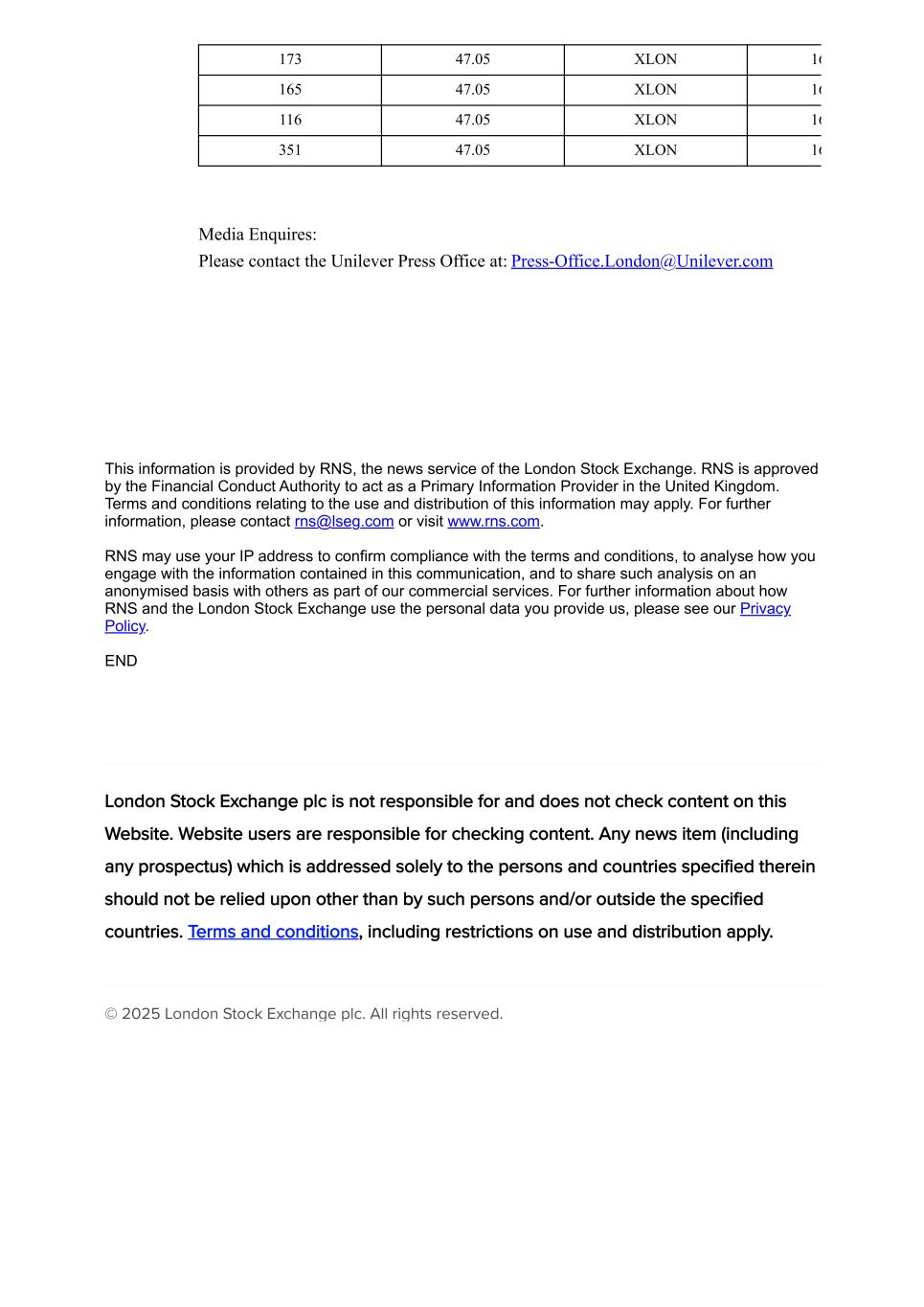 173 47.05 XLON 16 165 47.05 XLON 16 116 47.05 XLON 16 351 47.05 XLON 16 Media Enquires: Please contact the Unilever Press Office at: Press-Office.London@Unilever.com This information is provided by RNS, the news service of the London Stock Exchange. RNS is approved by the Financial Conduct Authority to act as a Primary Information Provider in the United Kingdom. Terms and conditions relating to the use and distribution of this information may apply. For further information, please contact rns@lseg.com or visit www.rns.com. RNS may use your IP address to confirm compliance with the terms and conditions, to analyse how you engage with the information contained in this communication, and to share such analysis on an anonymised basis with others as part of our commercial services. For further information about how RNS and the London Stock Exchange use the personal data you provide us, please see our Privacy Policy. END London Stock Exchange plc is not responsible for and does not check content on this Website. Website users are responsible for checking content. Any news item (including any prospectus) which is addressed solely to the persons and countries specified therein should not be relied upon other than by such persons and/or outside the specified countries. Terms and conditions, including restrictions on use and distribution apply. © 2025 London Stock Exchange plc. All rights reserved.