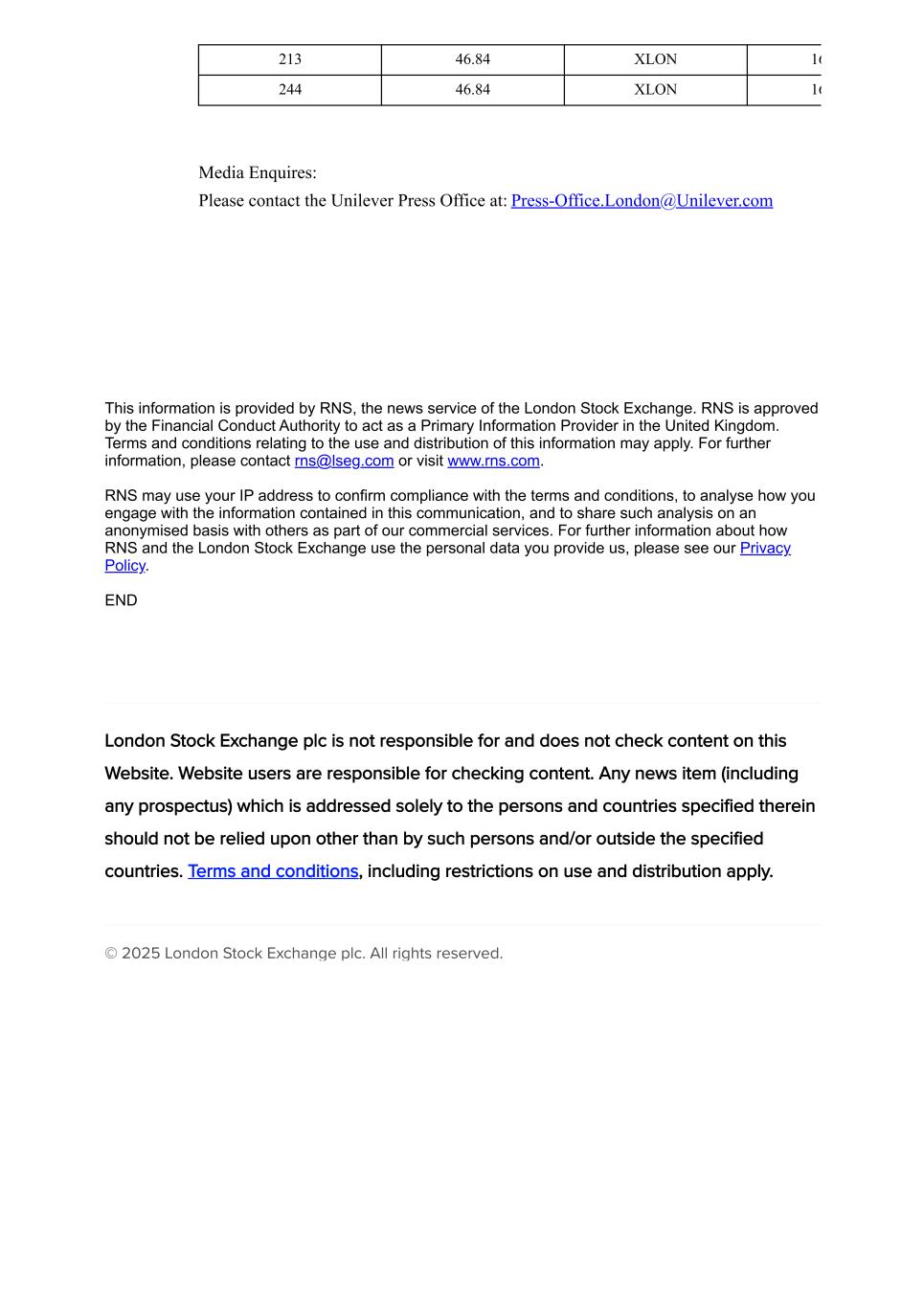 213 46.84 XLON 16 244 46.84 XLON 16 Media Enquires: Please contact the Unilever Press Office at: Press-Office.London@Unilever.com This information is provided by RNS, the news service of the London Stock Exchange. RNS is approved by the Financial Conduct Authority to act as a Primary Information Provider in the United Kingdom. Terms and conditions relating to the use and distribution of this information may apply. For further information, please contact rns@lseg.com or visit www.rns.com. RNS may use your IP address to confirm compliance with the terms and conditions, to analyse how you engage with the information contained in this communication, and to share such analysis on an anonymised basis with others as part of our commercial services. For further information about how RNS and the London Stock Exchange use the personal data you provide us, please see our Privacy Policy. END London Stock Exchange plc is not responsible for and does not check content on this Website. Website users are responsible for checking content. Any news item (including any prospectus) which is addressed solely to the persons and countries specified therein should not be relied upon other than by such persons and/or outside the specified countries. Terms and conditions, including restrictions on use and distribution apply. © 2025 London Stock Exchange plc. All rights reserved.