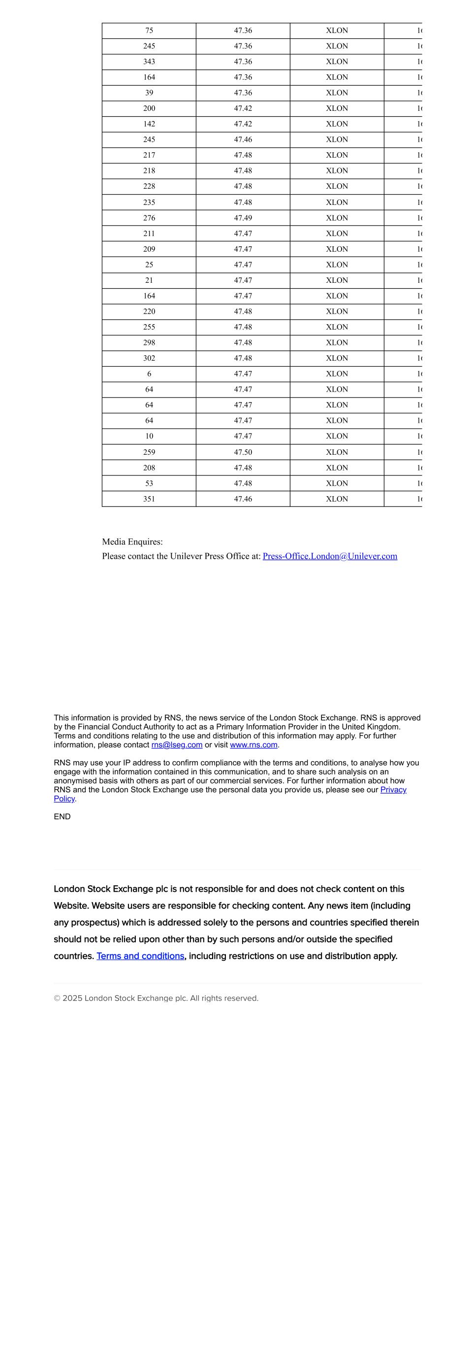 75 47.36 XLON 16 245 47.36 XLON 16 343 47.36 XLON 16 164 47.36 XLON 16 39 47.36 XLON 16 200 47.42 XLON 16 142 47.42 XLON 16 245 47.46 XLON 16 217 47.48 XLON 16 218 47.48 XLON 16 228 47.48 XLON 16 235 47.48 XLON 16 276 47.49 XLON 16 211 47.47 XLON 16 209 47.47 XLON 16 25 47.47 XLON 16 21 47.47 XLON 16 164 47.47 XLON 16 220 47.48 XLON 16 255 47.48 XLON 16 298 47.48 XLON 16 302 47.48 XLON 16 6 47.47 XLON 16 64 47.47 XLON 16 64 47.47 XLON 16 64 47.47 XLON 16 10 47.47 XLON 16 259 47.50 XLON 16 208 47.48 XLON 16 53 47.48 XLON 16 351 47.46 XLON 16 Media Enquires: Please contact the Unilever Press Office at: Press-Office.London@Unilever.com This information is provided by RNS, the news service of the London Stock Exchange. RNS is approved by the Financial Conduct Authority to act as a Primary Information Provider in the United Kingdom. Terms and conditions relating to the use and distribution of this information may apply. For further information, please contact rns@lseg.com or visit www.rns.com. RNS may use your IP address to confirm compliance with the terms and conditions, to analyse how you engage with the information contained in this communication, and to share such analysis on an anonymised basis with others as part of our commercial services. For further information about how RNS and the London Stock Exchange use the personal data you provide us, please see our Privacy Policy. END London Stock Exchange plc is not responsible for and does not check content on this Website. Website users are responsible for checking content. Any news item (including any prospectus) which is addressed solely to the persons and countries specified therein should not be relied upon other than by such persons and/or outside the specified countries. Terms and conditions, including restrictions on use and distribution apply. © 2025 London Stock Exchange plc. All rights reserved.