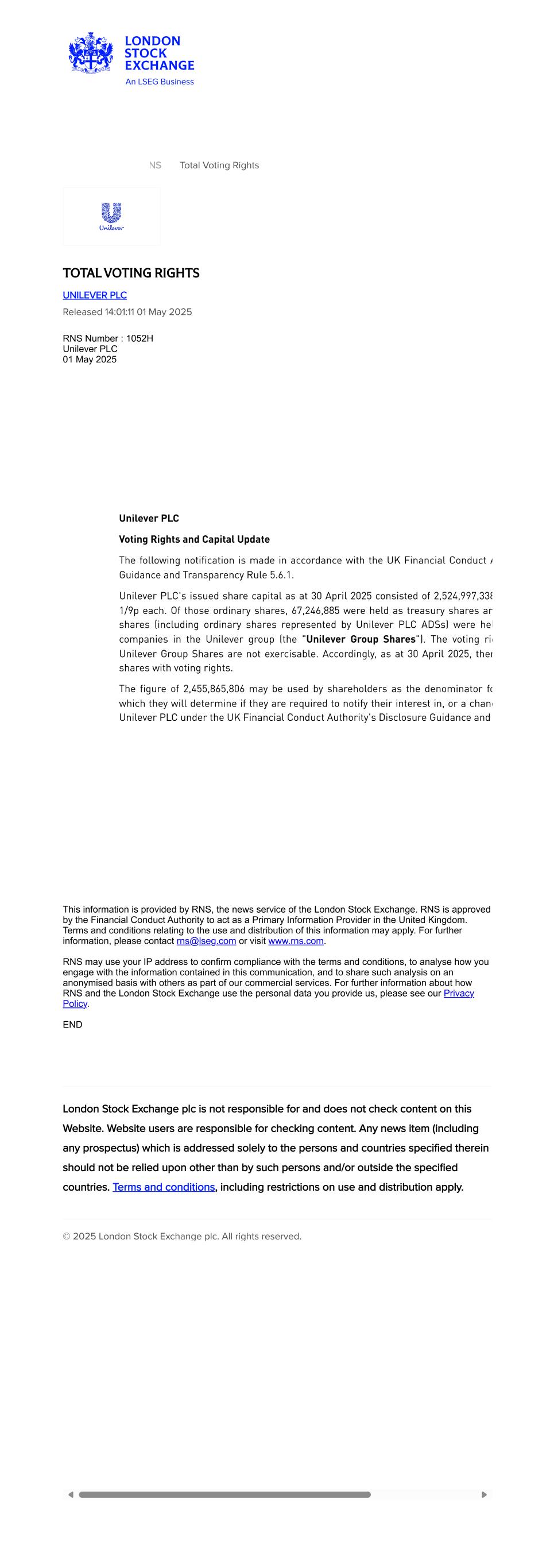 RNS Total Voting Rights TOTAL VOTING RIGHTS UNILEVER PLC Released 14:01:11 01 May 2025 RNS Number : 1052H Unilever PLC 01 May 2025     Unilever PLC Voting Rights and Capital Update The following notification is made in accordance with the UK Financial Conduct A Guidance and Transparency Rule 5.6.1. Unilever PLC's issued share capital as at 30 April 2025 consisted of 2,524,997,338 1/9p each. Of those ordinary shares, 67,246,885 were held as treasury shares an shares (including ordinary shares represented by Unilever PLC ADSs) were hel companies in the Unilever group (the "Unilever Group Shares"). The voting rig Unilever Group Shares are not exercisable. Accordingly, as at 30 April 2025, ther shares with voting rights. The figure of 2,455,865,806 may be used by shareholders as the denominator fo which they will determine if they are required to notify their interest in, or a chang Unilever PLC under the UK Financial Conduct Authority's Disclosure Guidance and     This information is provided by RNS, the news service of the London Stock Exchange. RNS is approved by the Financial Conduct Authority to act as a Primary Information Provider in the United Kingdom. Terms and conditions relating to the use and distribution of this information may apply. For further information, please contact rns@lseg.com or visit www.rns.com. RNS may use your IP address to confirm compliance with the terms and conditions, to analyse how you engage with the information contained in this communication, and to share such analysis on an anonymised basis with others as part of our commercial services. For further information about how RNS and the London Stock Exchange use the personal data you provide us, please see our Privacy Policy. END London Stock Exchange plc is not responsible for and does not check content on this Website. Website users are responsible for checking content. Any news item (including any prospectus) which is addressed solely to the persons and countries specified therein should not be relied upon other than by such persons and/or outside the specified countries. Terms and conditions, including restrictions on use and distribution apply. © 2025 London Stock Exchange plc. All rights reserved.