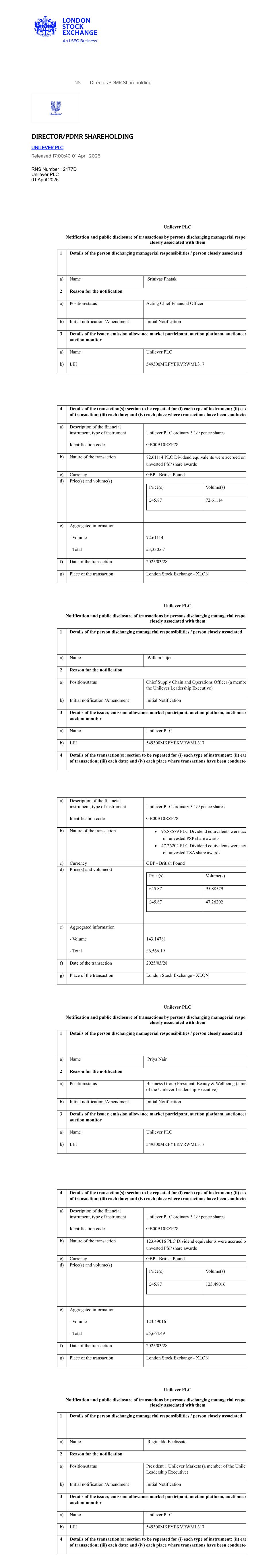 RNS Director/PDMR Shareholding DIRECTOR/PDMR SHAREHOLDING UNILEVER PLC Released 17:00:40 01 April 2025 RNS Number : 2177D Unilever PLC 01 April 2025 Unilever PLC Notification and public disclosure of transactions by persons discharging managerial respon closely associated with them 1 Details of the person discharging managerial responsibilities / person closely associated a) Name Srinivas Phatak 2 Reason for the notification a) Position/status Acting Chief Financial Officer b) Initial notification /Amendment Initial Notification 3 Details of the issuer, emission allowance market participant, auction platform, auctioneer auction monitor a) Name Unilever PLC b) LEI 549300MKFYEKVRWML317 4 Details of the transaction(s): section to be repeated for (i) each type of instrument; (ii) eac of transaction; (iii) each date; and (iv) each place where transactions have been conducted a) Description of the financial instrument, type of instrument Identification code Unilever PLC ordinary 3 1/9 pence shares GB00B10RZP78 b) Nature of the transaction 72.61114 PLC Dividend equivalents were accrued on unvested PSP share awards c) Currency GBP - British Pound d) Price(s) and volume(s) Price(s) Volume(s) £45.87 72.61114 e) Aggregated information - Volume - Total 72.61114 £3,330.67 f) Date of the transaction 2025/03/28 g) Place of the transaction London Stock Exchange - XLON Unilever PLC Notification and public disclosure of transactions by persons discharging managerial respon closely associated with them 1 Details of the person discharging managerial responsibilities / person closely associated a) Name Willem Uijen 2 Reason for the notification a) Position/status Chief Supply Chain and Operations Officer (a membe the Unilever Leadership Executive) b) Initial notification /Amendment Initial Notification 3 Details of the issuer, emission allowance market participant, auction platform, auctioneer auction monitor a) Name Unilever PLC b) LEI 549300MKFYEKVRWML317 4 Details of the transaction(s): section to be repeated for (i) each type of instrument; (ii) eac of transaction; (iii) each date; and (iv) each place where transactions have been conducted a) Description of the financial instrument, type of instrument Identification code Unilever PLC ordinary 3 1/9 pence shares GB00B10RZP78 b) Nature of the transaction · 95.88579 PLC Dividend equivalents were acc on unvested PSP share awards · 47.26202 PLC Dividend equivalents were acc on unvested TSA share awards c) Currency GBP - British Pound d) Price(s) and volume(s) Price(s) Volume(s) £45.87 95.88579 £45.87 47.26202 e) Aggregated information - Volume - Total 143.14781 £6,566.19 f) Date of the transaction 2025/03/28 g) Place of the transaction London Stock Exchange - XLON Unilever PLC Notification and public disclosure of transactions by persons discharging managerial respon closely associated with them 1 Details of the person discharging managerial responsibilities / person closely associated a) Name Priya Nair 2 Reason for the notification a) Position/status Business Group President, Beauty & Wellbeing (a me of the Unilever Leadership Executive) b) Initial notification /Amendment Initial Notification 3 Details of the issuer, emission allowance market participant, auction platform, auctioneer auction monitor a) Name Unilever PLC b) LEI 549300MKFYEKVRWML317 4 Details of the transaction(s): section to be repeated for (i) each type of instrument; (ii) eac of transaction; (iii) each date; and (iv) each place where transactions have been conducted a) Description of the financial instrument, type of instrument Identification code Unilever PLC ordinary 3 1/9 pence shares GB00B10RZP78 b) Nature of the transaction 123.49016 PLC Dividend equivalents were accrued on unvested PSP share awards c) Currency GBP - British Pound d) Price(s) and volume(s) Price(s) Volume(s) £45.87 123.49016 e) Aggregated information - Volume - Total 123.49016 £5,664.49 f) Date of the transaction 2025/03/28 g) Place of the transaction London Stock Exchange - XLON Unilever PLC Notification and public disclosure of transactions by persons discharging managerial respon closely associated with them 1 Details of the person discharging managerial responsibilities / person closely associated a) Name Reginaldo Ecclissato 2 Reason for the notification a) Position/status President 1 Unilever Markets (a member of the Unilev Leadership Executive) b) Initial notification /Amendment Initial Notification 3 Details of the issuer, emission allowance market participant, auction platform, auctioneer auction monitor a) Name Unilever PLC b) LEI 549300MKFYEKVRWML317 4 Details of the transaction(s): section to be repeated for (i) each type of instrument; (ii) eac of transaction; (iii) each date; and (iv) each place where transactions have been conducted